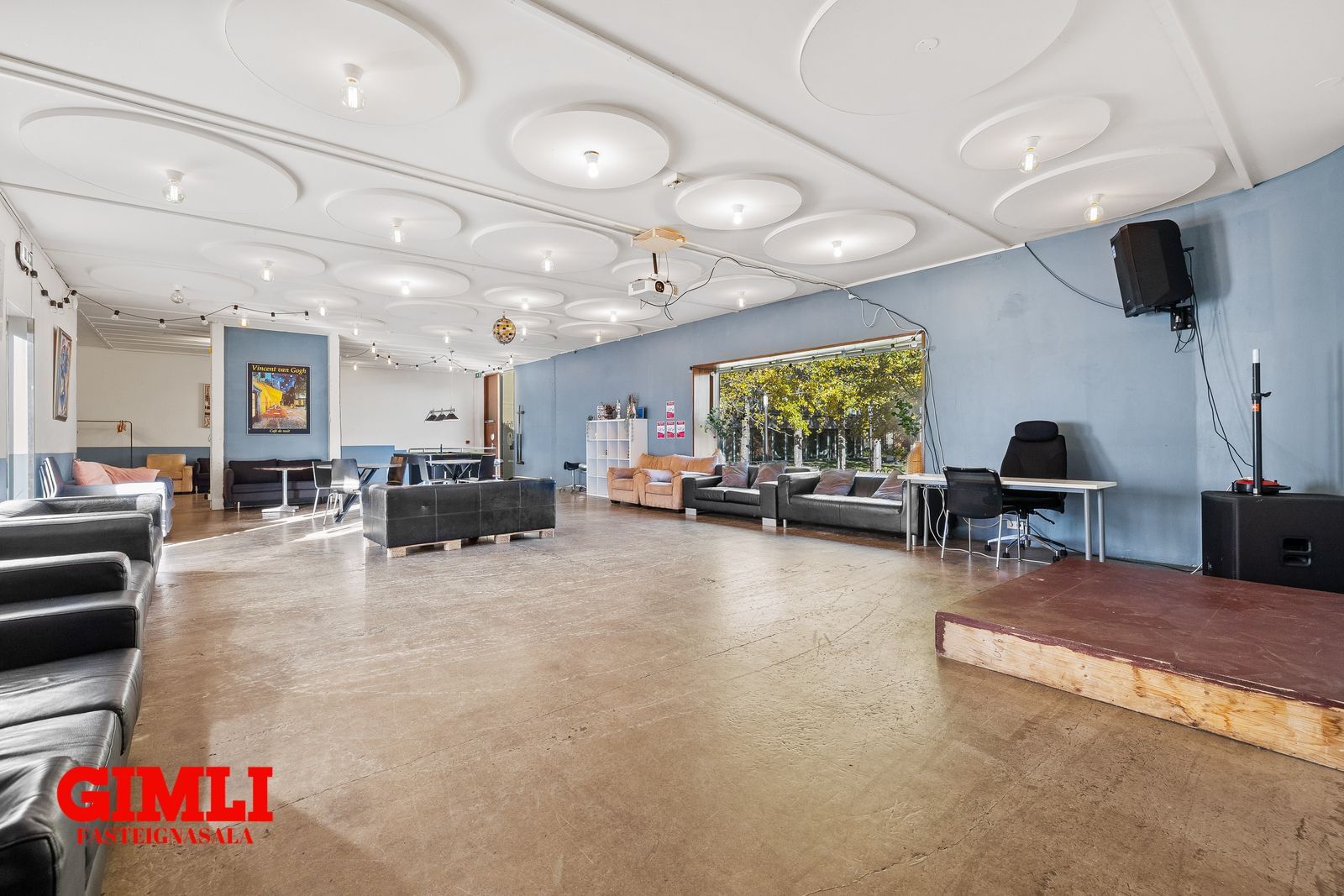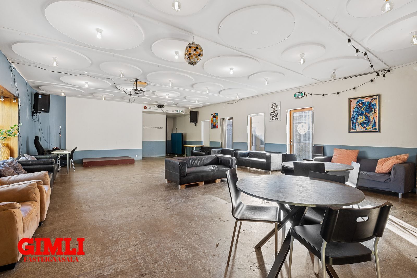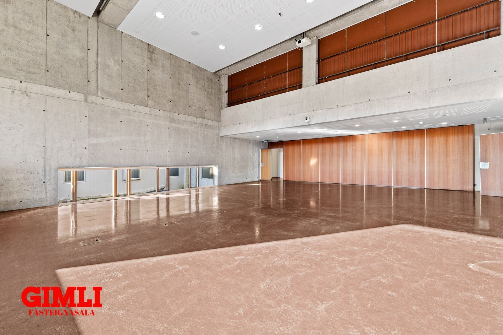 Efri hæð. Salur sem bæði er hægt að skipta upp í tvennt eða opna inn í önnur rými með hreyfanlegum renniflekaveggjum. Skrifstofur, snyrtingar, matsalur og tvö ágætis rými með þakgluggum