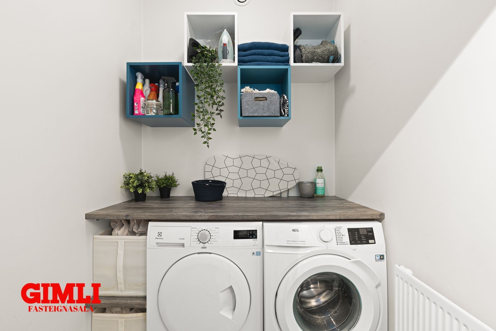 Þvottahús: Flísalagt gólf, þvottavél og þurrkari undir borði.