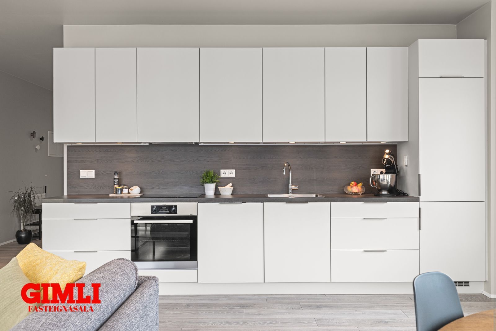 Alrými: Alrými er sérlega bjart með gluggum sem vísa til 3ja átta. Í eldhúsi er hvít, stílhrein eldhússinnrétting, innbyggður ísskápur og uppþvottavél, spanhelluborð og ofn með sjálfhreinsibúnaði. Auðvelt er að bæta við léttri eyju en eldhúsið er opið að