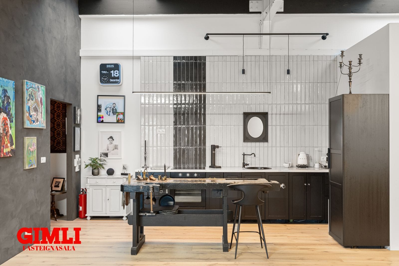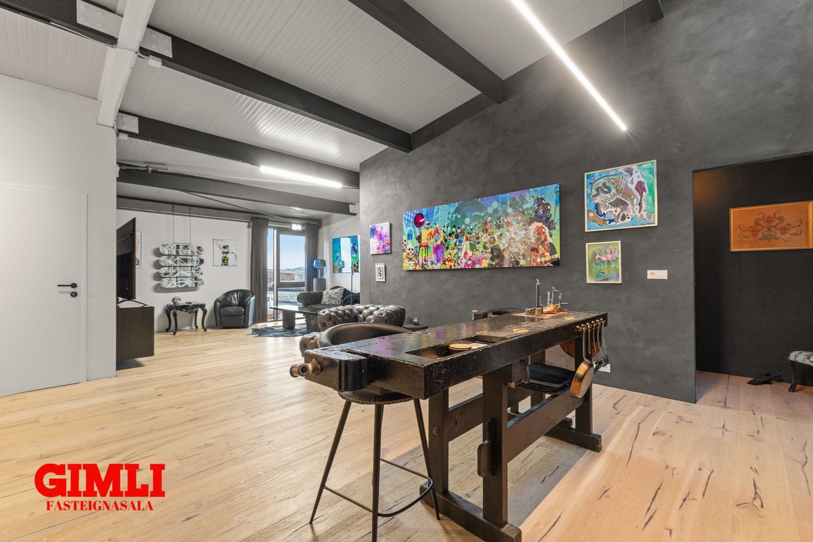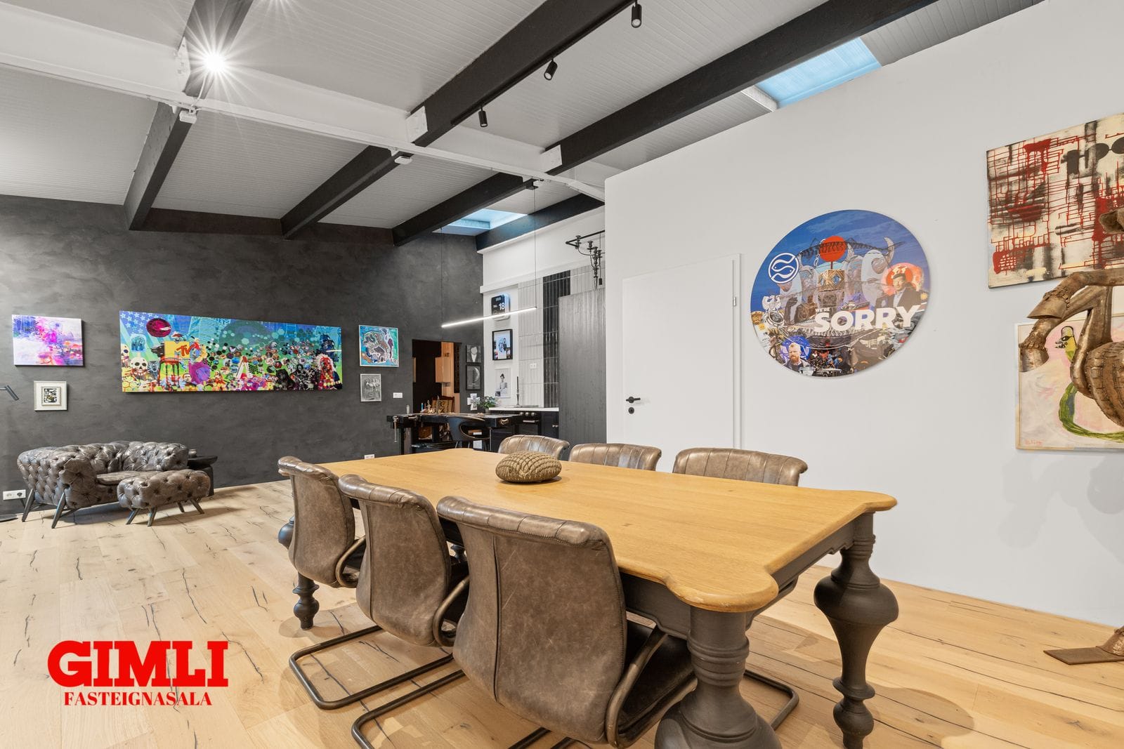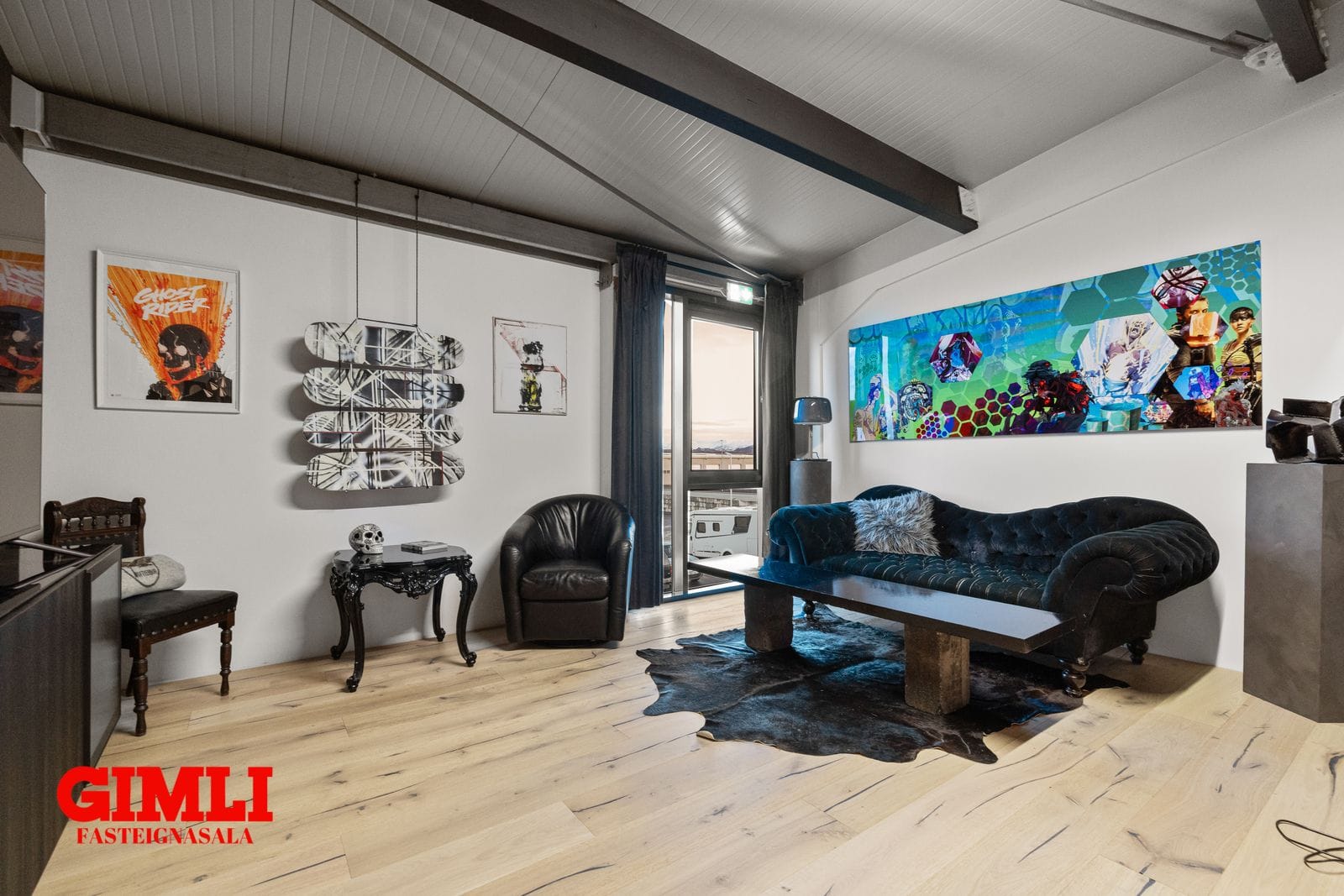 Smelltu hér til að sjá myndband af eigninniNÁNARI LÝSING:Efri hæð: Alrými; Eldhús/Stofa/Borðstofa: Falleg svört eldhúsinnrétting með ljósri borðplötu. Innbyggð uppþvottavél, bakaraofn og span-helluborð. Veggur við innréttingu flísalagður. Nýlegt (ca. 6 mán.) harðparket úr Parka (oak invisible) á gólfum. Svört kalkmálning frá sérefni á stökum veggjum, svartar ljósabrautir og kastarar frá Pfaff.