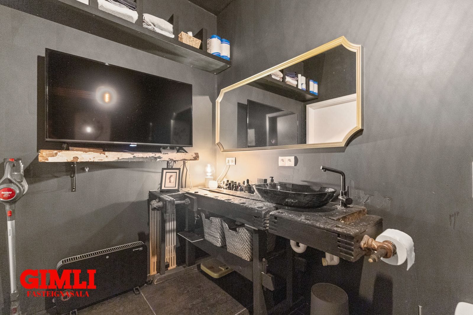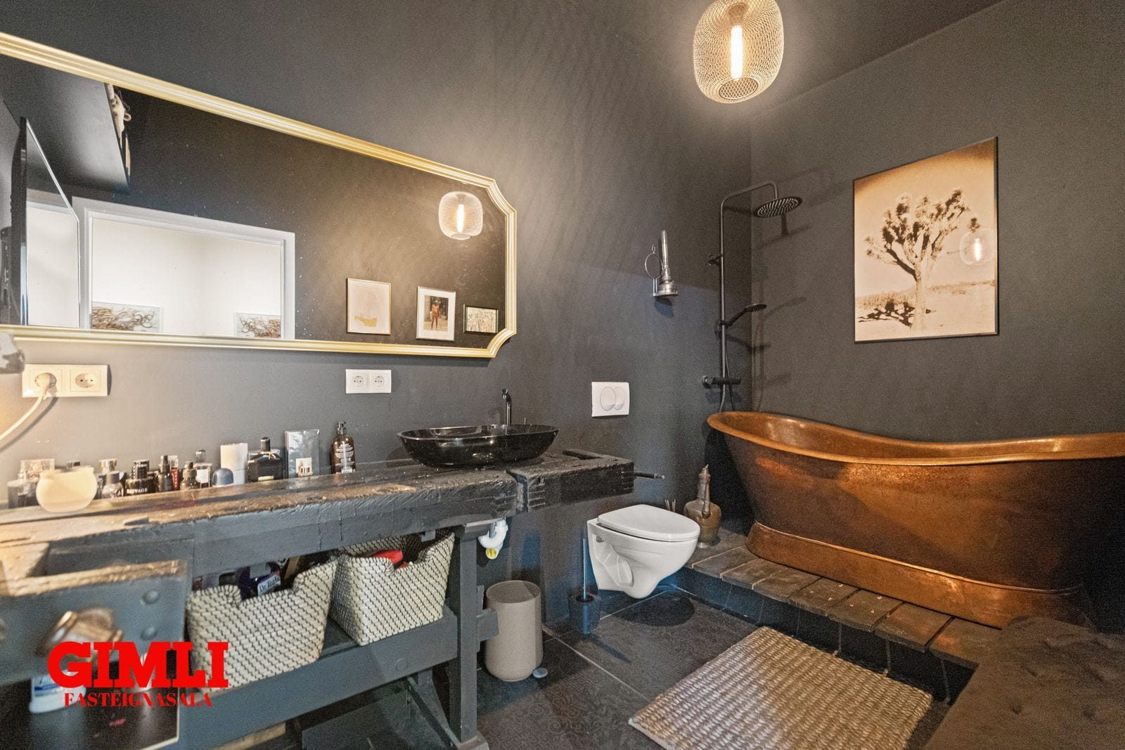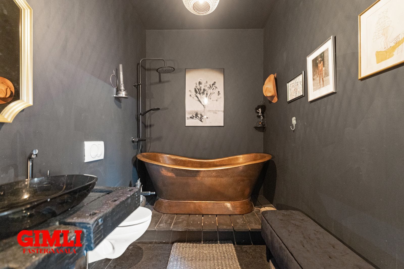 Baðherbergi: Versace flísar frá Flísabúðinni á baðgólfi (veggflísar frá Versace geta fylgt með). Koparbaðkar (innflutt frá Marokkó) með sturtutækjum. Baðinnrétting (hefilbekkur) með svartri glerhandlaug.