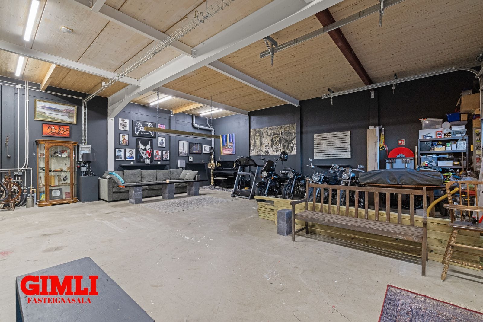 Neðri hæð: Opið rými sem hentar vel fyrir alls kyns atvinnustarfssemi og/eða áhugamál. Við inngang er stigi upp á 2.hæð og búið er að útbúa rými undir stiganum fyrir snyrtingu með salerni og handlaug. Þvottaaðstaða. Gólfhiti á allri neðri hæðinni.