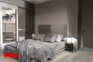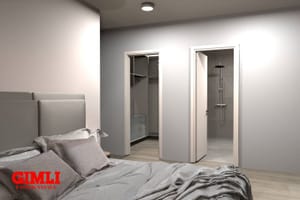 Baðherbergi með flísalagðri "walk in" sturtu með glerþili. Vegghengt salerni, sérsmíðuð innrétting með Dekton steini frá REIN á borði og speglaskápur. Ljósar 60x60 flísar á gólfi og sturtu. Handklæðaofn. Parket á gólfi í hjónaherbergi og fataherbergi.