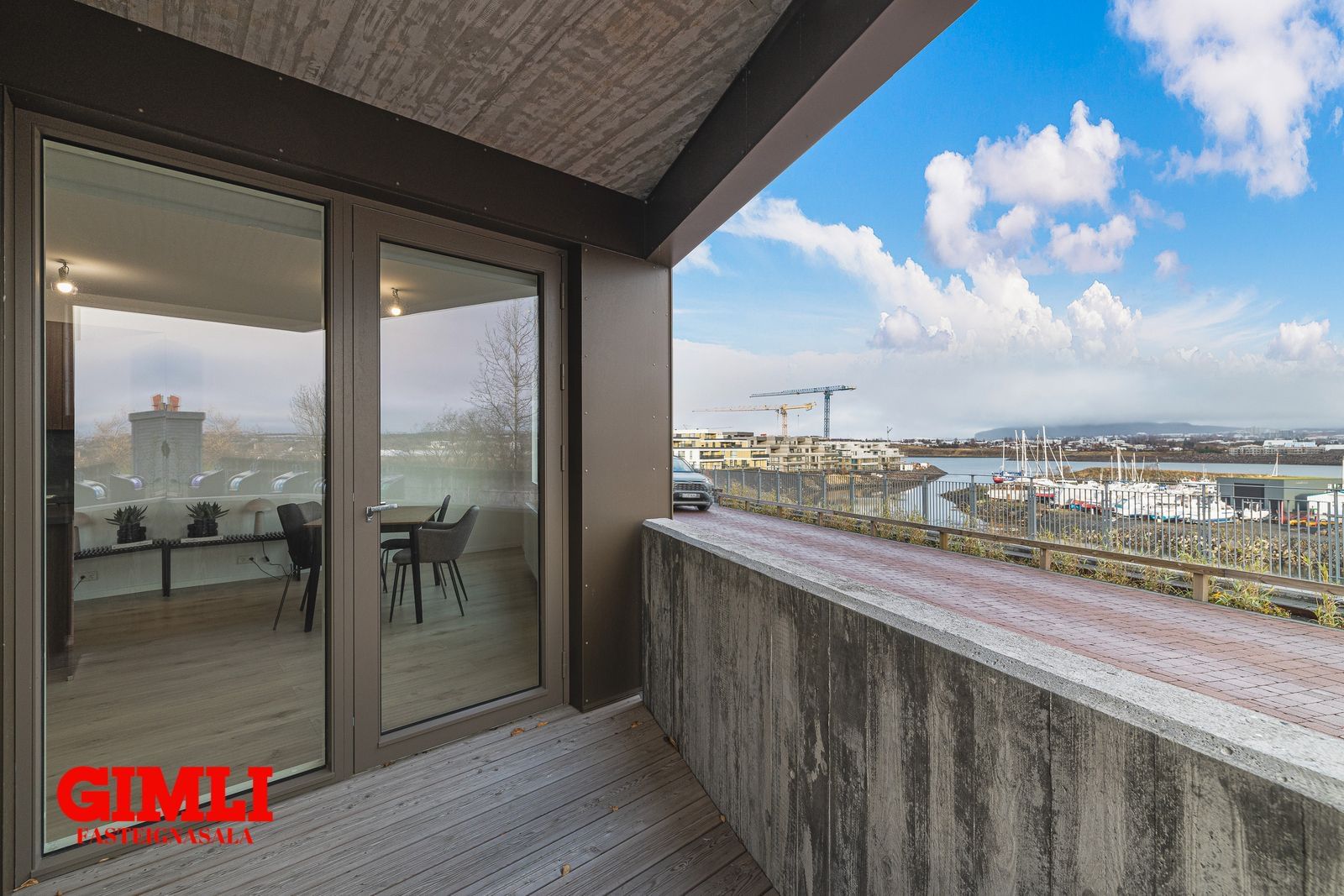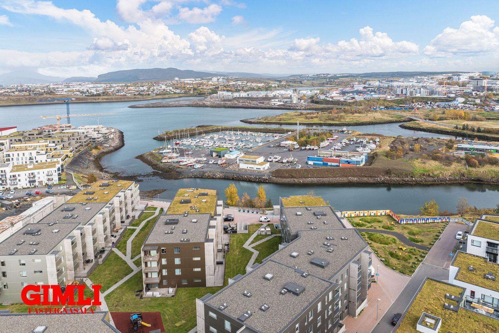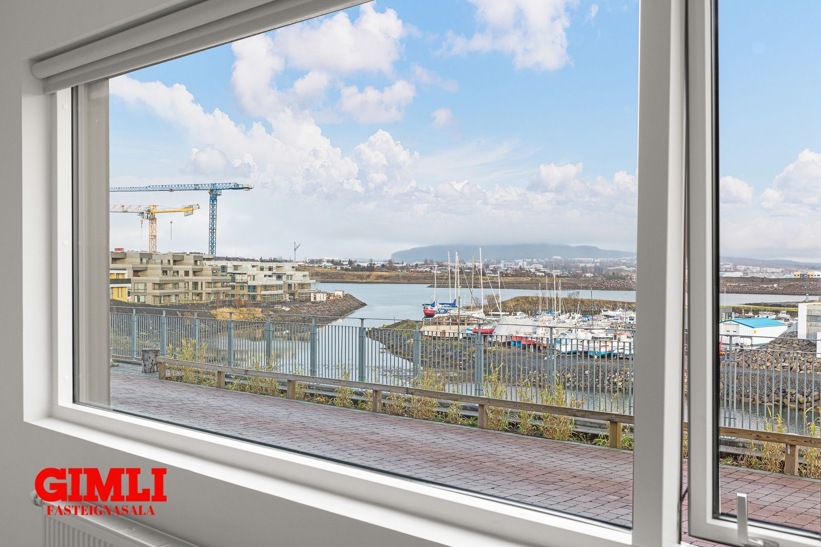 útsýni yfir smábátahöfnina hjá Snarfara og út á Elliðaárvoginn. Íbúðin er á fyrstu hæð og er