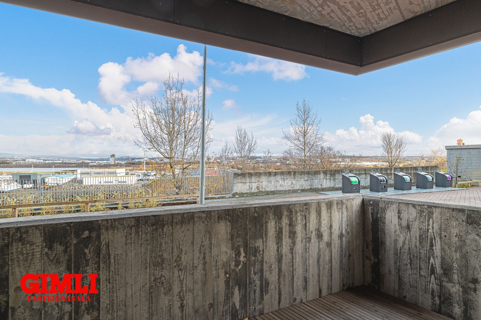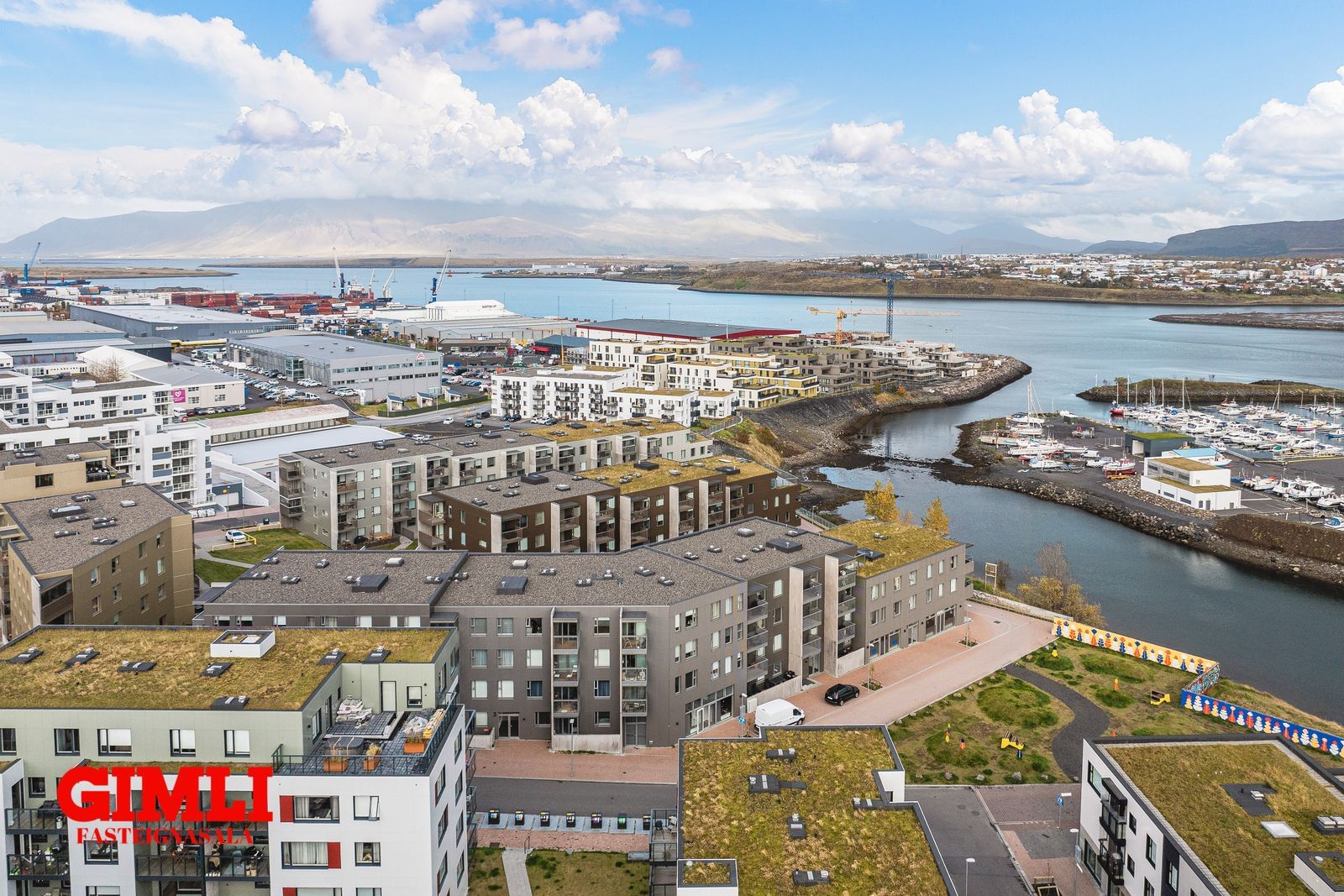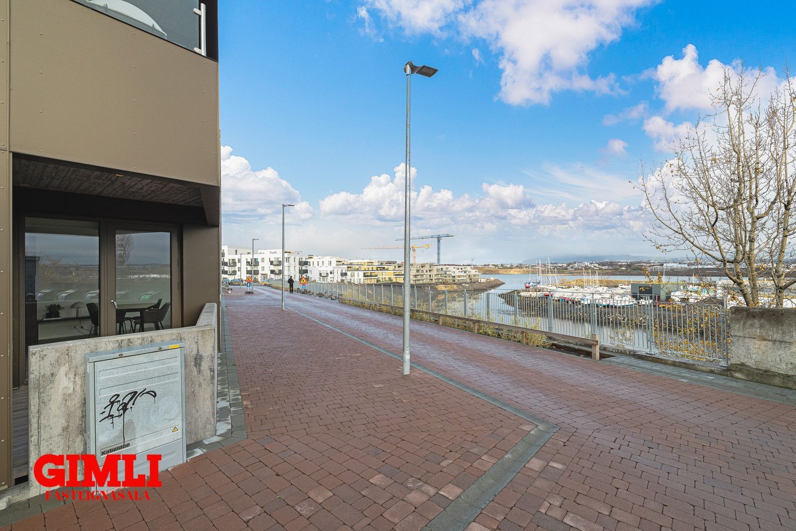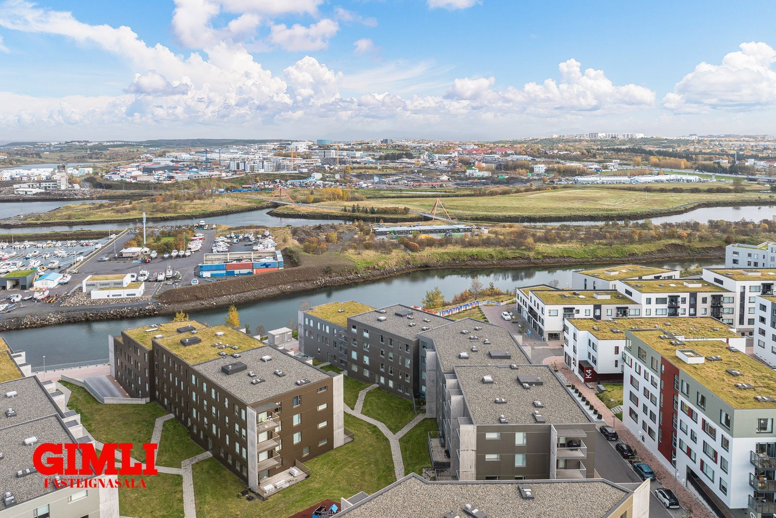 útsýni yfir smábátahöfnina hjá Snarfara og út á Elliðaárvoginn. Íbúðin er á fyrstu hæð og er