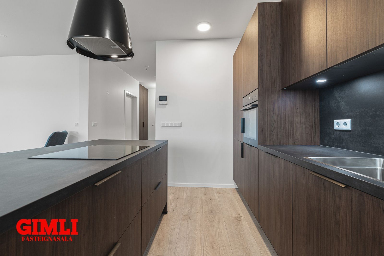 Eldhús myndar fallegt alrými með stofu og borðstofu. Í eldhúsi eru dökkar viðarinnréttingar frá Nobilia. og tæki frá Electrolux þ.m.t. innbyggður kæliskápur og uppþvottavél, blástursofn, eyja með spansuðu helluborði og lofthengdur háfur. Úr stofu og borðstofu er frábært útsýni yfir smábátahöfnina og út á Elliðaárvog. Úr alrýminu er gengið út á