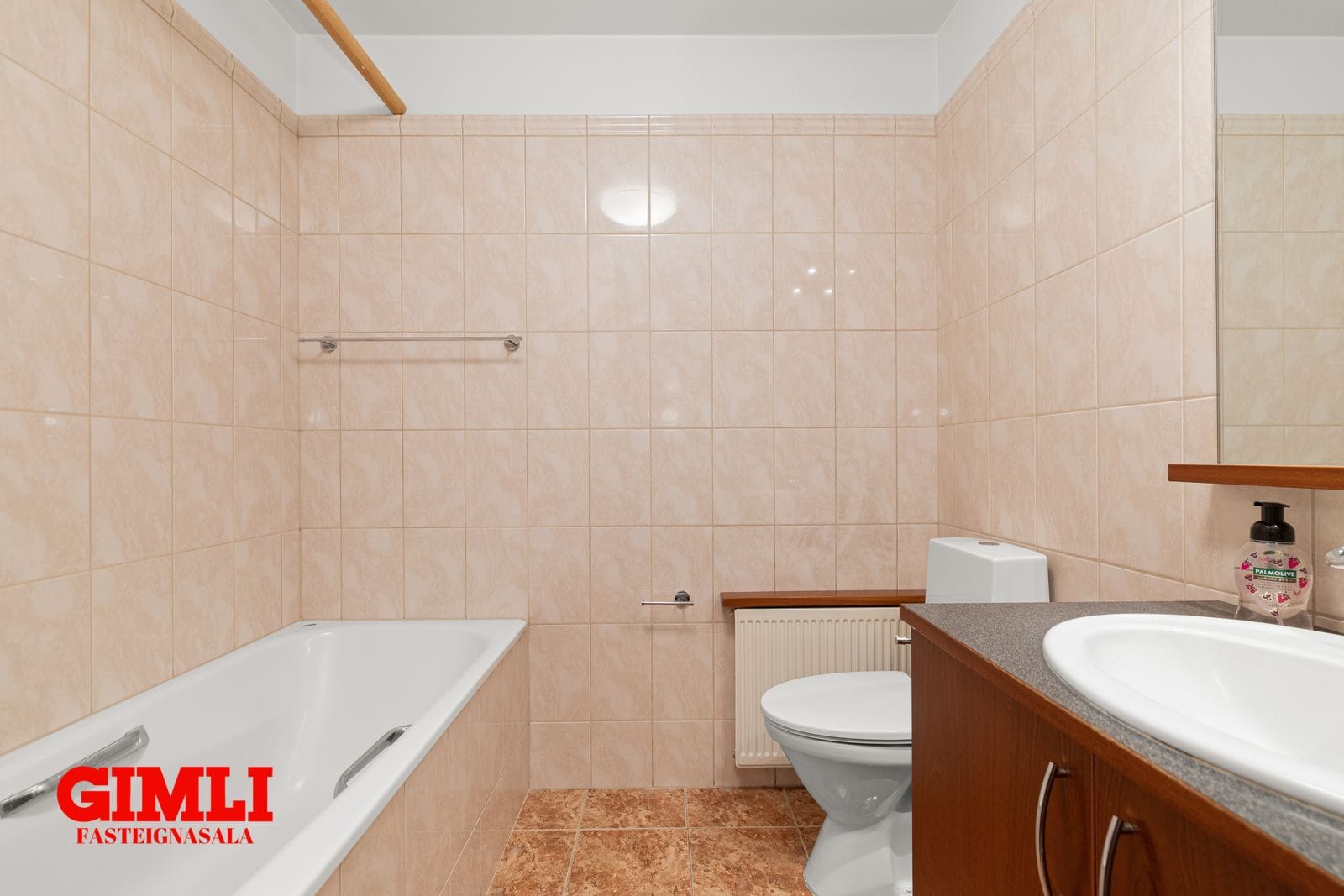 Baðherbergi: Flísalagt með baðkari og sturtuklefa, fallegri innréttingu með góðu skápaplássi.