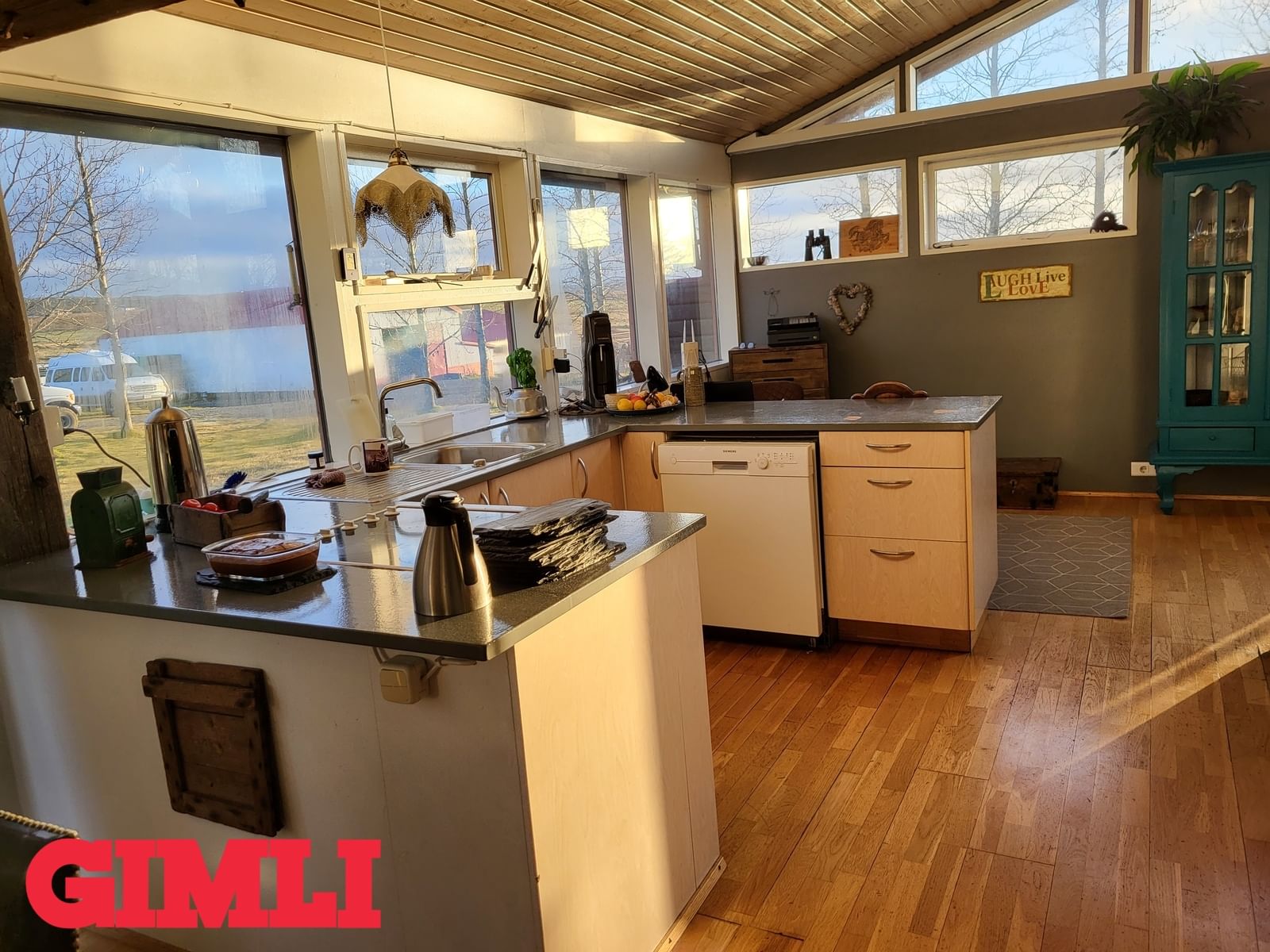 Eldhús: Ljós U-laga eldhúsinnrétting með grárri borðplötu. Mjög bjart með miklum gluggum. Parket á gólfi.