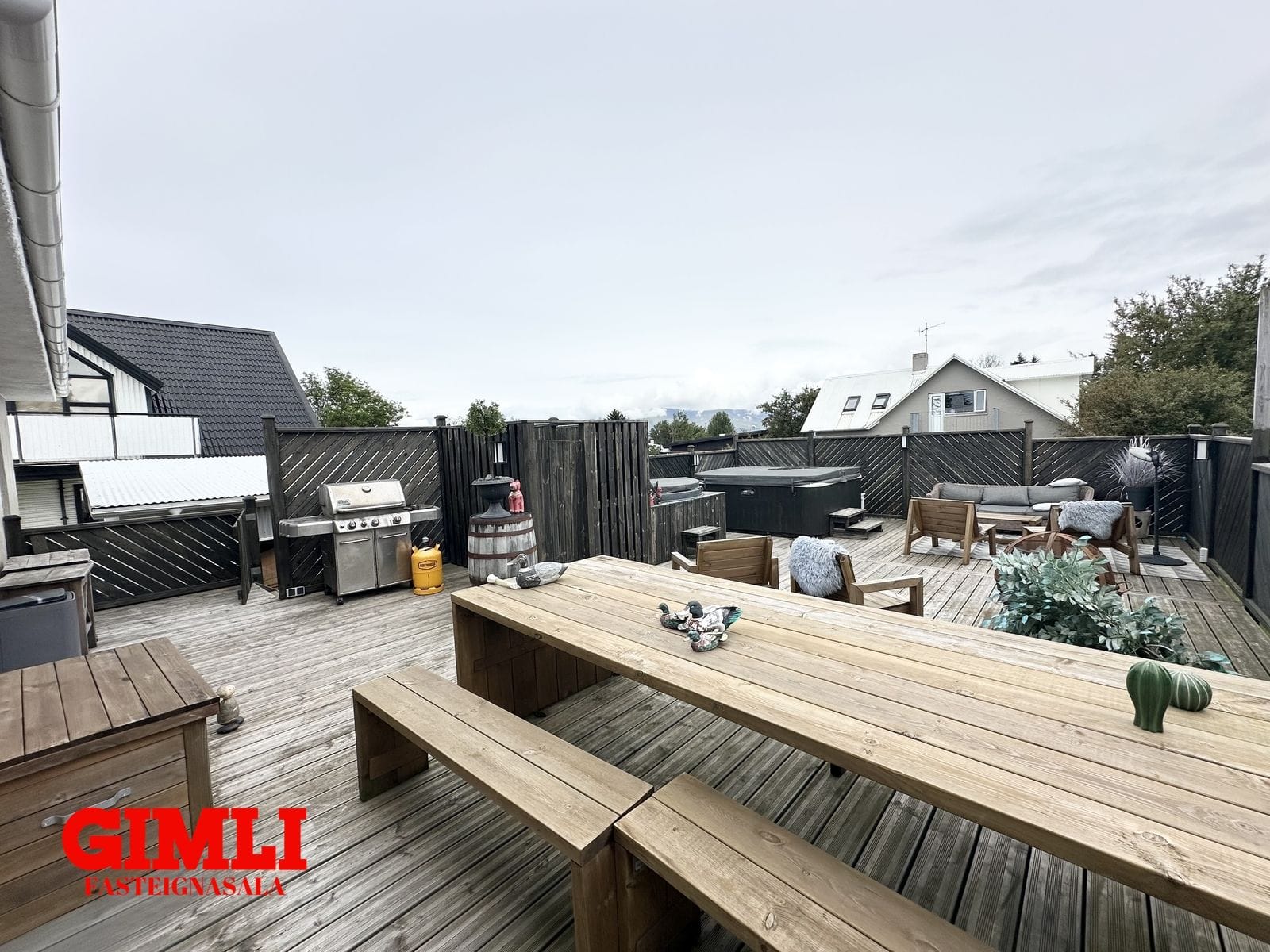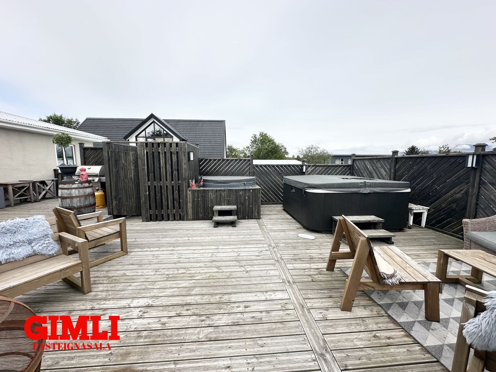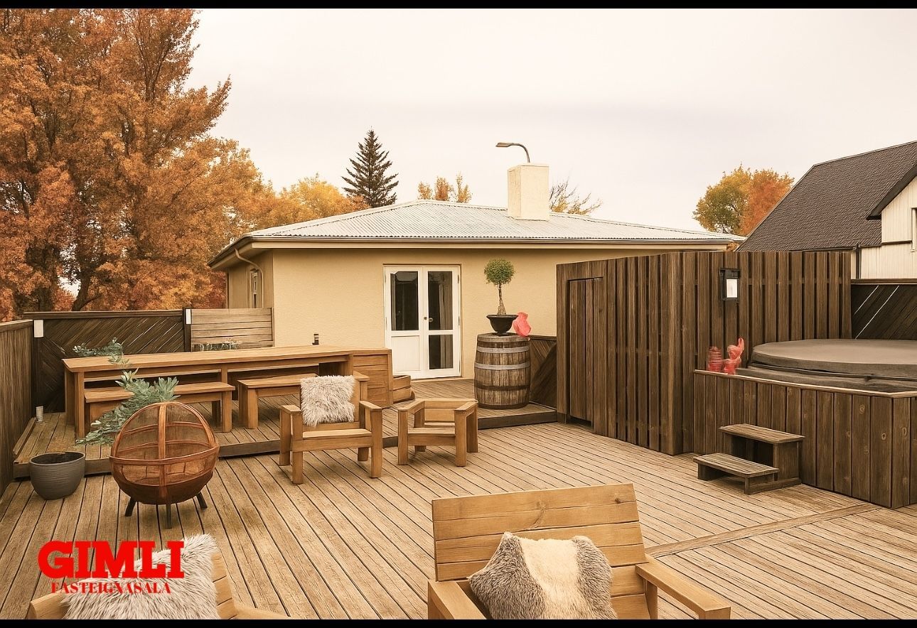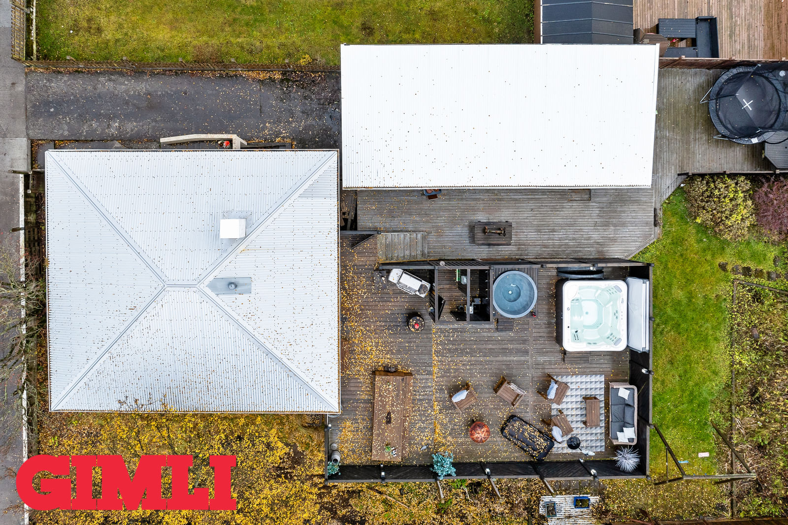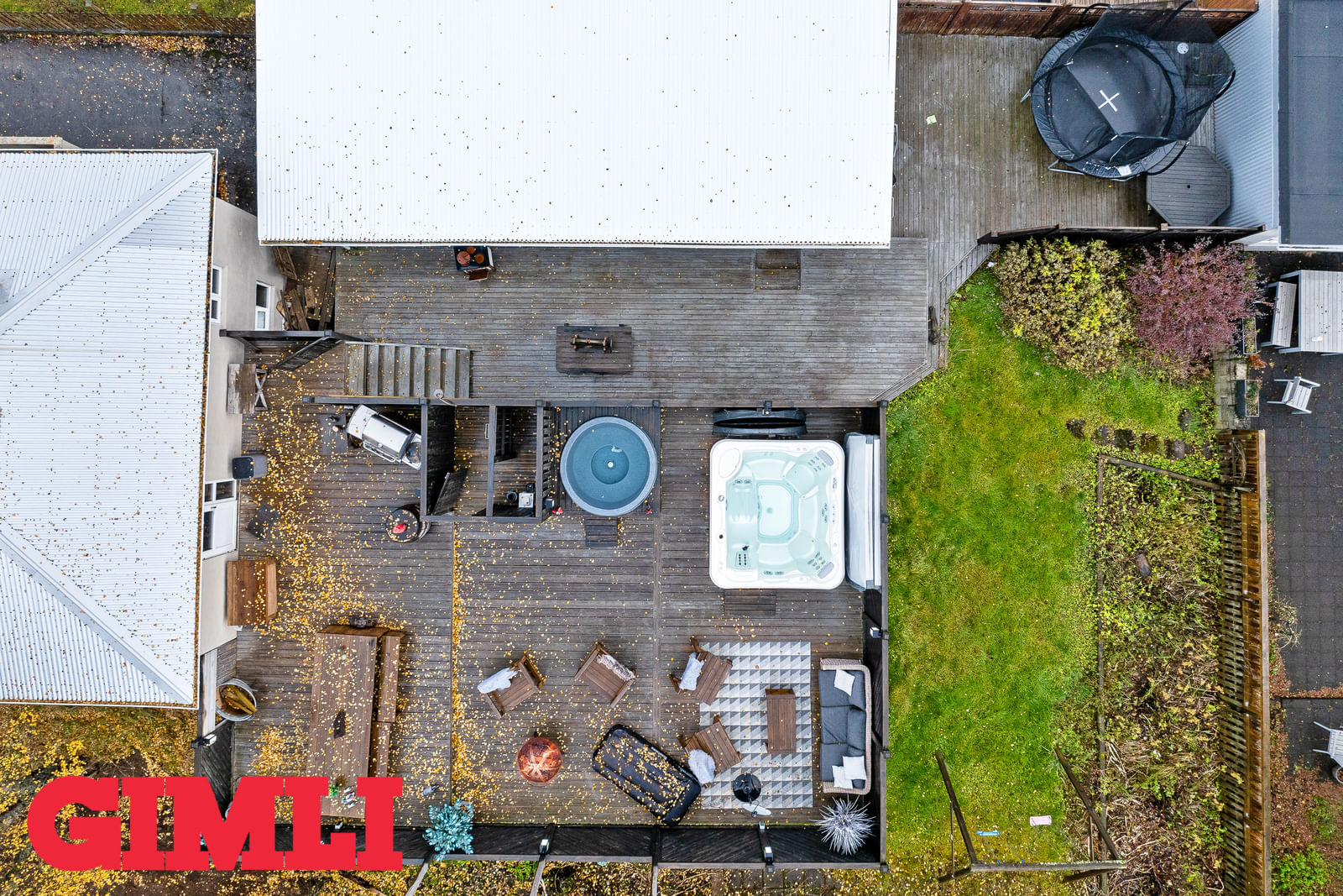 Sólpallur, stór ( ca. 90 m²) sólpallur er aftan við húsið, er hann bæði með heitum potti og köldum potti og skjólgirðingum. Tröppur eru niður í garðinn frá pallinum.