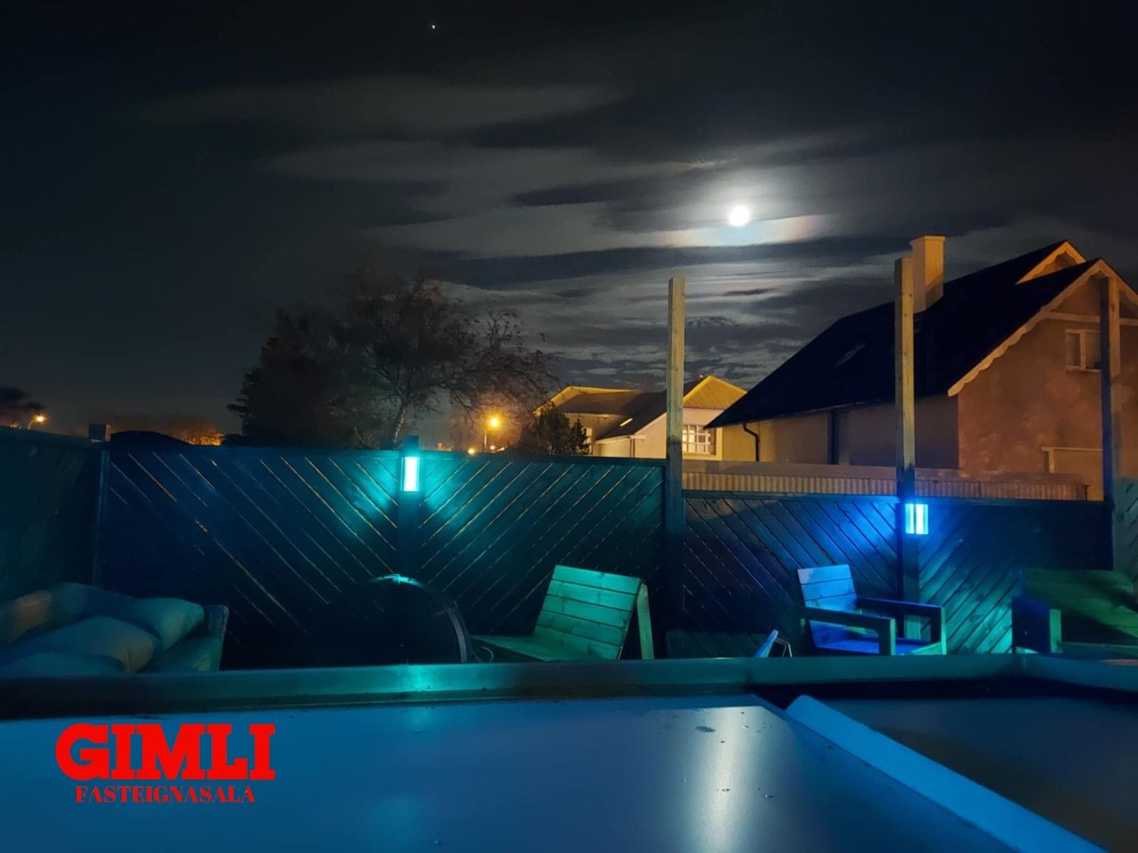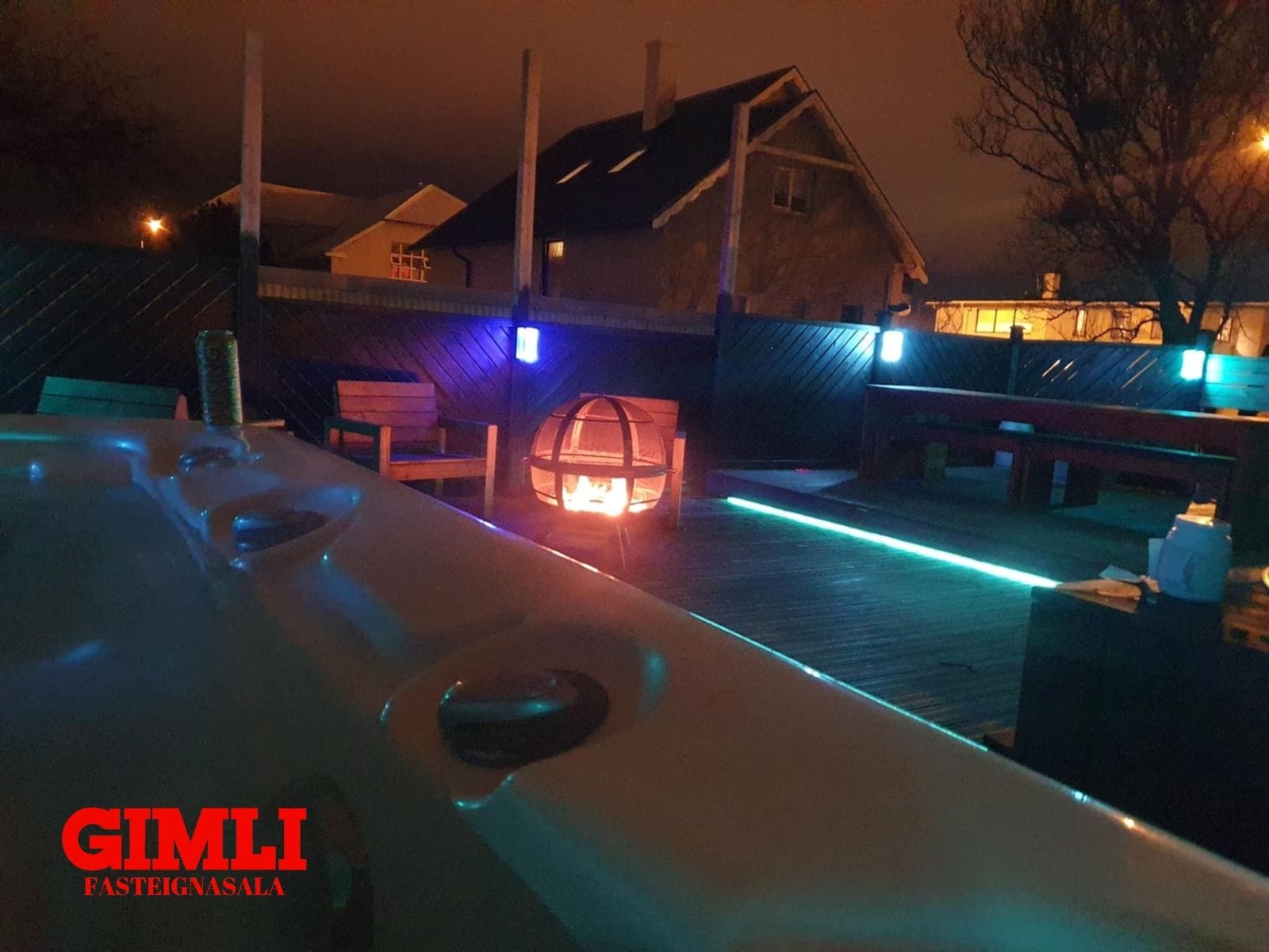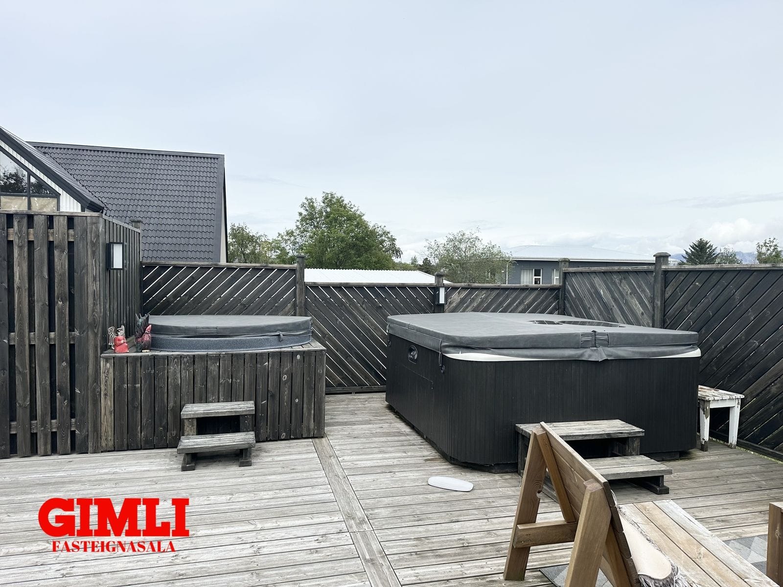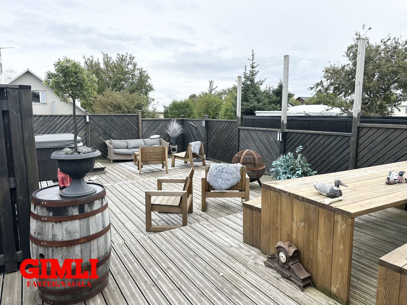 Sólpallur, stór ( ca. 90 m²) sólpallur er aftan við húsið, er hann bæði með heitum potti og köldum potti og skjólgirðingum. Tröppur eru niður í garðinn frá pallinum.