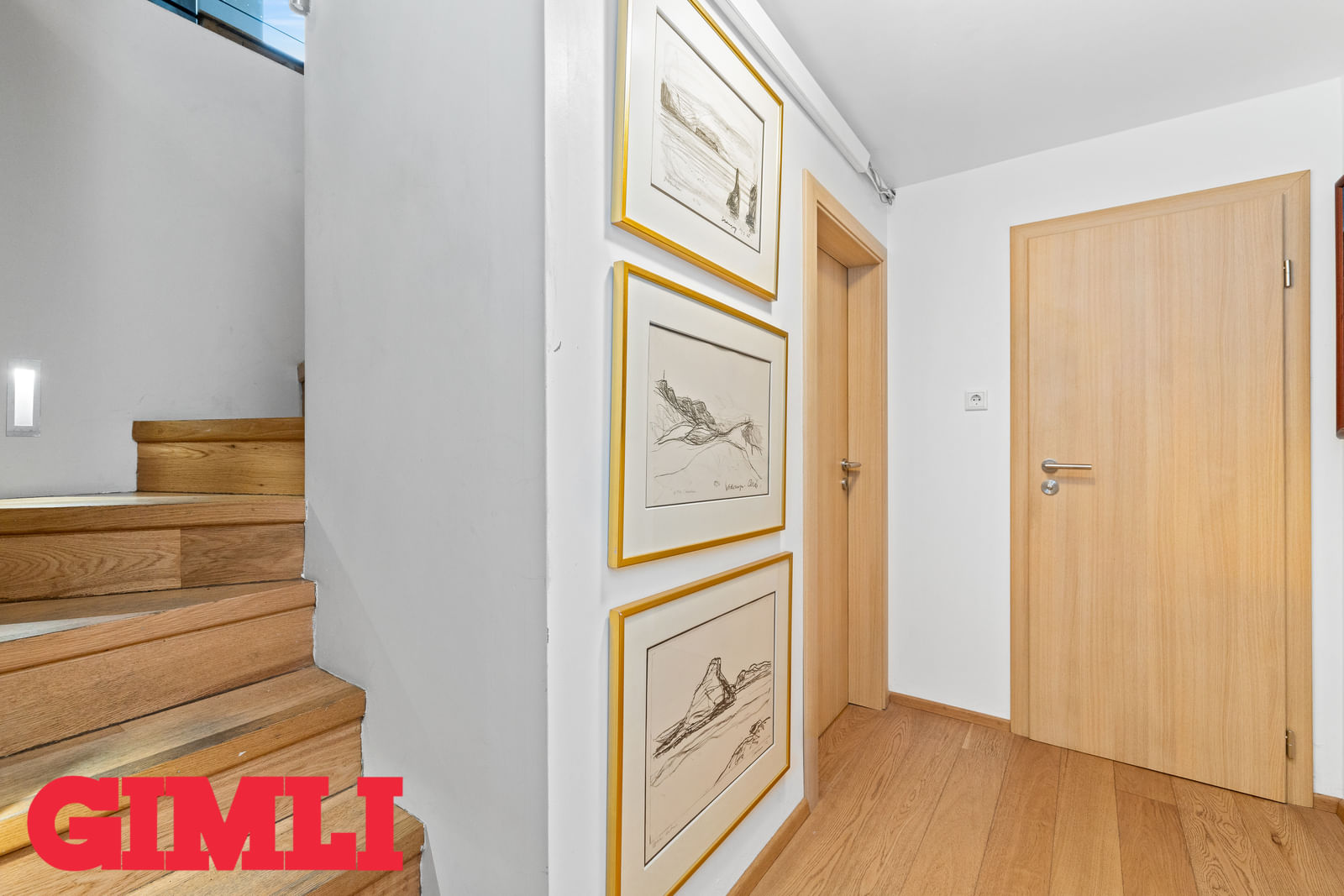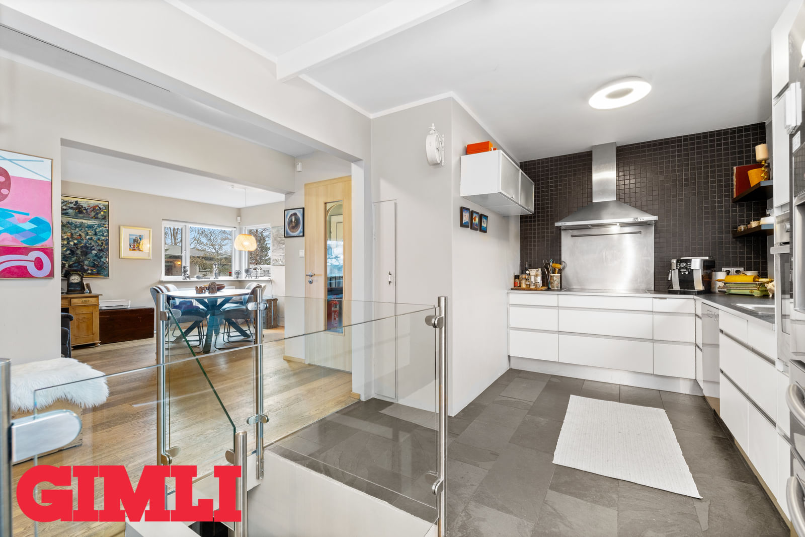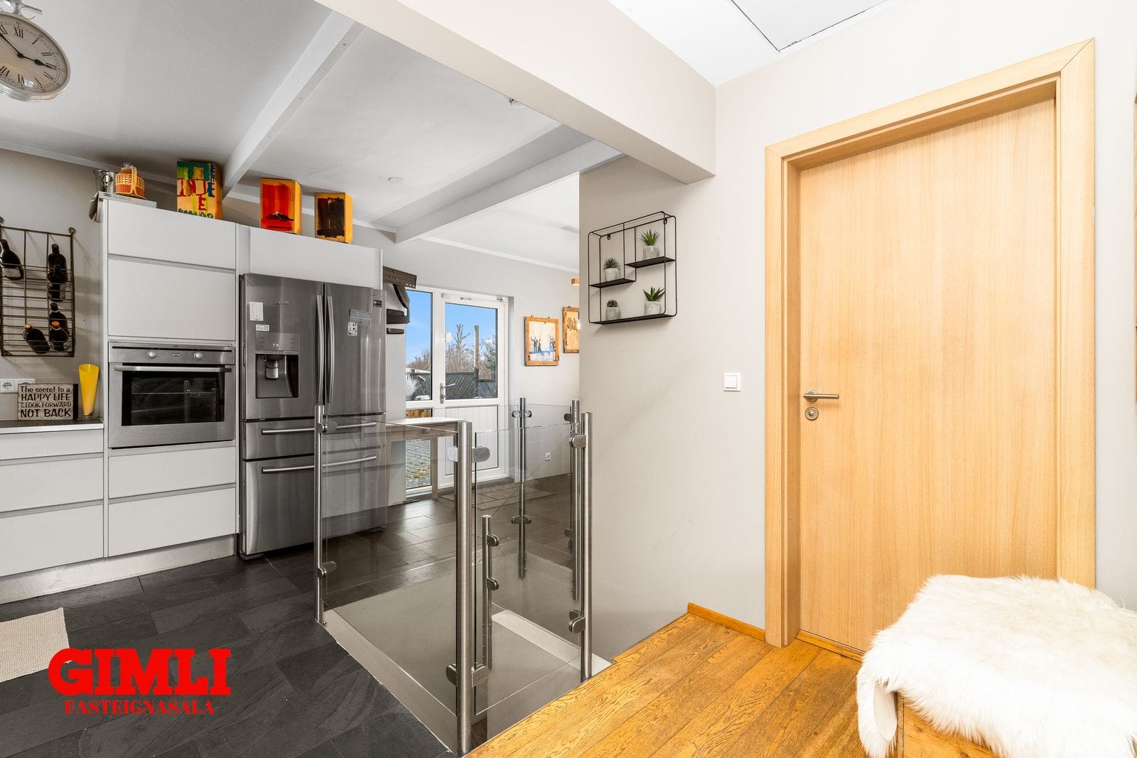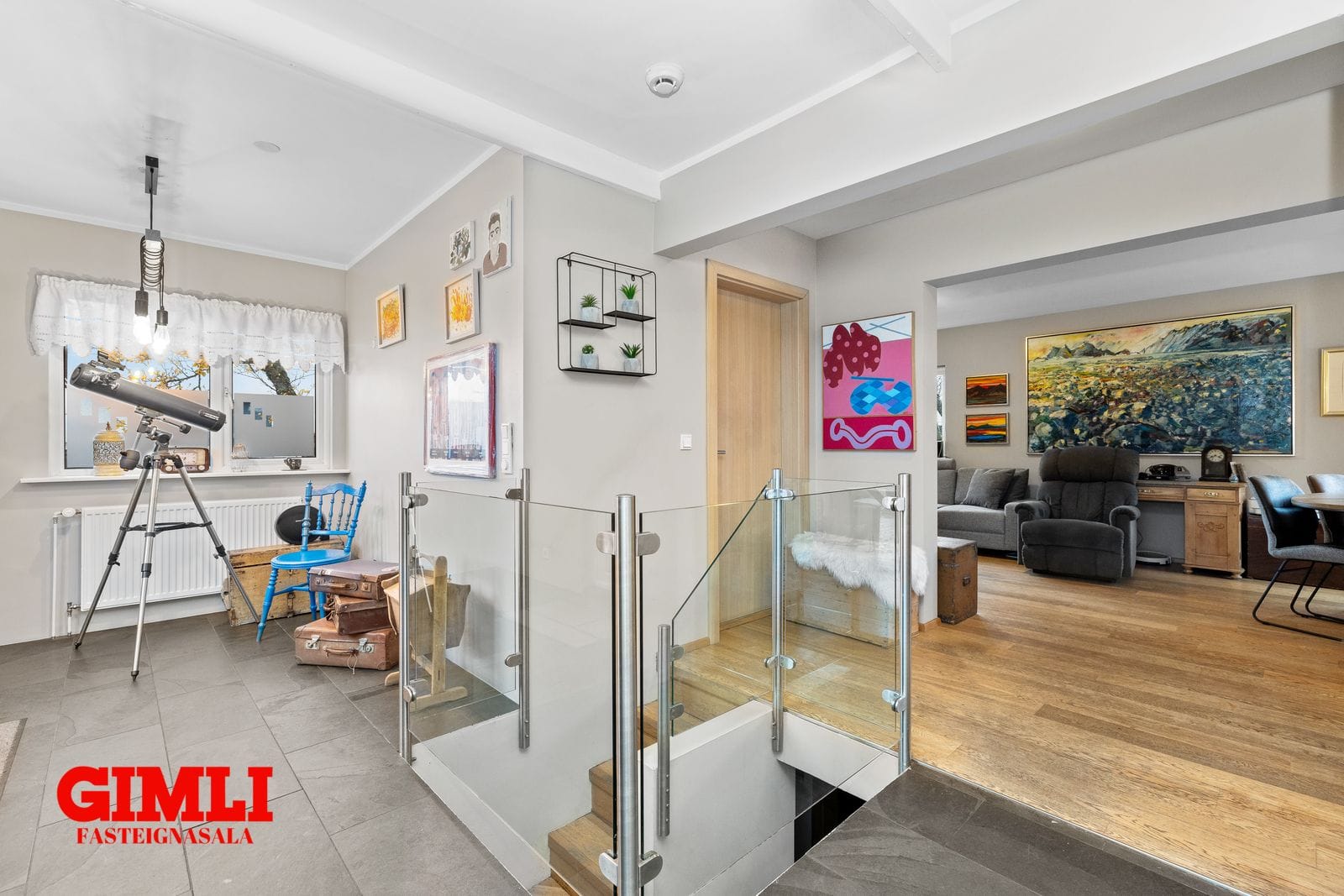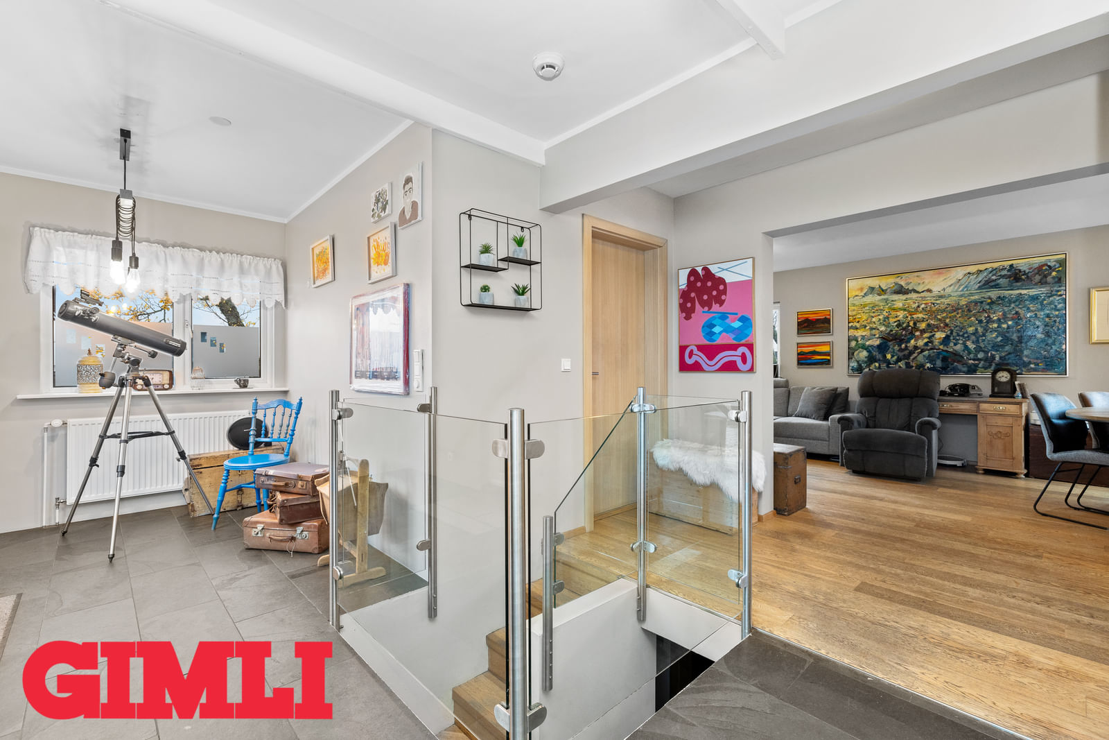 Miðsvæðis á hæðinni er parketlagður stigi á neðri hæð með fallegu glerhandrið umhverfið stigaopið.