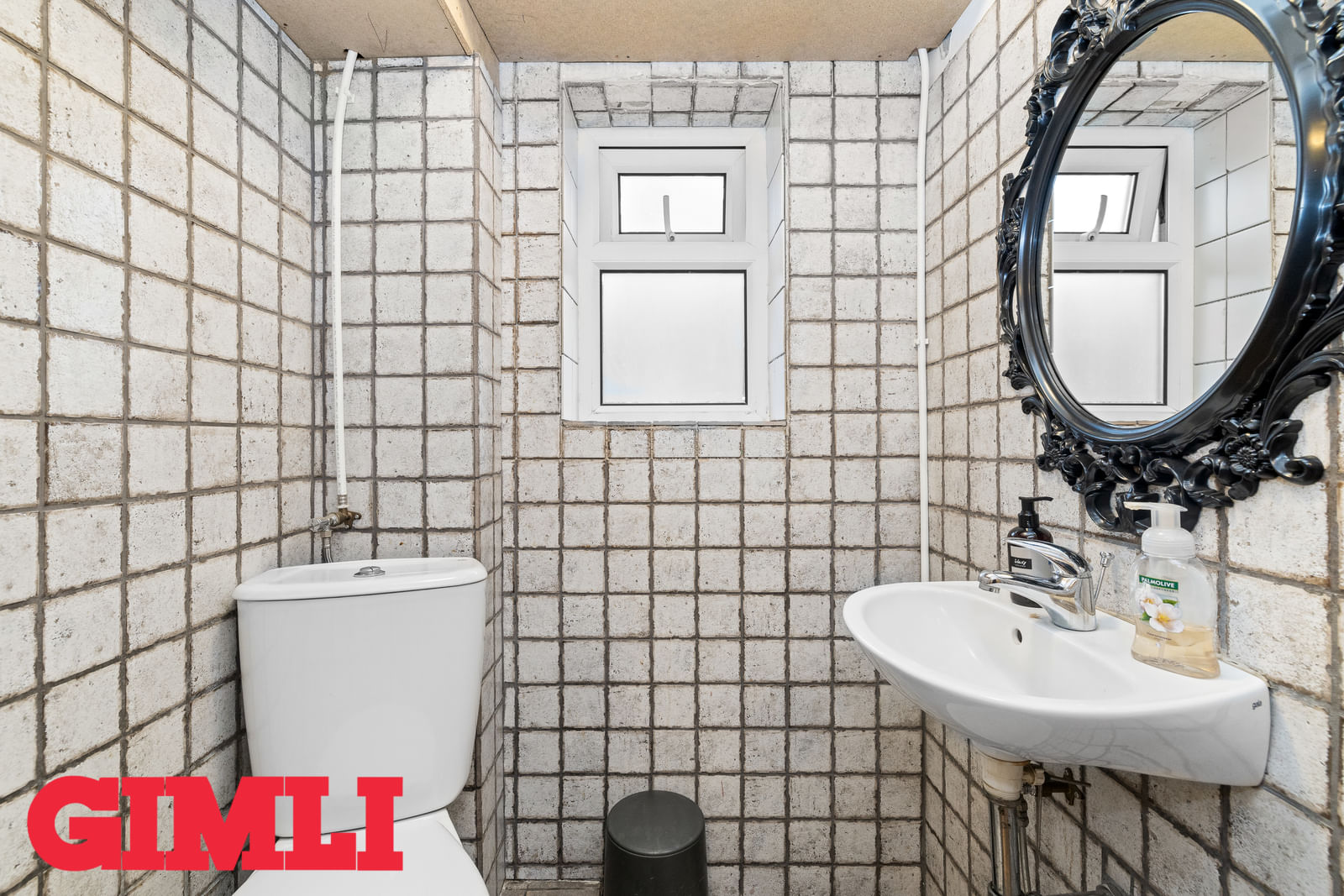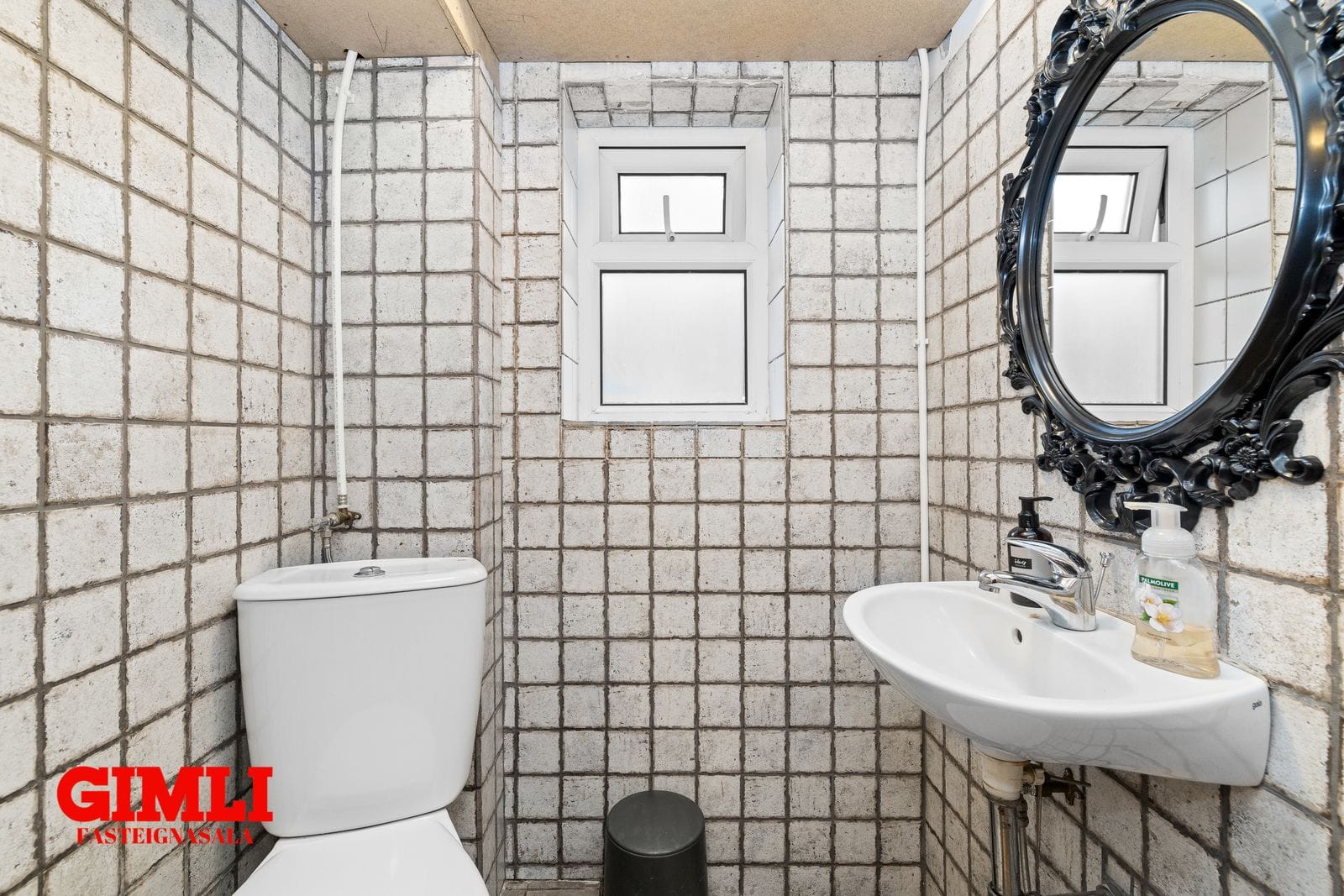 Baðherbergi með flísalögðum veggjum og opnanlegum glugga.