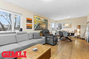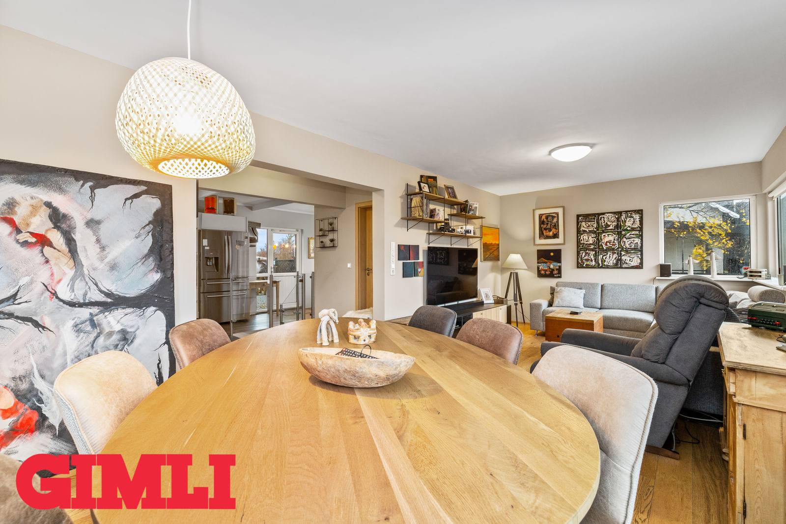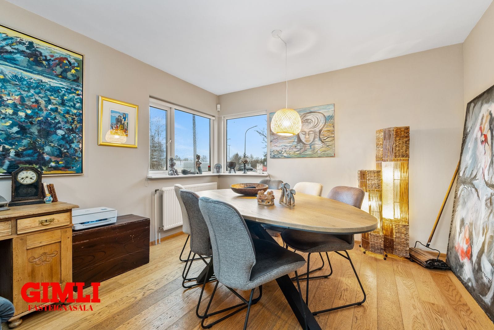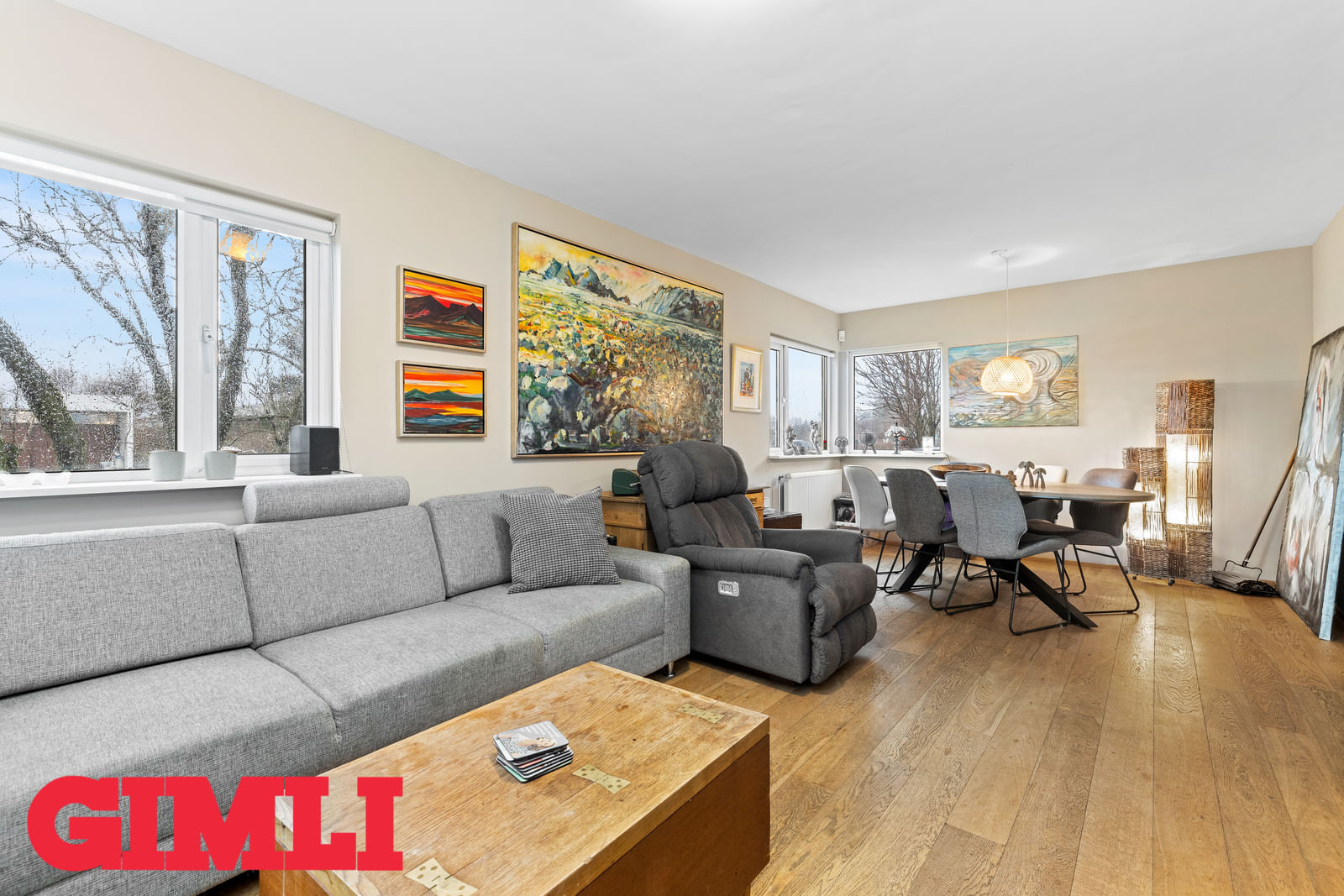 Stofa og borðstofa í samliggjandi rými með parketlögðu gólfi og gluggum á þrjá vegu.
