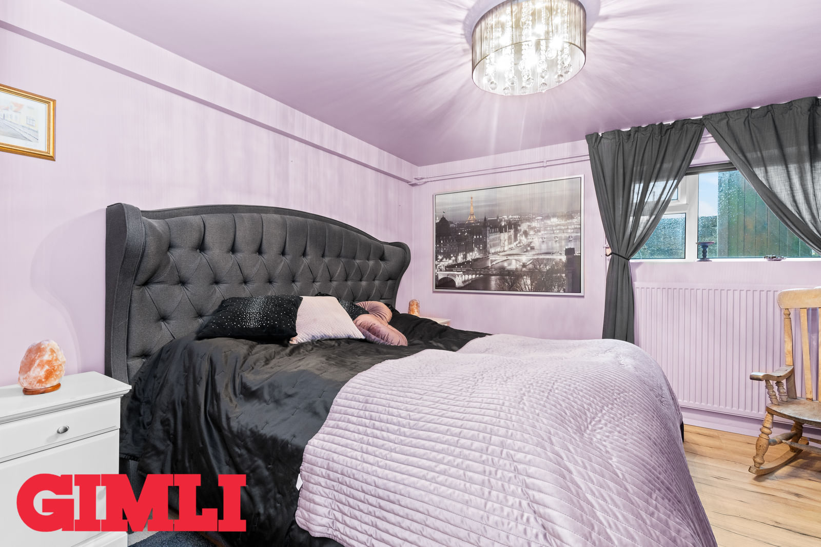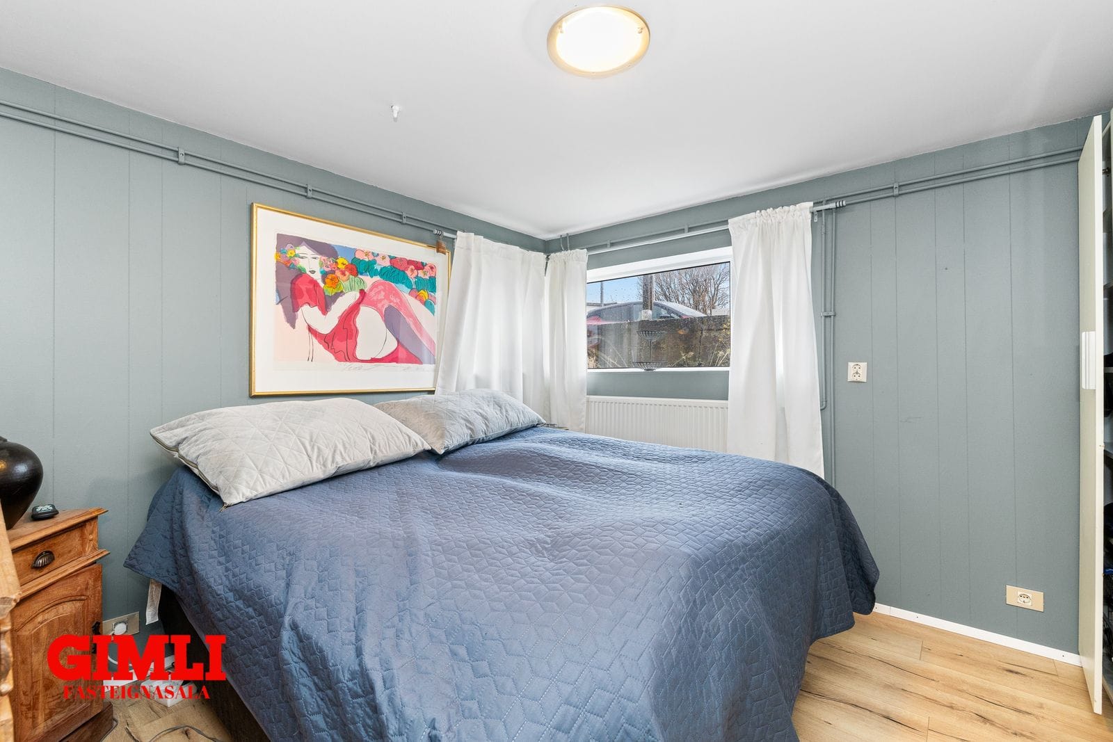 Herbergi 1, rúmgott hjónaherbergi með parketlögðu gólfi.