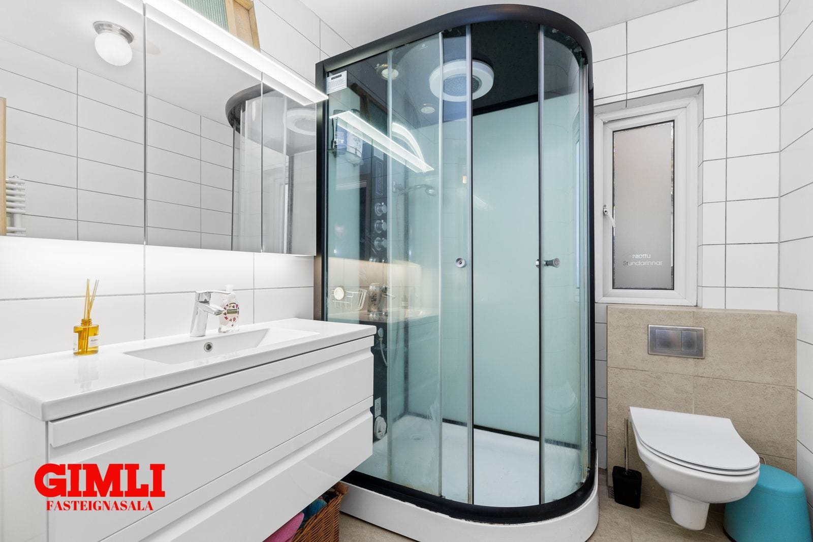 Baðherbergi, flísalagt í hólf og gólf, innrétting sturtuklefi,upphengt salerni og opnanlegur gluggi