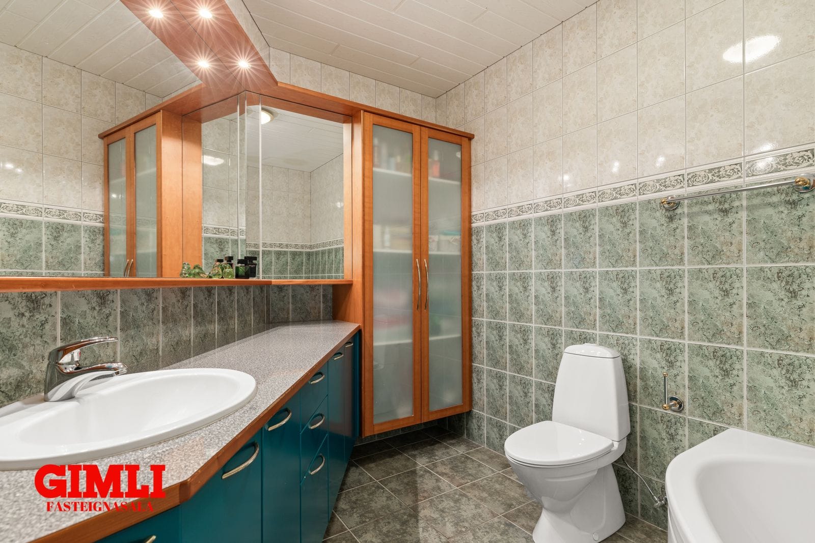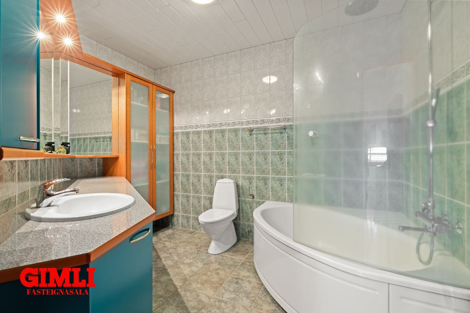 Gestasnyrting: innrétting með vaski. Gluggi. Flísar á gólfi og veggjum. Hiti í gólfi.