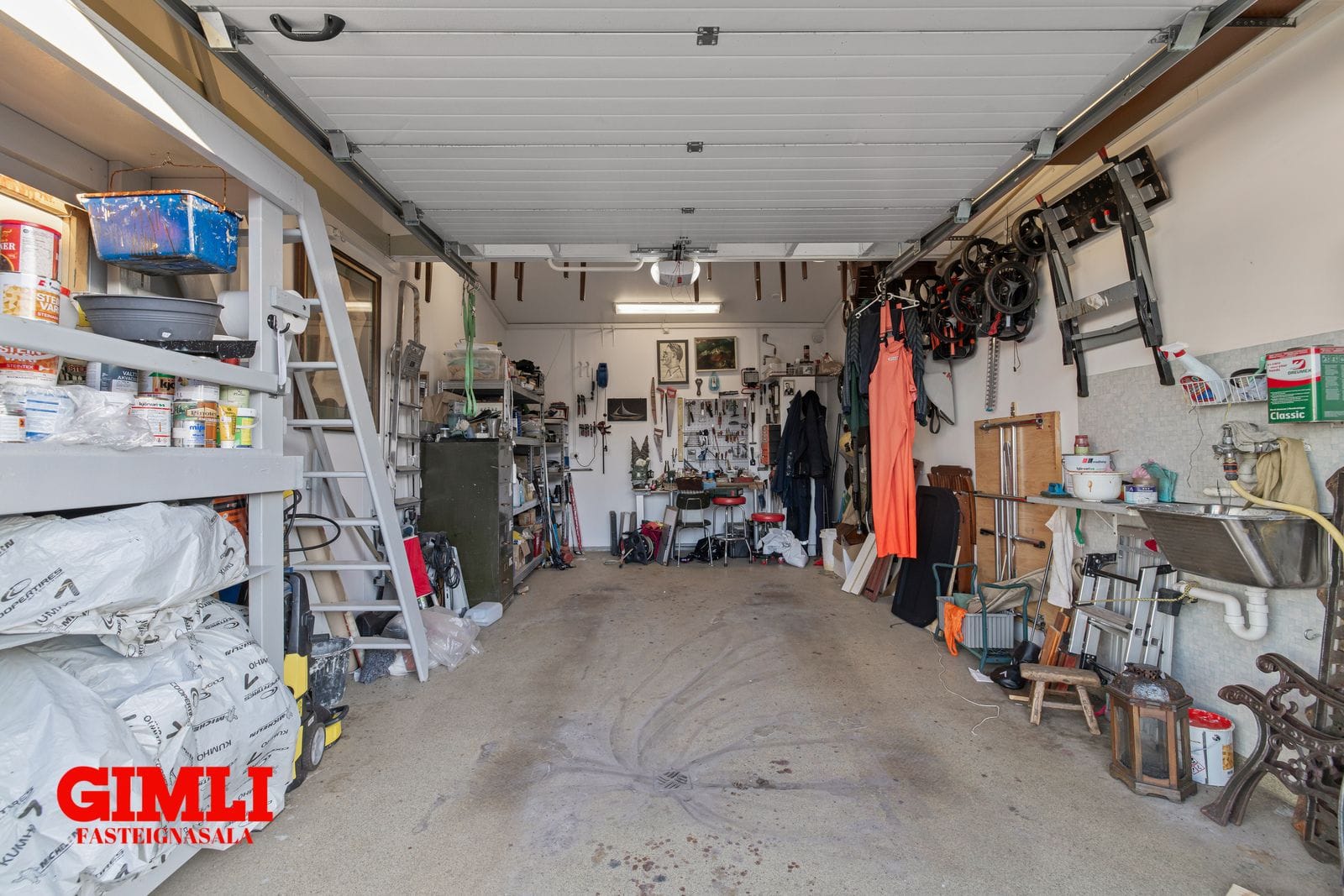 Bílskúr: Er 30,7 fm og sérstæður. Einstaklega rúmgóður með mikilli lofthæð, millilofti og rafmagnsopnun á hurð. Hiti er í bílaplani fyrir framan bílskúr.