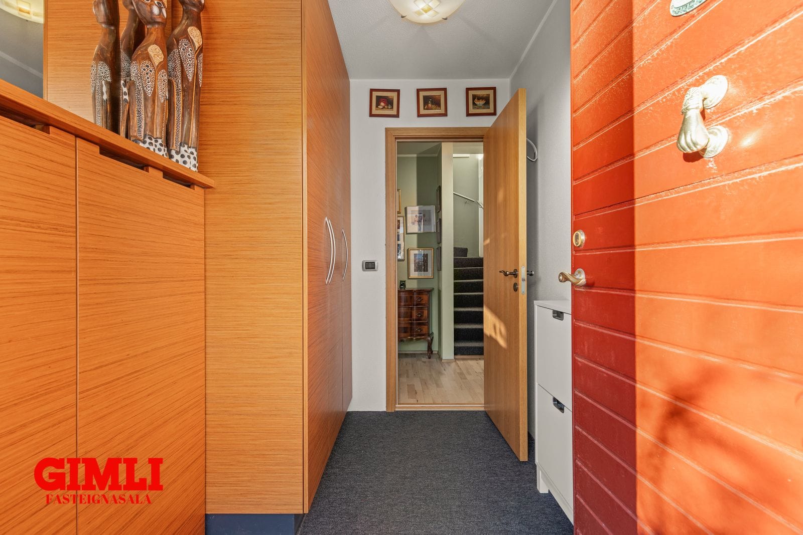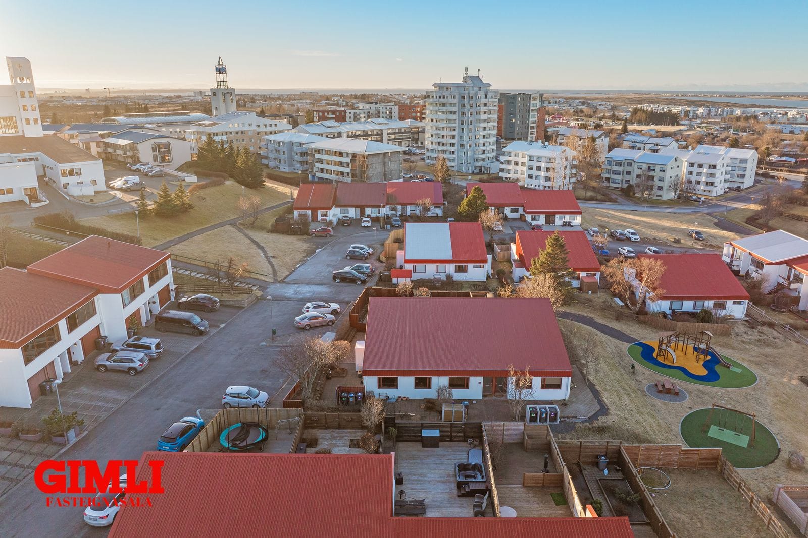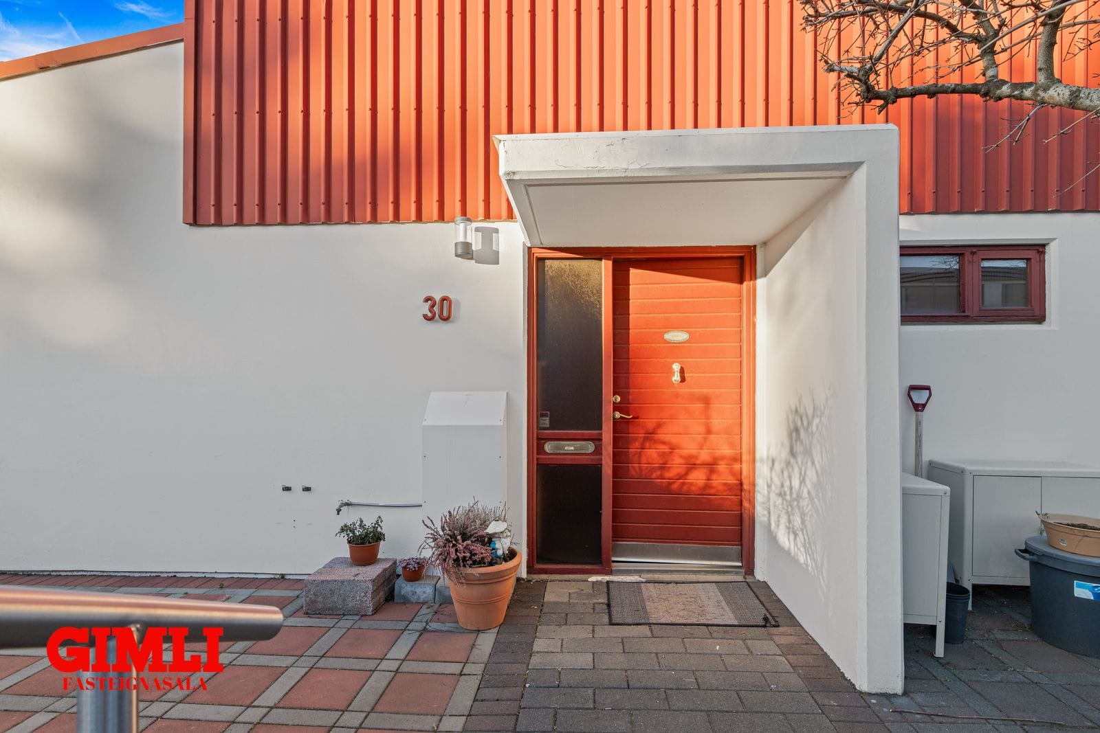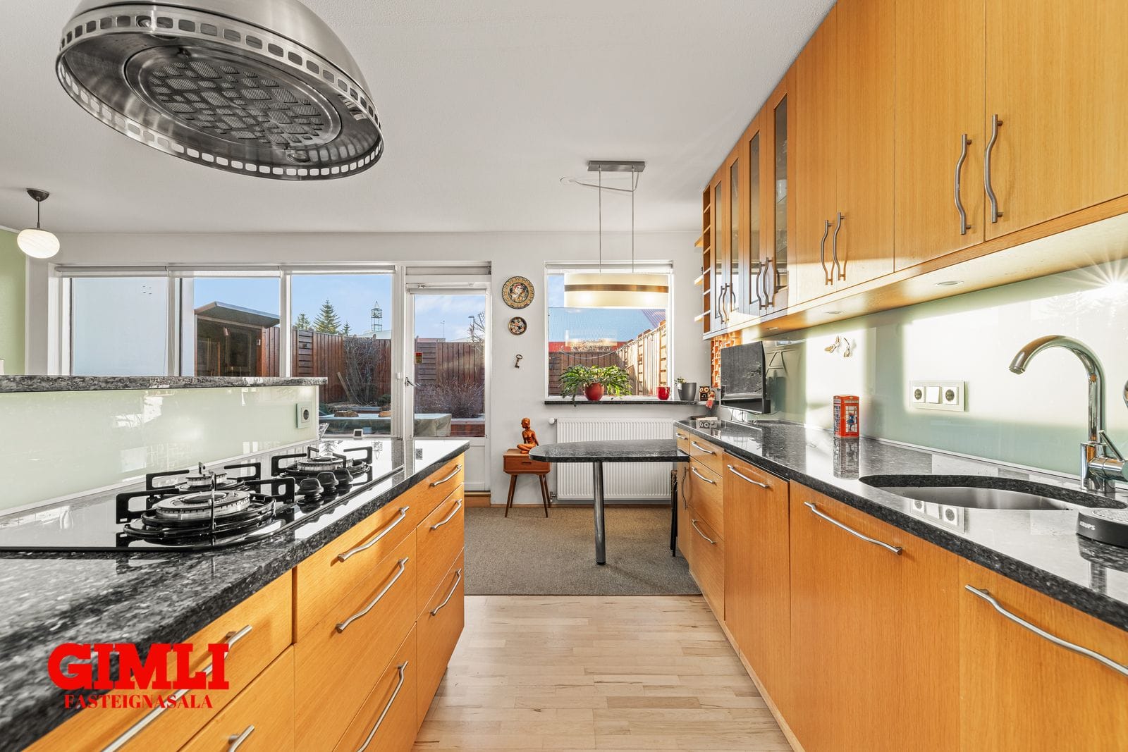 Gimli fasteignasala og Daði Runólfsson kynna: Kjarrmóar 30, 210 Garðabær.Fallegt endaraðhús með rúmgóðum bílskúr, samtals 136,2 fm, á góðum stað í Garðabæ þar sem stutt er í alla helstu þjónustu, skóla og leikskóla. Möguleiki er á að hafa fjögur svefnherbergi í húsinu. Einstaklega falleg lóð með góðri útiaðstöðu og skjólgóðum palli með grillskýli. Falleg aðkoma og næg bílastæði. Hiti er í stétt sem liggur frá bílastæði og að inngangi. Eigninni fylgir mjög rúmgóður, sérstæður 30,7 fm bílskúr með mikilli lofthæð og millilofti. Forstofa: Gengið er inn í húsið að sunnanverðu og komið inn í forstofu með flísum og sérsniðnu teppi á gólfi. Góðir fataskápar.