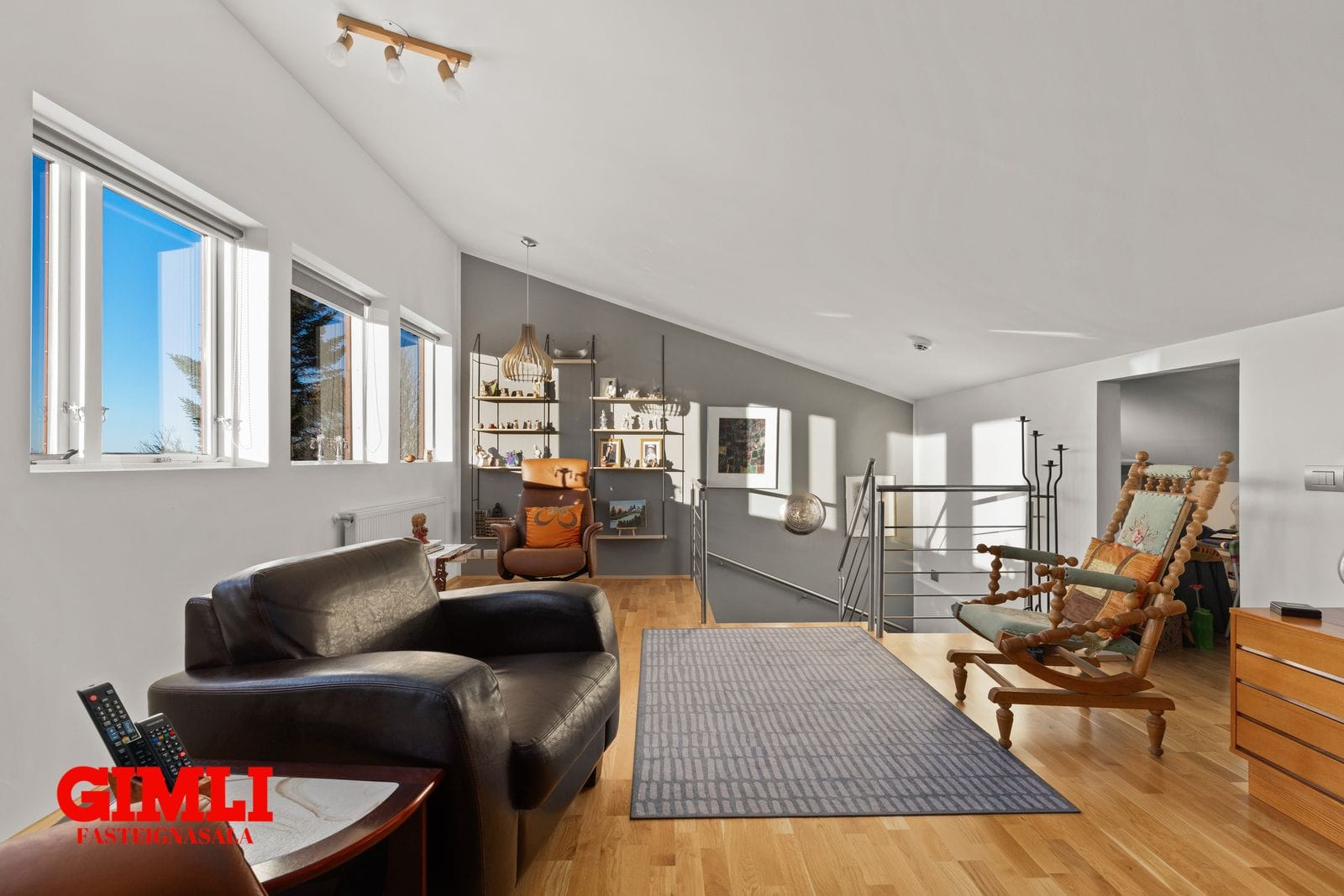 Efri hæð: Gengið er upp teppalagðan stiga á efri hæð. Mjög rúmgott opið rými sem er núna nýtt sem stór sjónvarpsstofa en hægt að útbúa tvö svefnherbergi. Rúmgóð geymsla er undir súð á efri hæð. Efri hæðin var að sögn seljanda algjörlega endurnýjuð árið 2022.