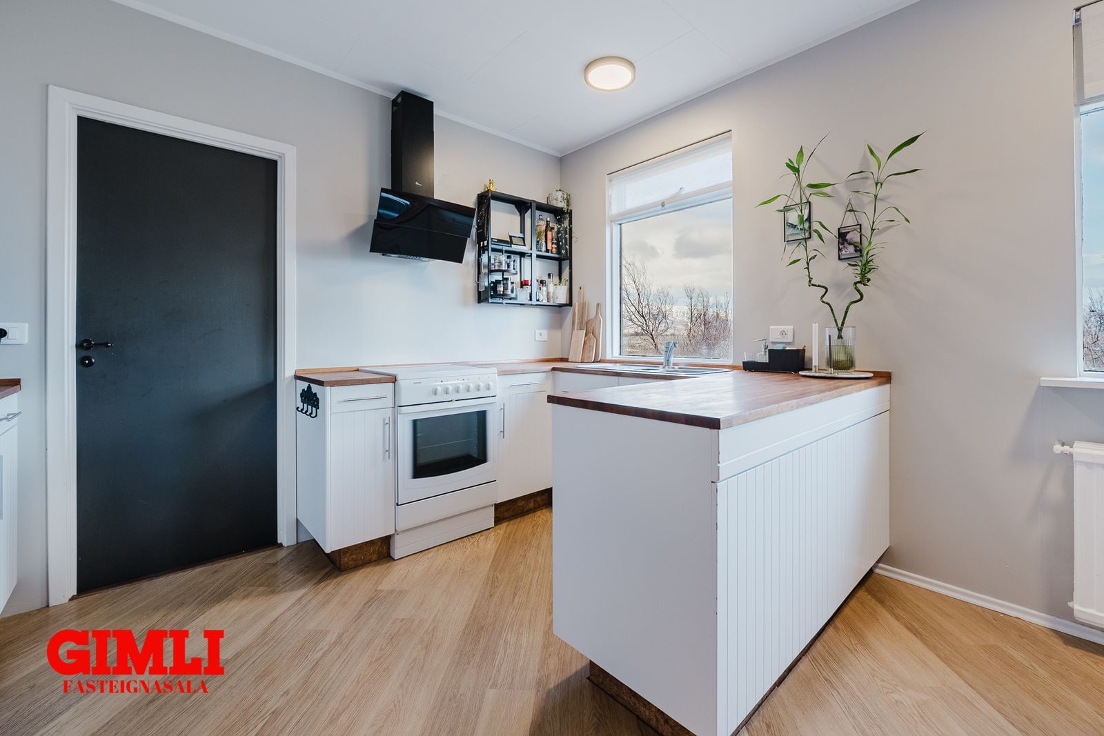 Stórt og bjart eldhús með tveimur gluggum, borðkrók og innréttingu með góðu skápaplássi.