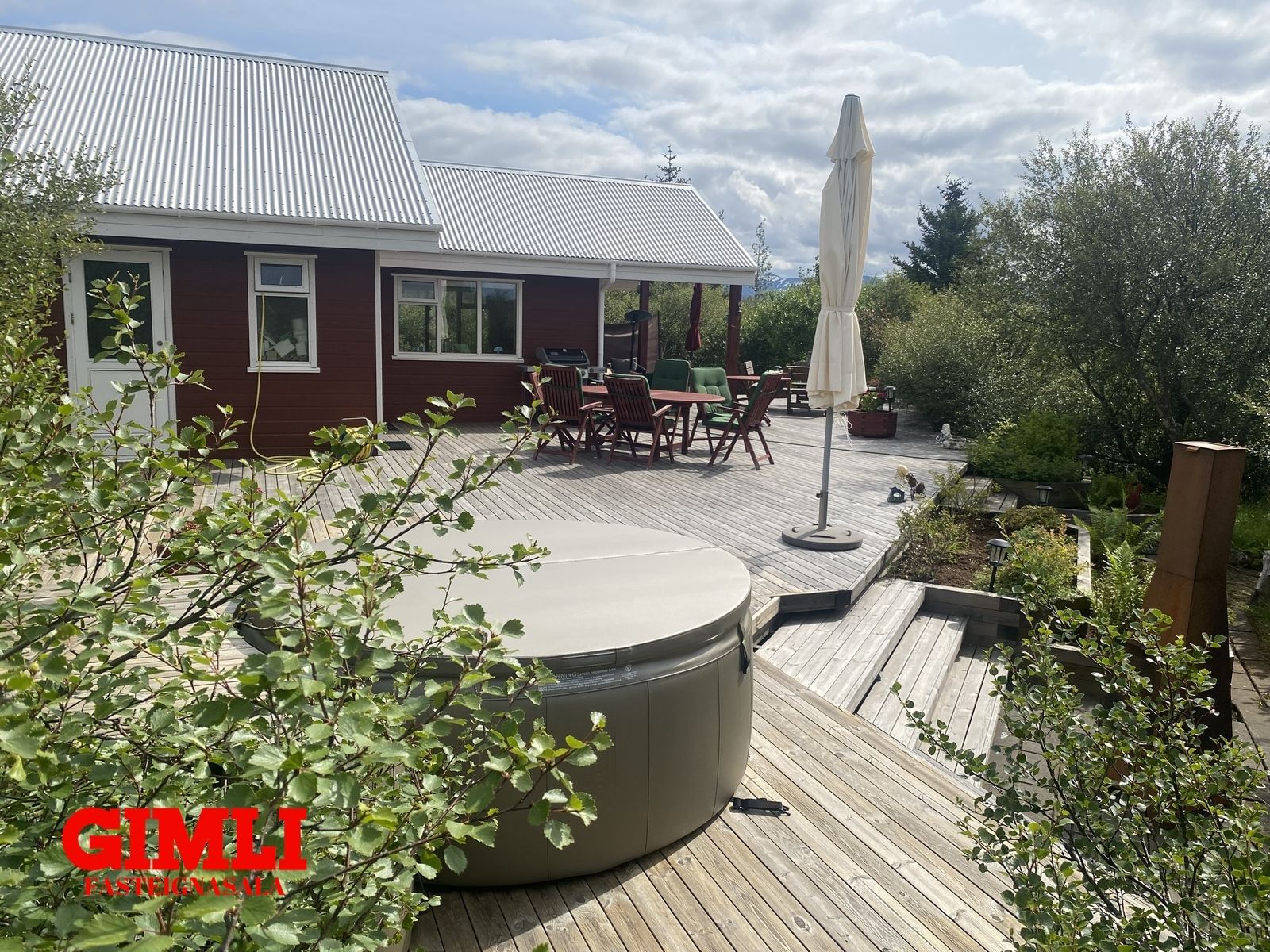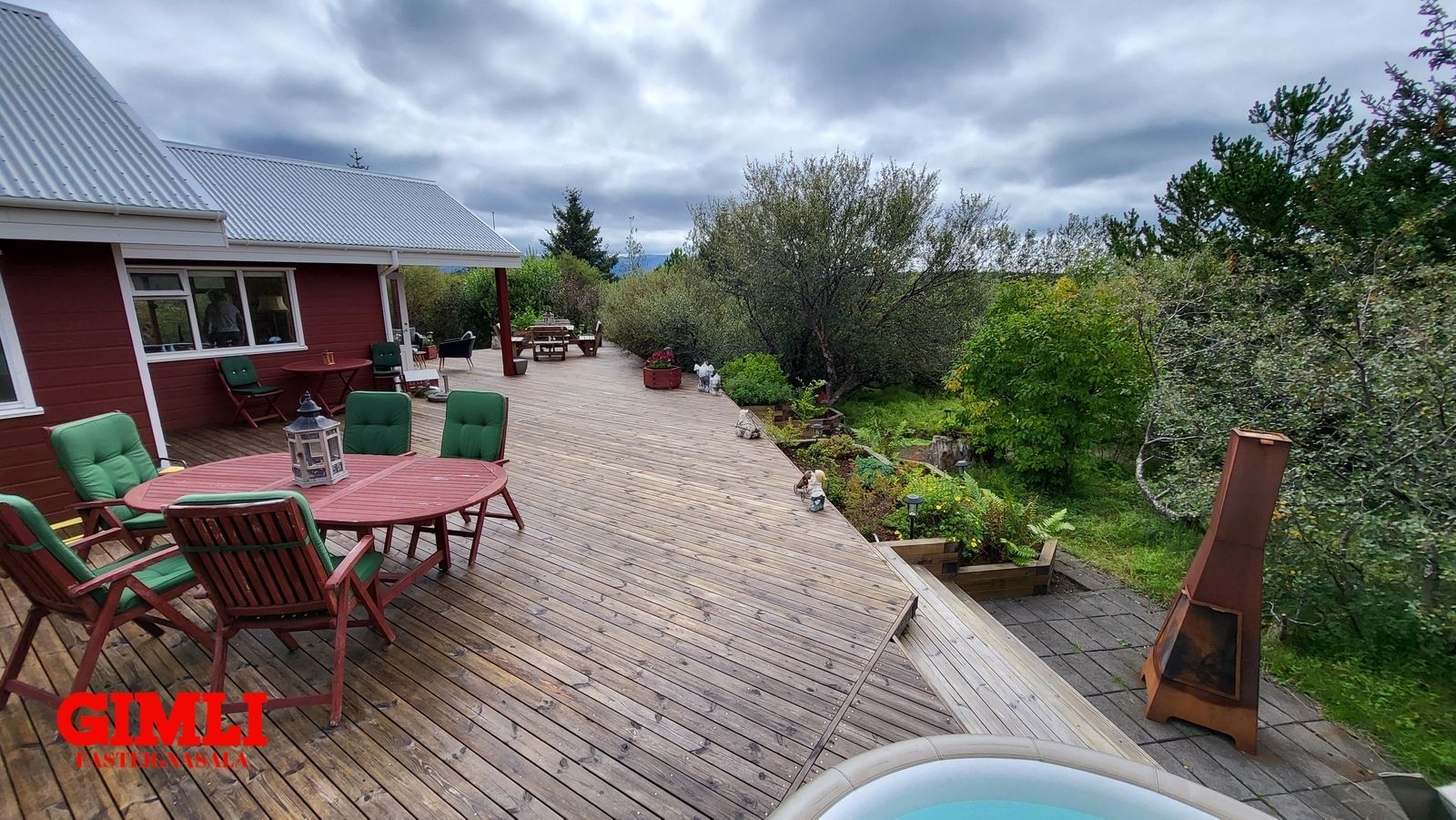 Mjög stór verönd umlykur húsið á tvo vegu og fylgir nýlegur Soft Tub 4ra - 6 manna rafmagnspottur.