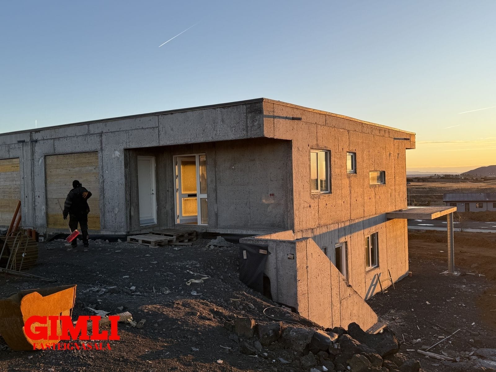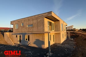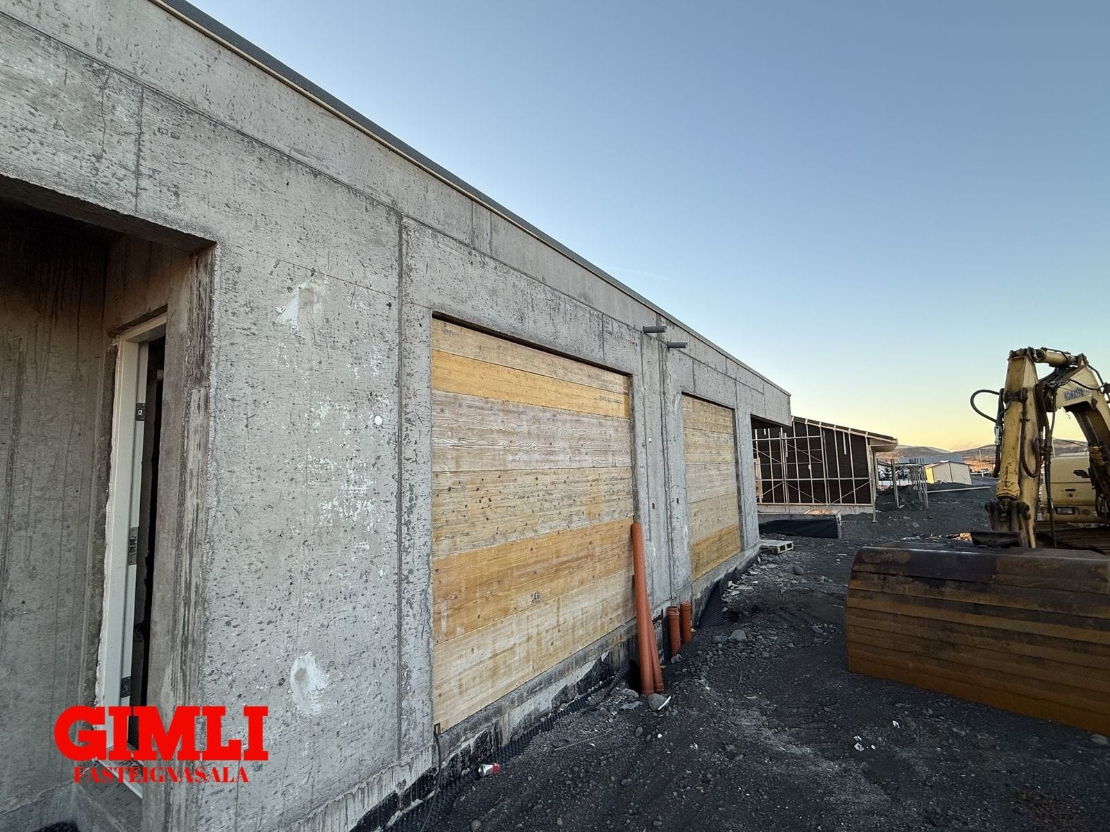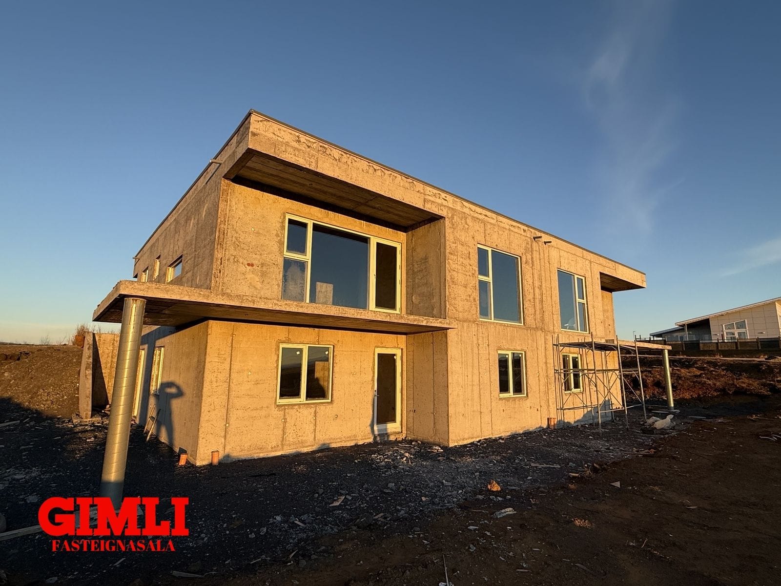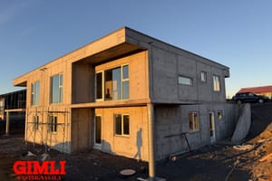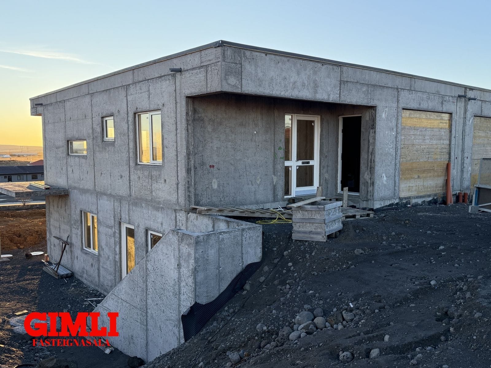Húsin er í dag uppsteypt, með frágengdu þaki, gluggar og gler frágengið sem og útidyrahurð og svalahurðir á báðum hæðum.