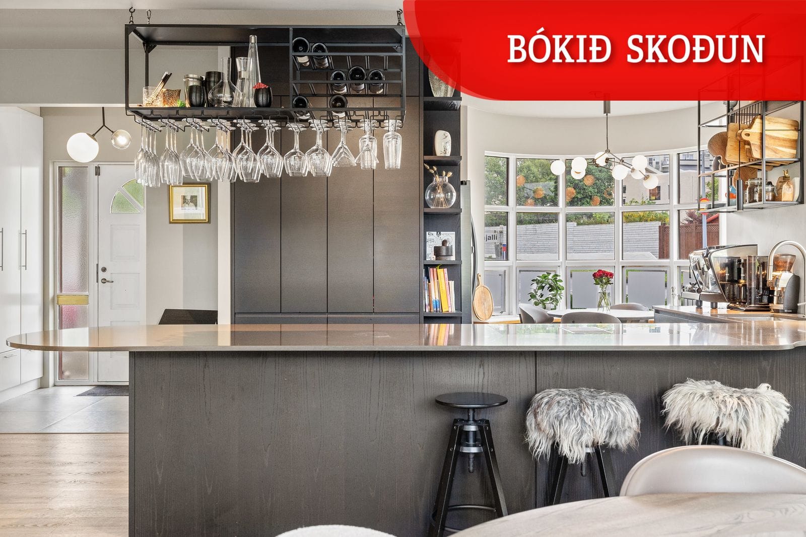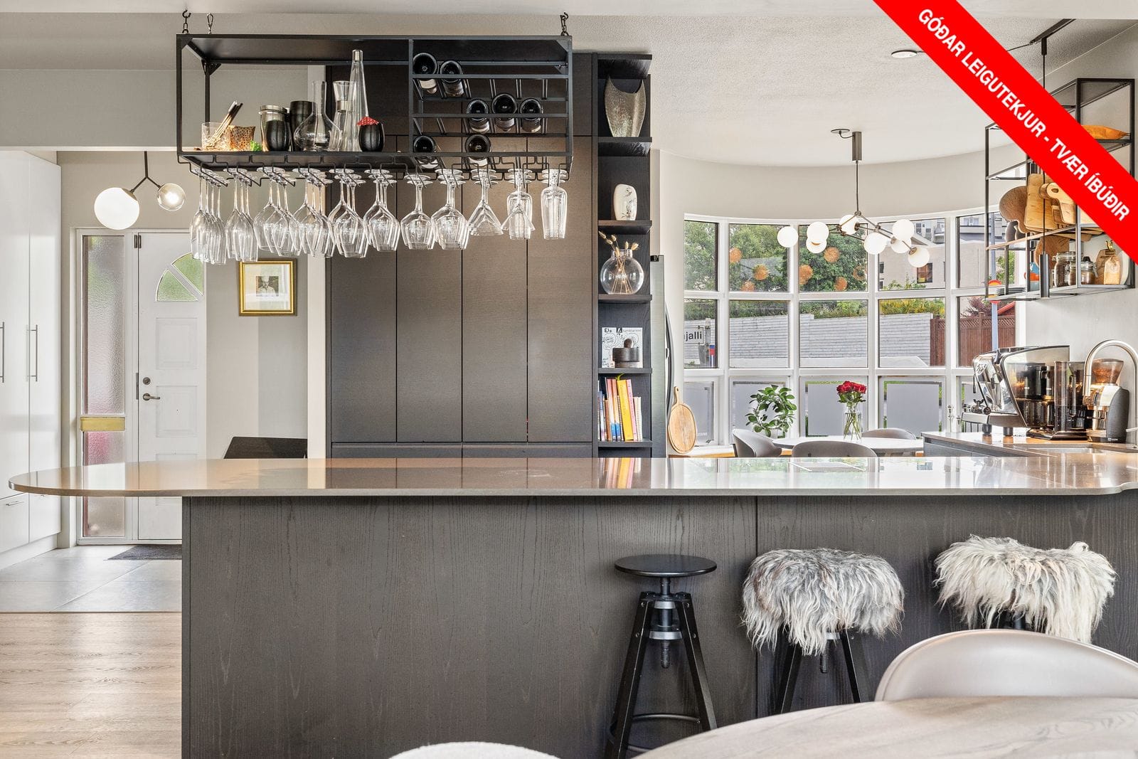 . Eldhús: Glæsilegt og opið inn í borðstofu og stofu. Innréttingin er með góðu geymslurými og er sérsmíðuð úr dökkum askspón frá Ballinslöv, Svíþjóð. Tveir AEG ofnar í vinnuhæð, innbyggð uppþvottavél, AEG Airforce One helluborð með innbyggðri viftu, rými fyrir tvöfaldan ísskáp og steinn á borði. Fallegur bogadreginn gluggi og góður borðkrókur.