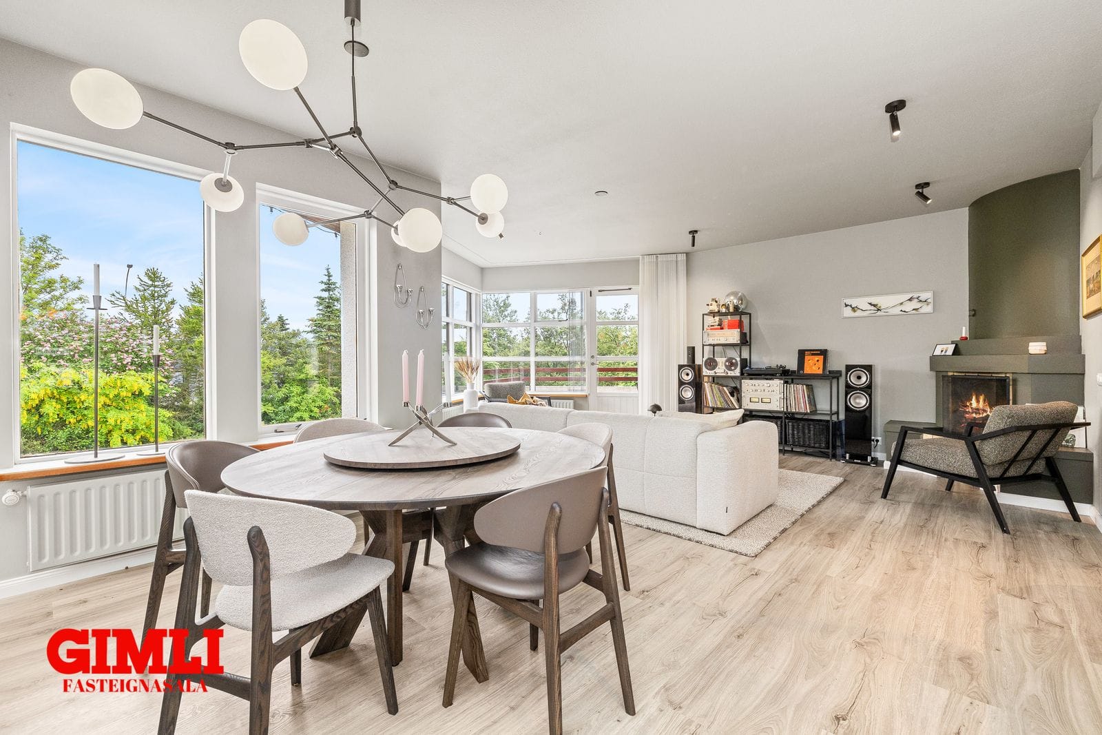 Borðstofa og stofa: Falleg og björt með vínilparketi á gólfi, arni og útgengi út á flísalagðar svalir.