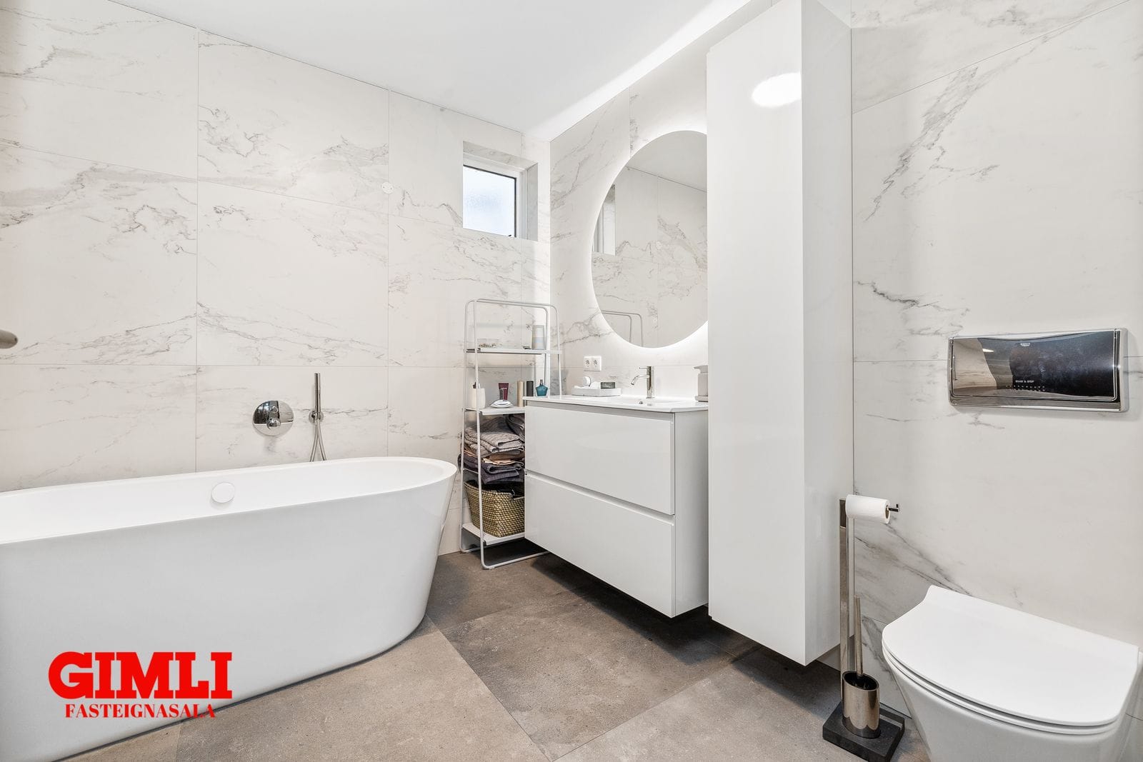 Baðherbergi: Glæsilegt og rúmgott með walk-in sturtu, frístandi baðkari, innréttingu, handklæðaofn og veggföstu salerni.