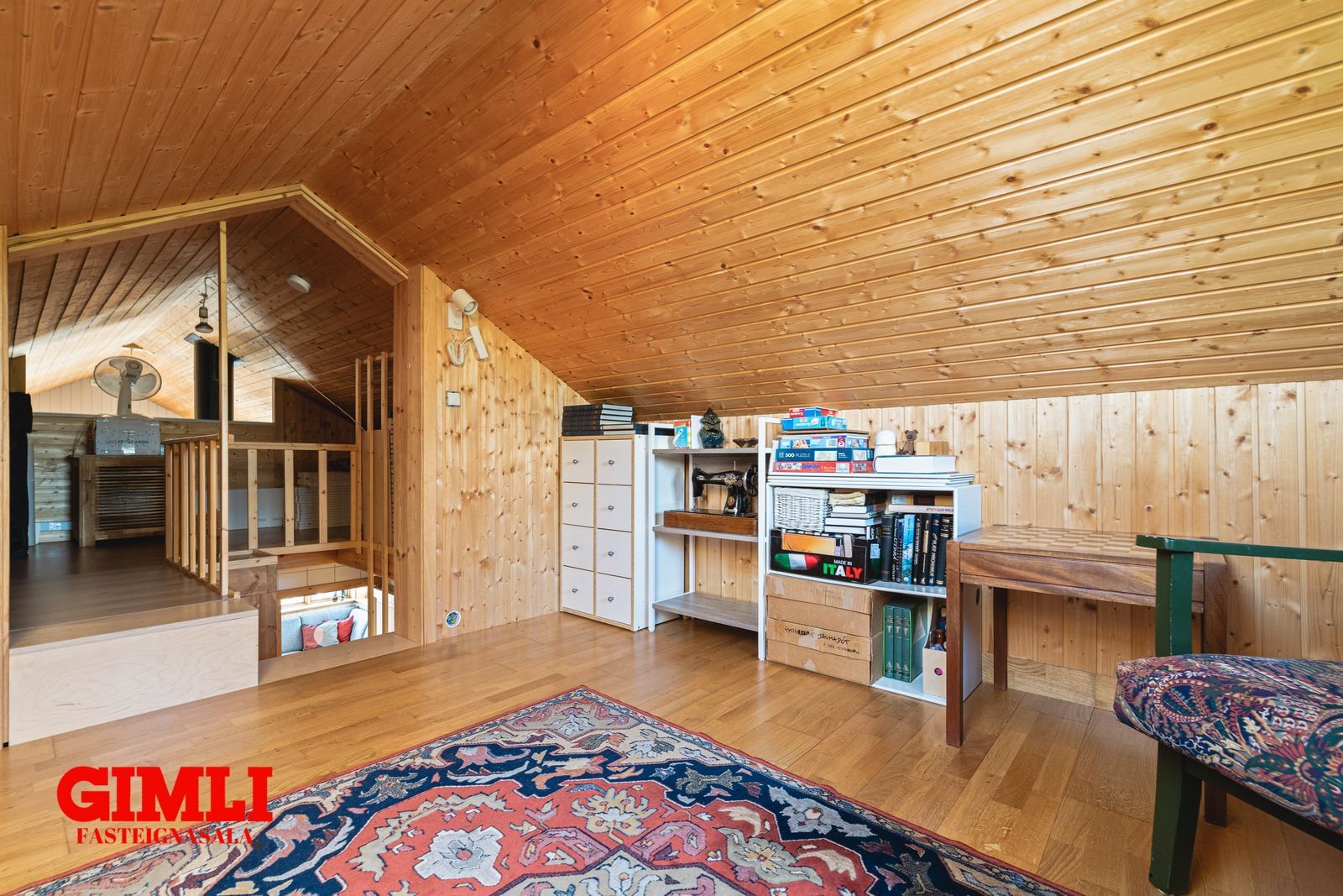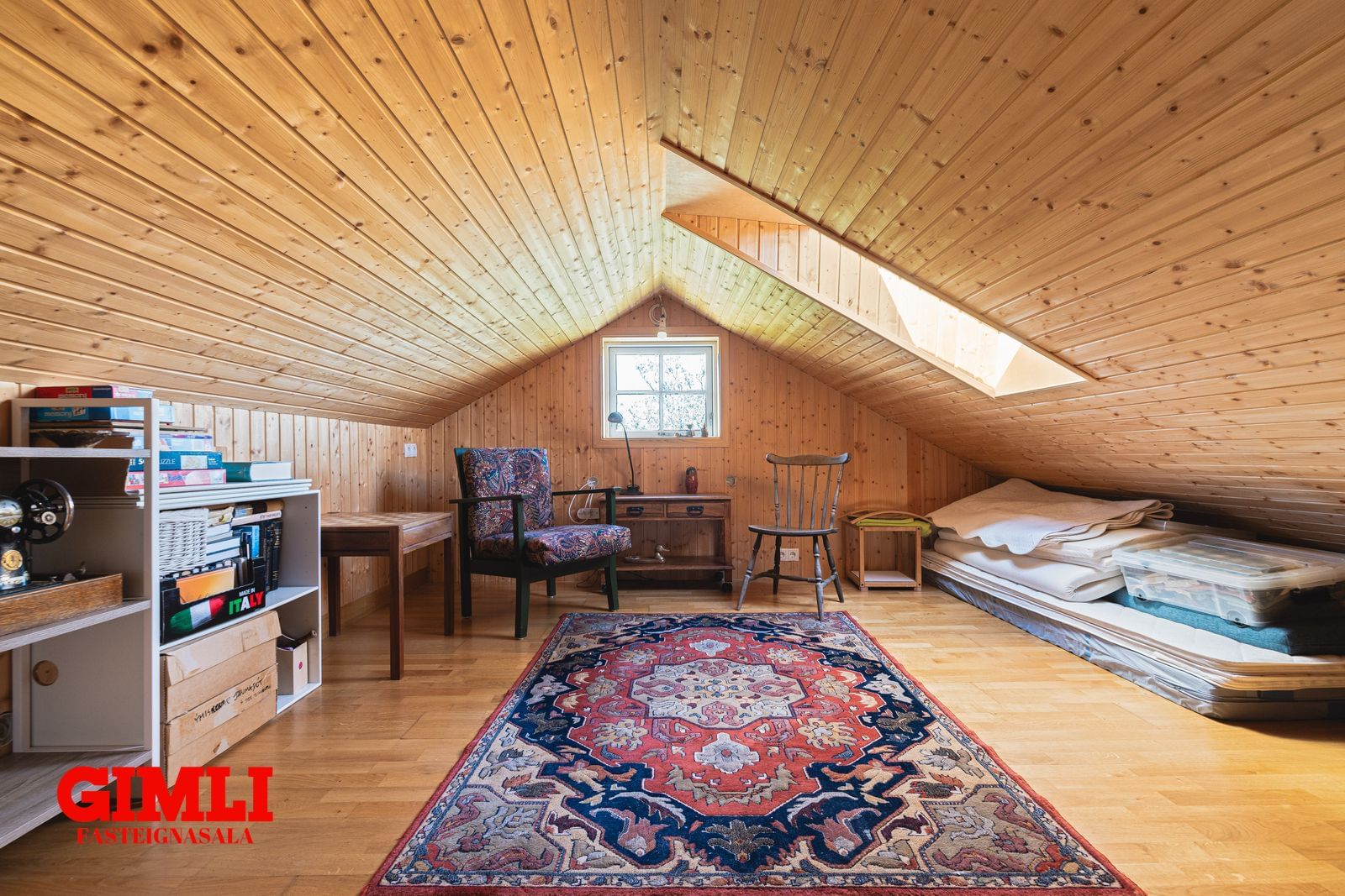 Svefnloft: Gengið er upp um góðan stiga af gangi. Rúmgott tvískipt loft með miklu gistiplássi, gluggi til norðurs auk þakgluggan. Opið niður í stofu.
