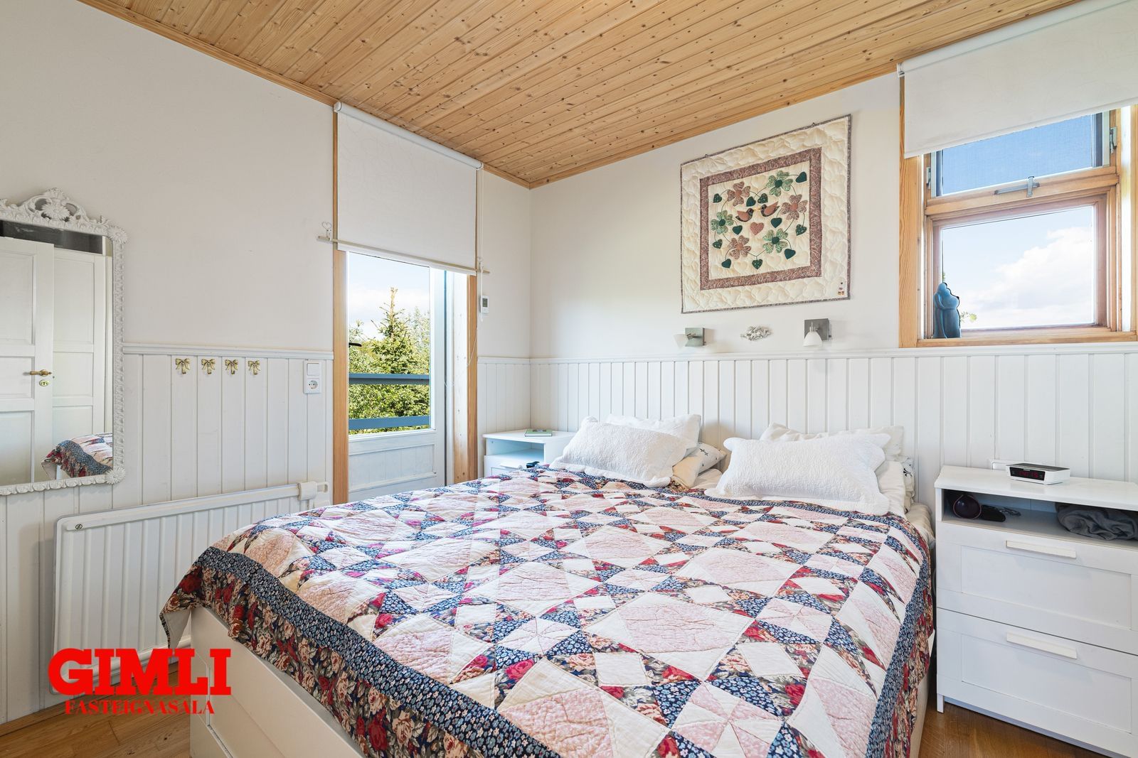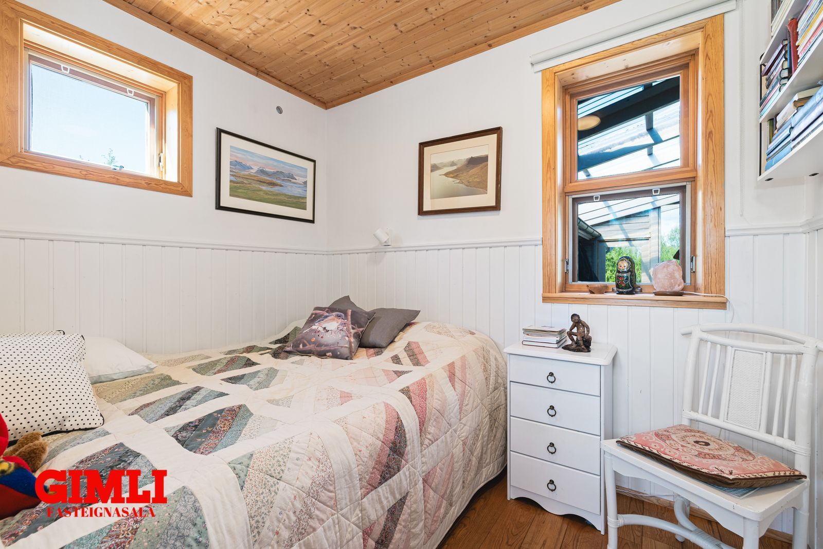 Svefnherbergi II: Gegnheill askur á gólfi, gluggar í norður og vestur.