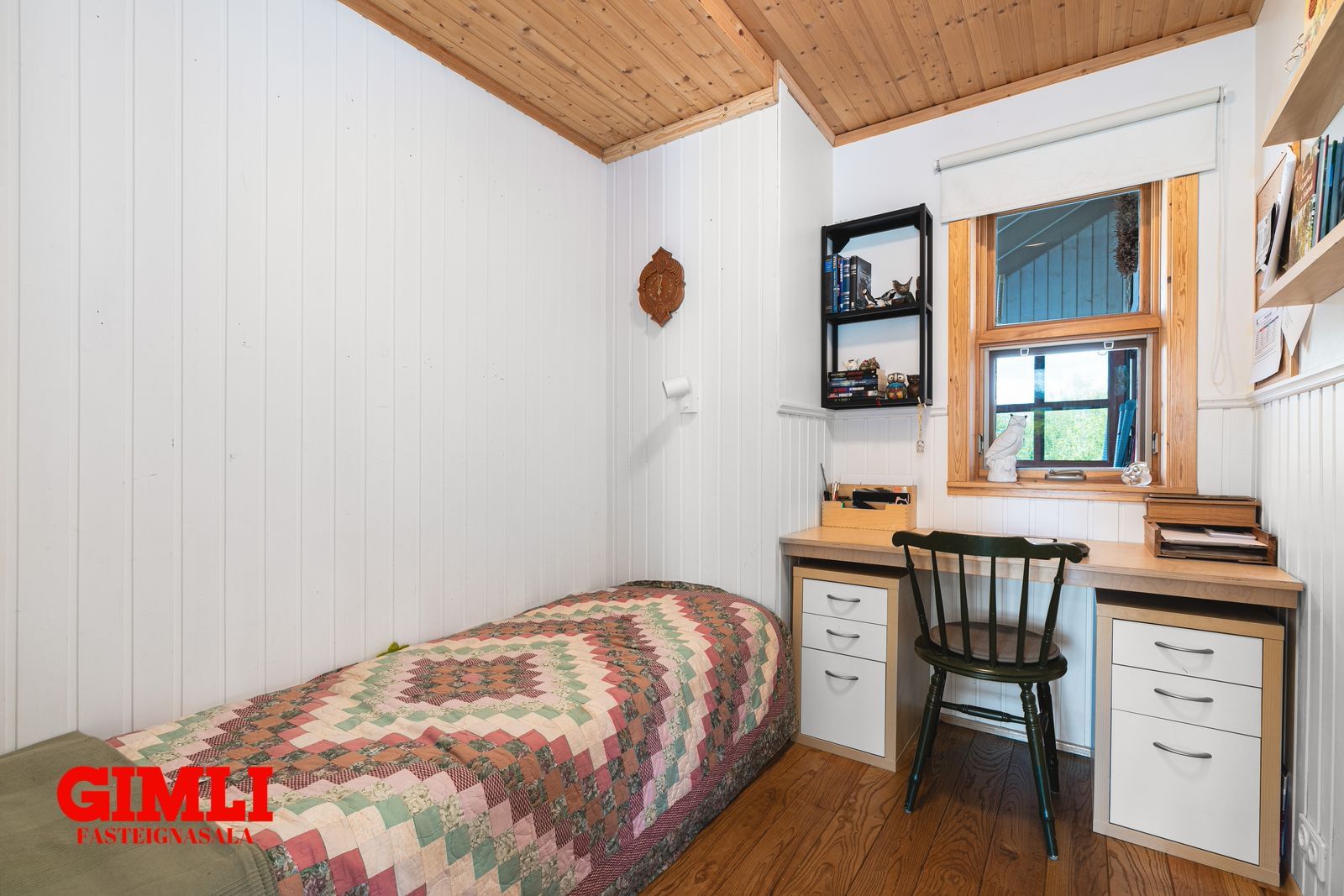 Svefnherbergi III: Gegnheill askur á gólfi, gluggi til norðurs.