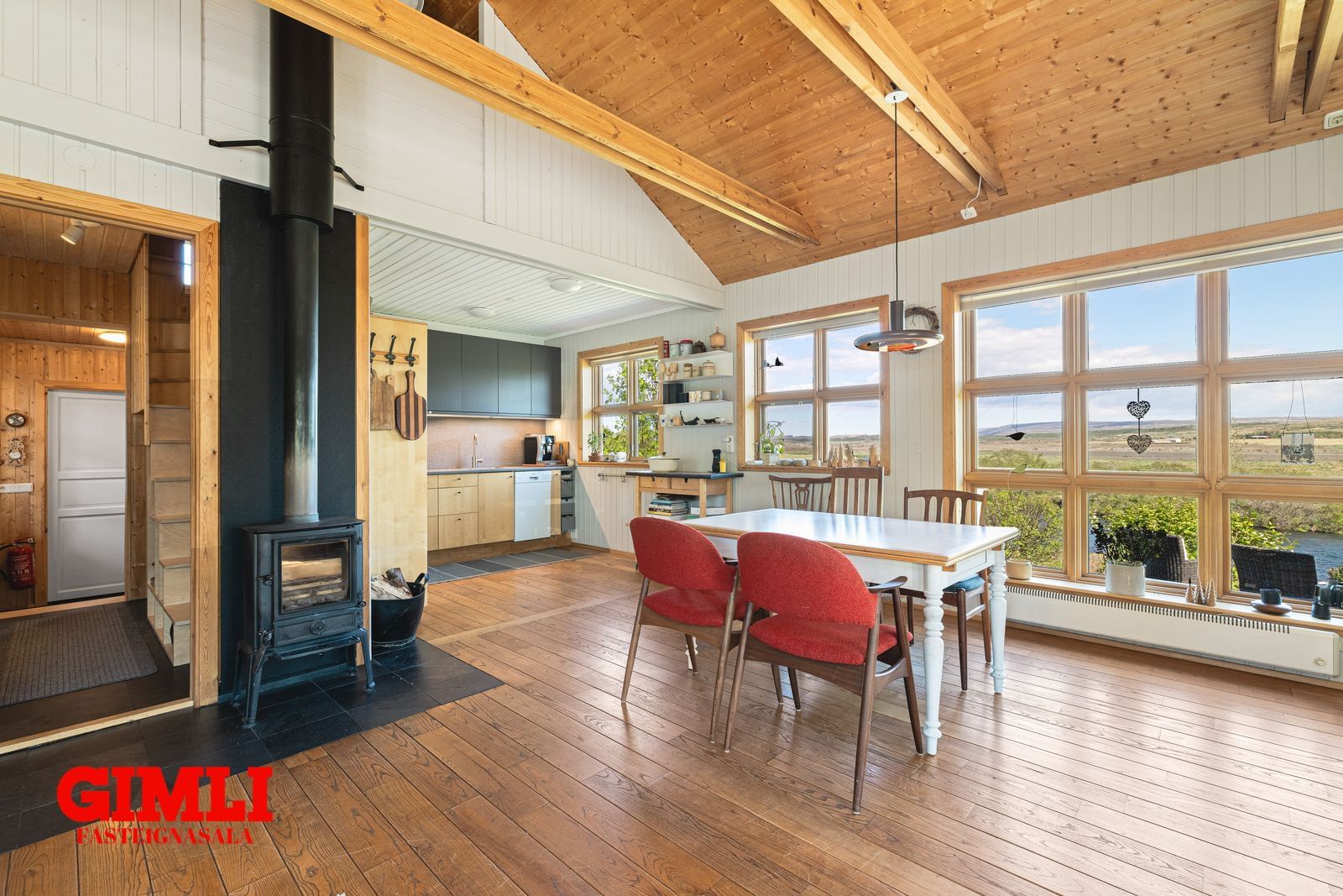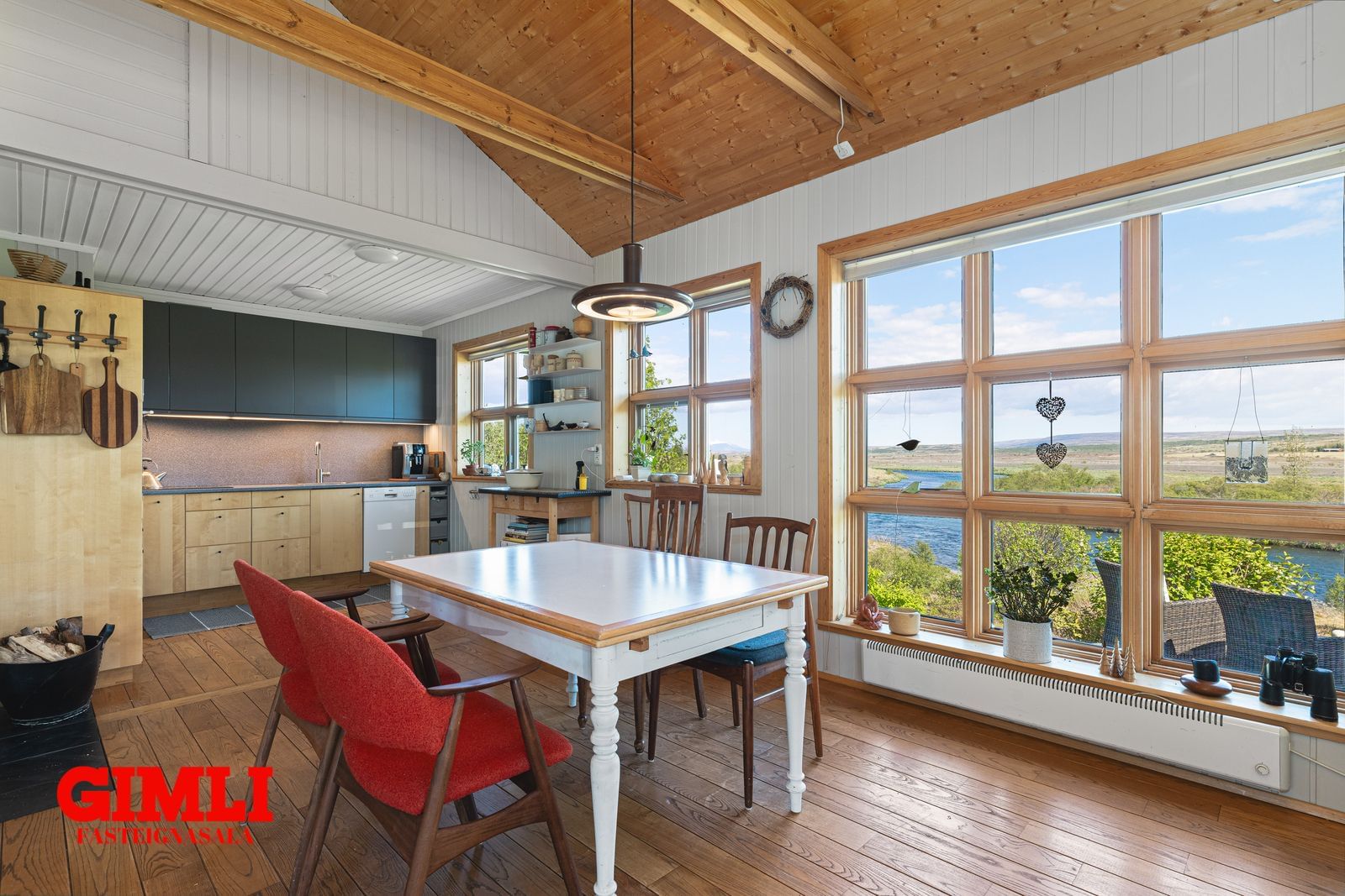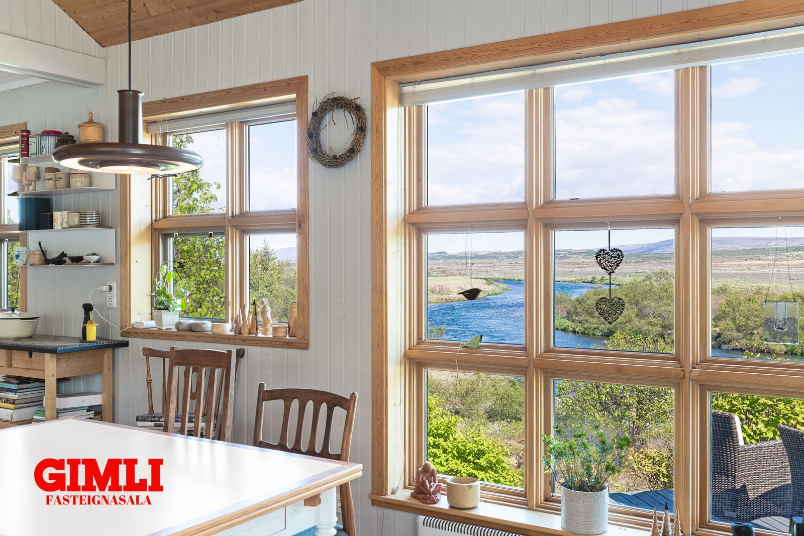 Stofa/borðstofa: Opin, björt og rúmgóð með hurð út á verönd. Glæsilegt útsýni yfir Tungufljót. Mjög góð lofthæð.