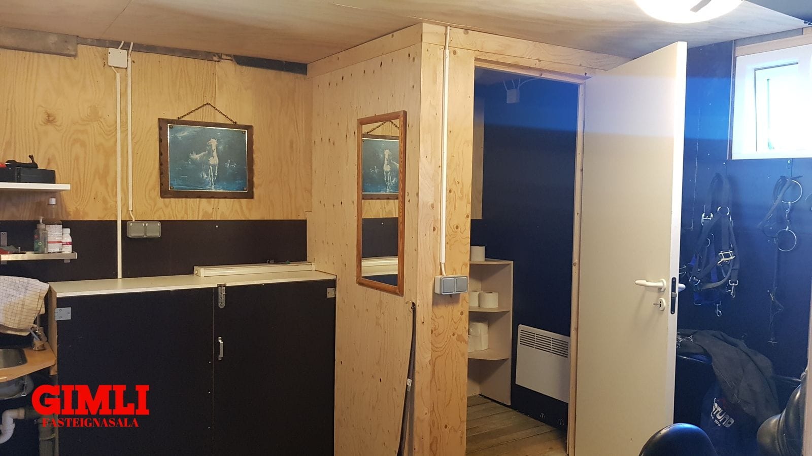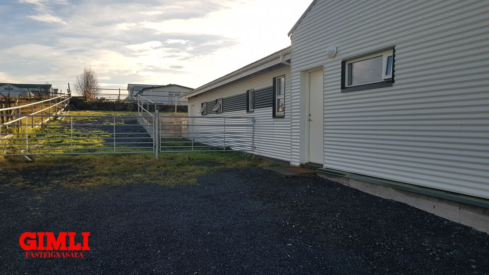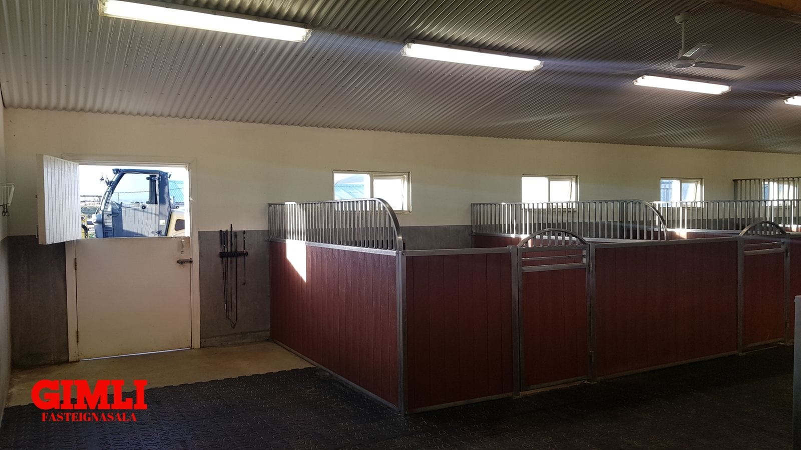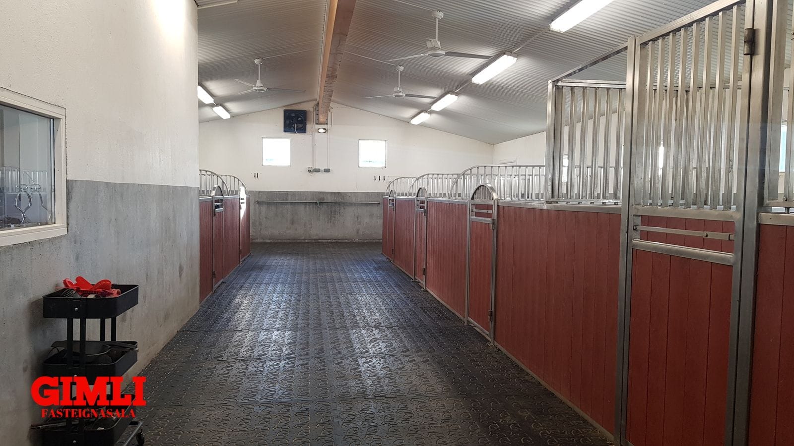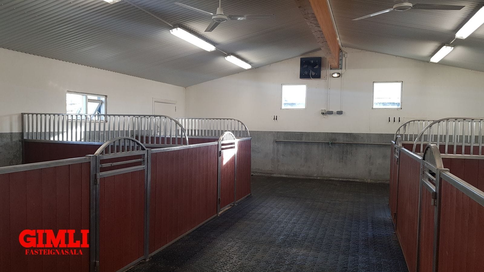 Um er að ræða nýlegt alls 185 fm hús sem er það glæsilegasta á svæðinu og þó víðar væri leitað. Allt mjög rúmgott bæði fyrir hesta og menn. Óvenju glæsileg og rúmgóð inniaðstaða. Húsið rúmar 12 hross og eru allar stíur rúmlega löglegar, þ.e. 5 stk. 9 fm tveggja hesta stíur og ein tveggja hesta graðhestastía. Milliveggir stía með harðplasti og ryðfrítt járnavirki. Hiti er í öllum stíum og eru þær safnstíur með lúgum út í taðkassa. Tvær breiðar tvískiptar hurðir út í stórt sérgerði og eru öll útihlið og rekkverk nýtt galvaniserað. Hlaðan er mjög stór og góð með tvöfaldri hurð og hárri lofthæð. Mjög rúmur gangur við inngang í húsið. Stór og góð hnakkageymsla og snyrting þar við hliðina. Stór og smekkleg kaffistofa með hvítri innréttingu og öllum tækjum,flísalagt gólf og góður borðkrókur og gluggi yfir í hesthúsið.