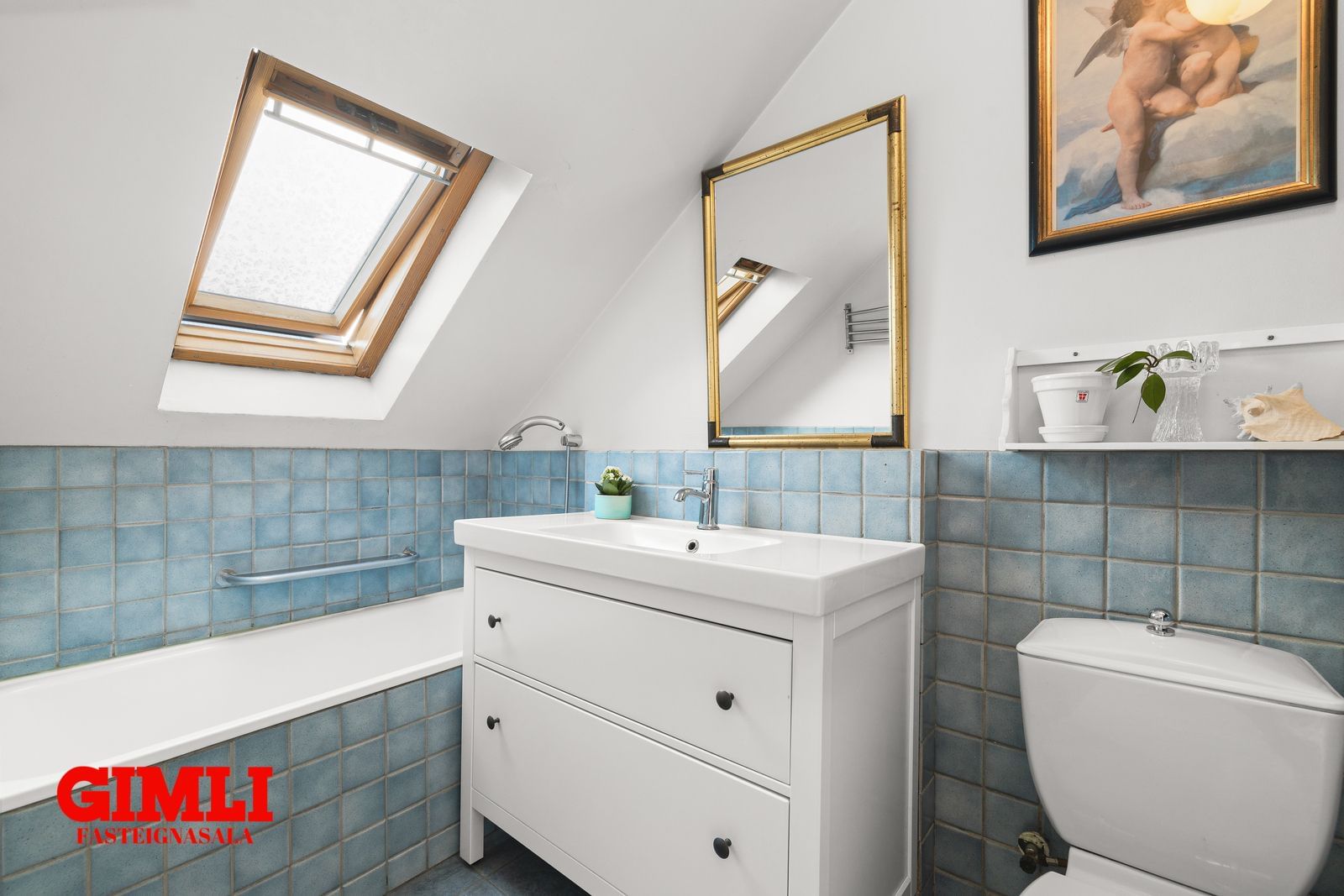 Baðherbergi er með baði og litli innréttingu. Möguleiki er á að stækka það með því að setja kvist til samræmis við hol og eldhús.