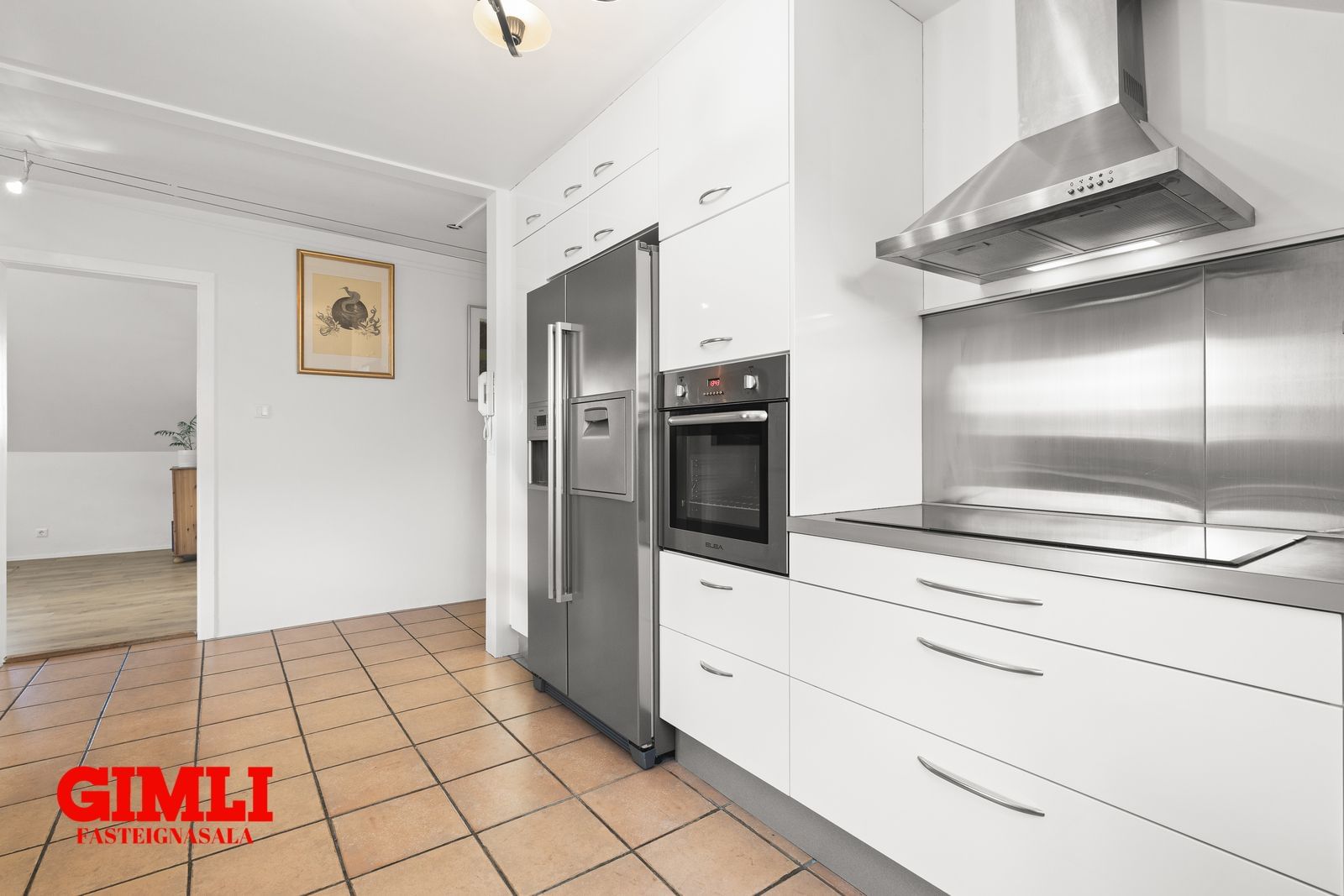 Eldhúsið er fallegt með hvítri rúmgóðri innréttingu, mjög vel skipulagt með stórum vaski og tvöföldum ísskáp sem fylgir með ásamt nýlegri Siemens uppþvottavél. Flísar á gólfi.