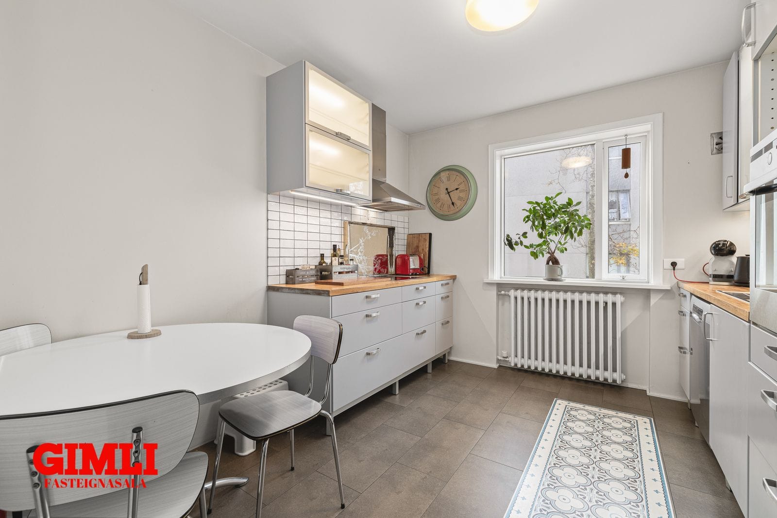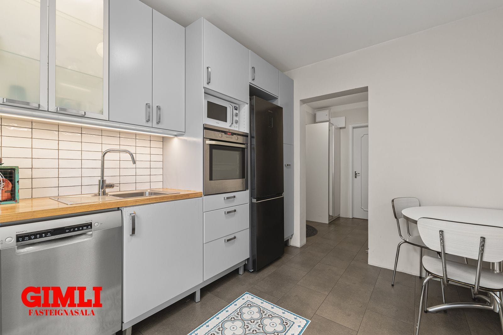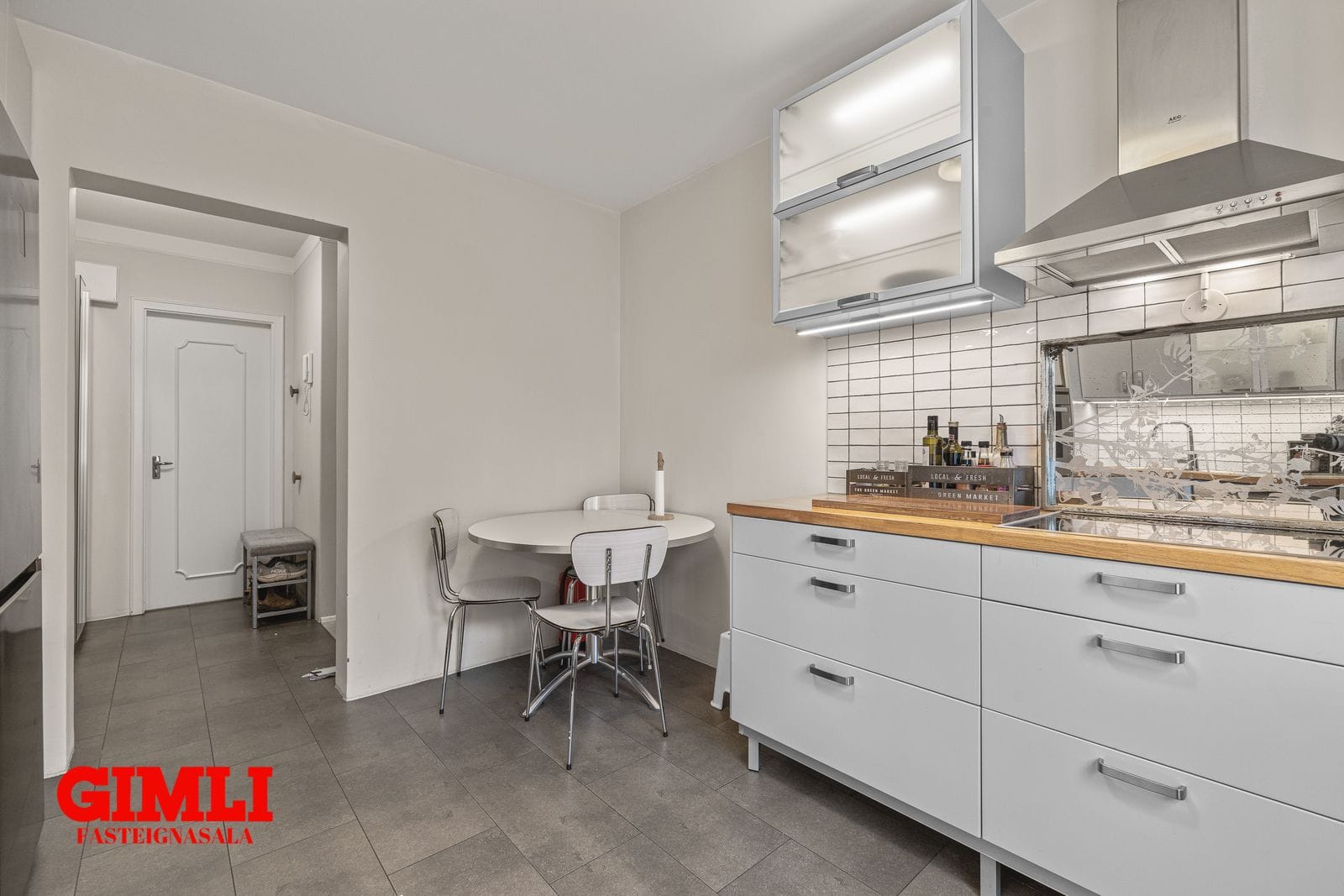 Eldhús með fallegri innréttingu og borðkrók. Flísalagt