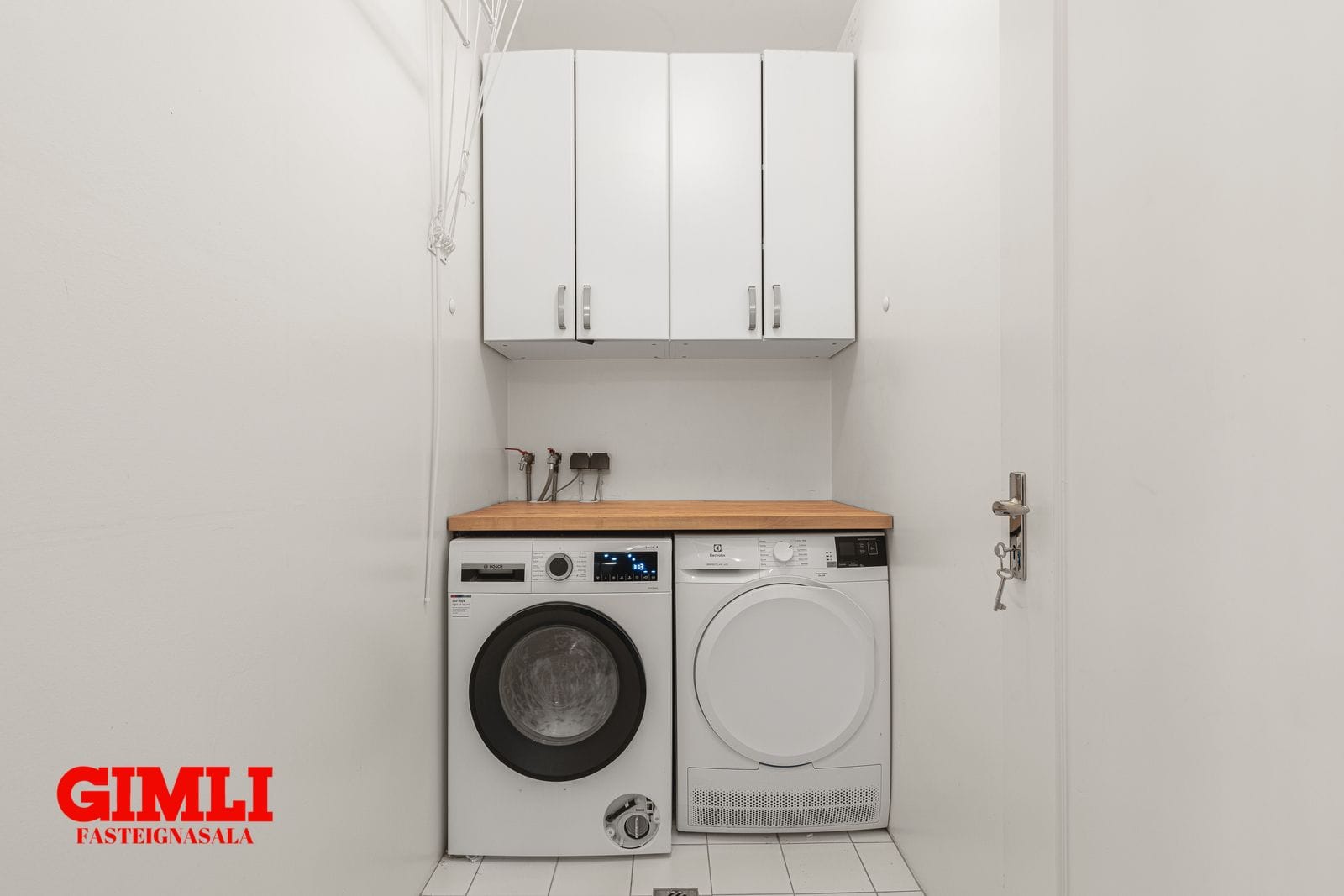 Sérþvottahús er innan íbúðar með innréttingu.