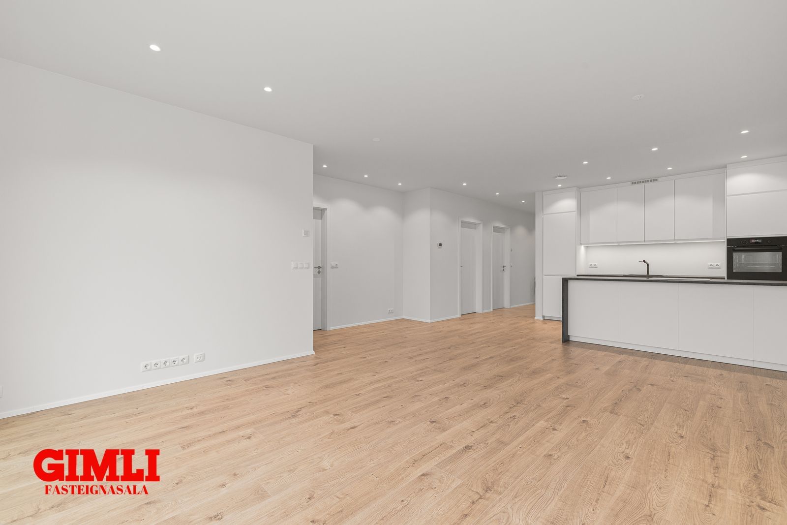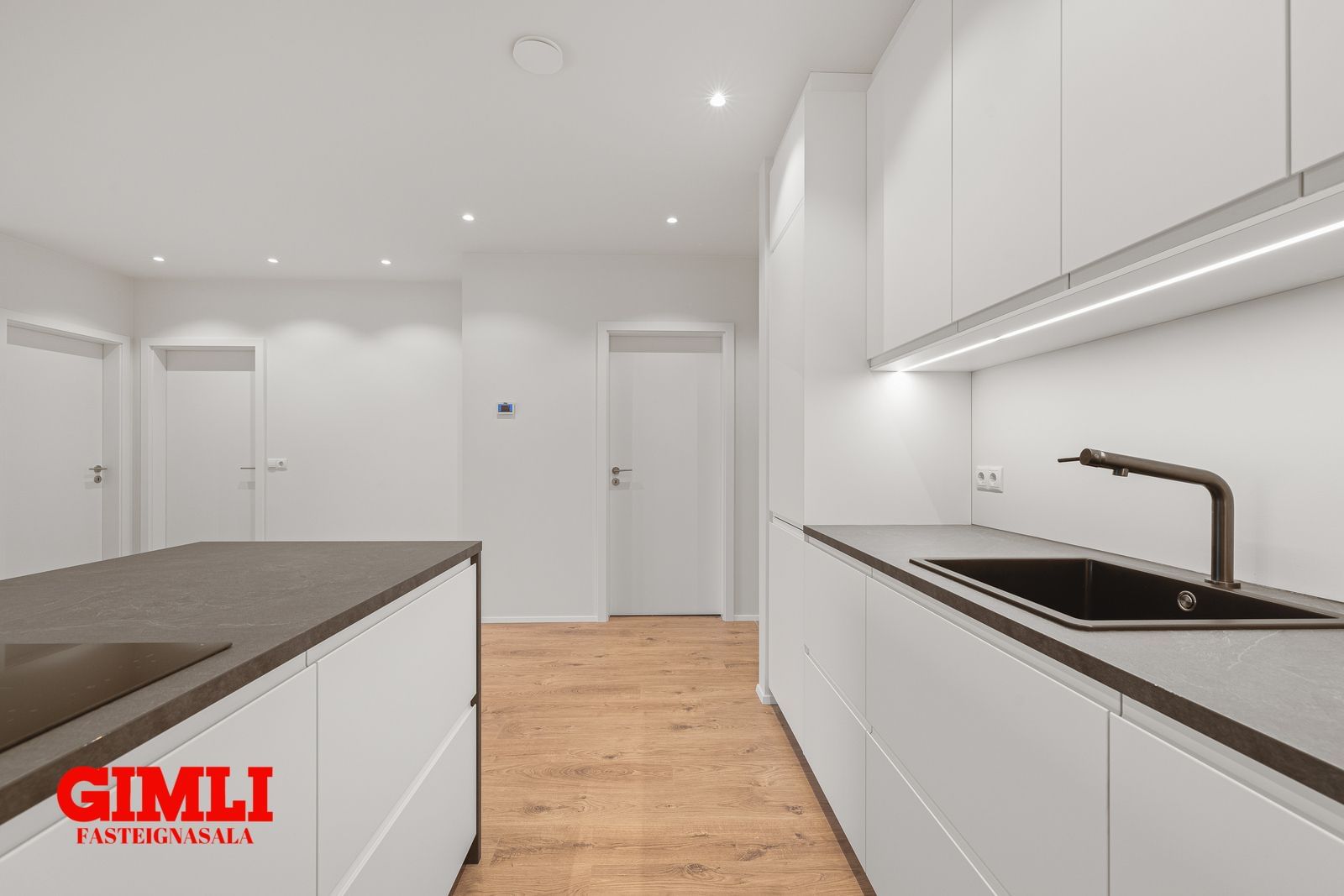 Eldhús: Falleg hvít innrétting með dökkri borðplötu, svörtum vask og blöndunartækjum, bakaraofni í vinnuhæð og spanhelluborð í eyju/tanga sem hægt er að sitja við. Lýsing á milli efri og neðri skápa, innbyggður ísskápur með frysti og innbyggð uppþvottavél. Harðparket á gólfi.