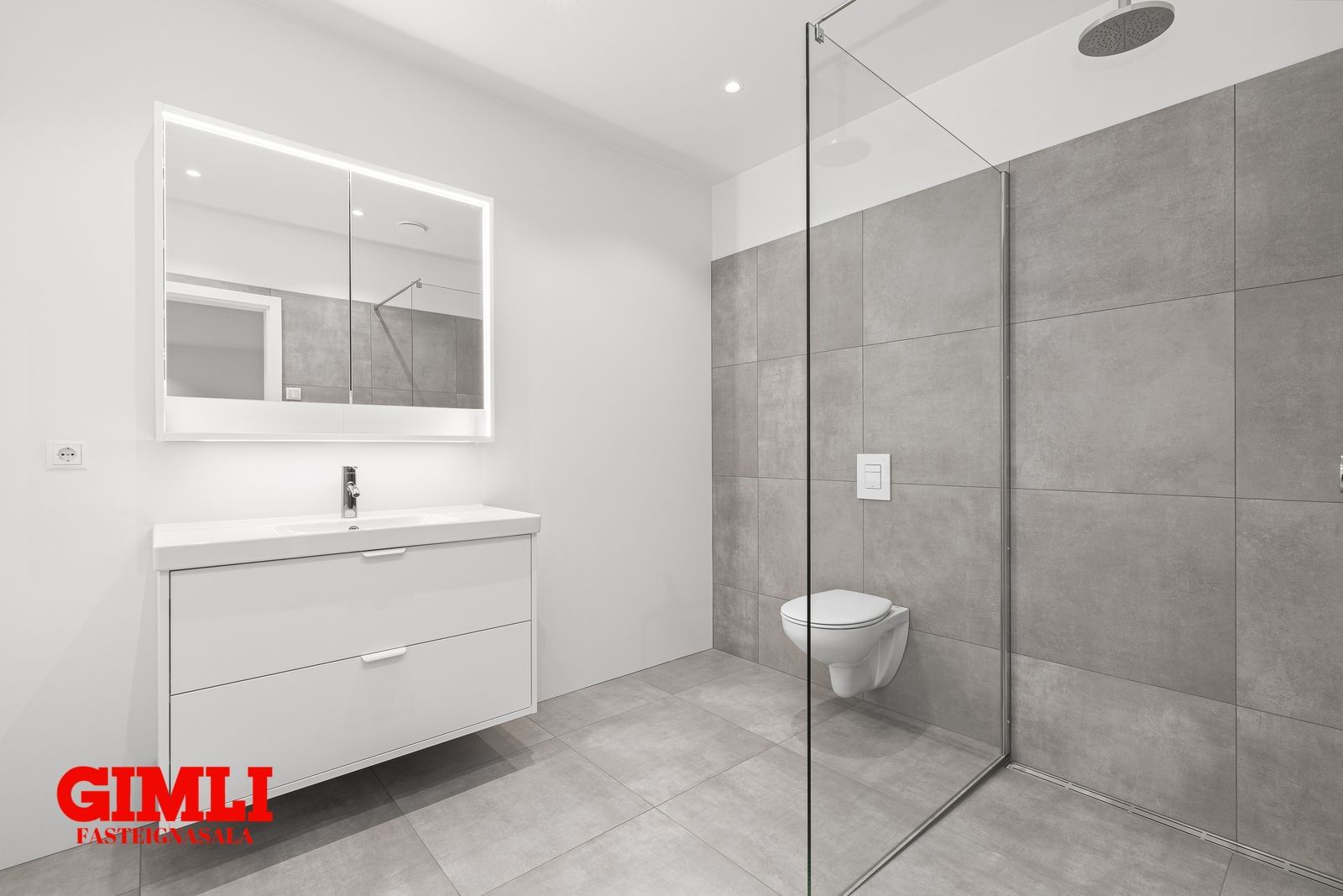 Baðherbergi: með ljósum 60*60 flísum á gólfi ásamt tveimur veggjum, innbyggðu salerni, flísalagðri sturta með glerþili og innbyggðum blöndunartækjum, handklæðaofni og hvítri innréttingu með vaski og speglaskáp með ljósum fyrir ofan.