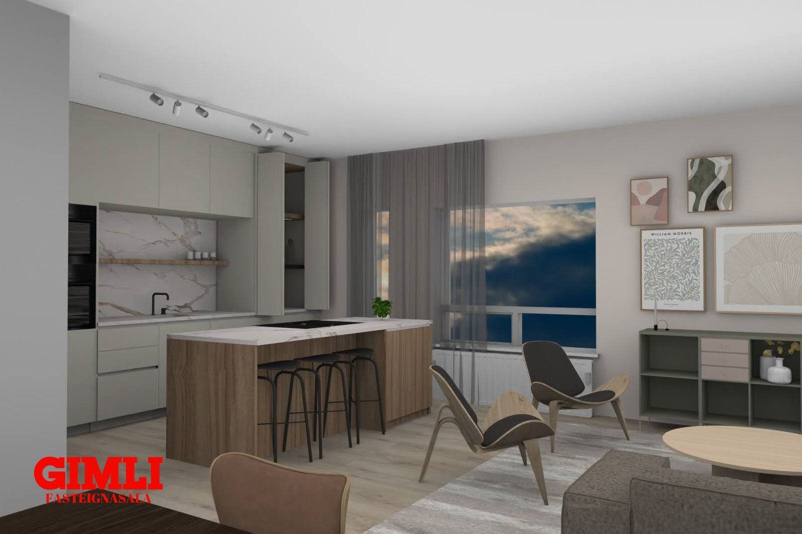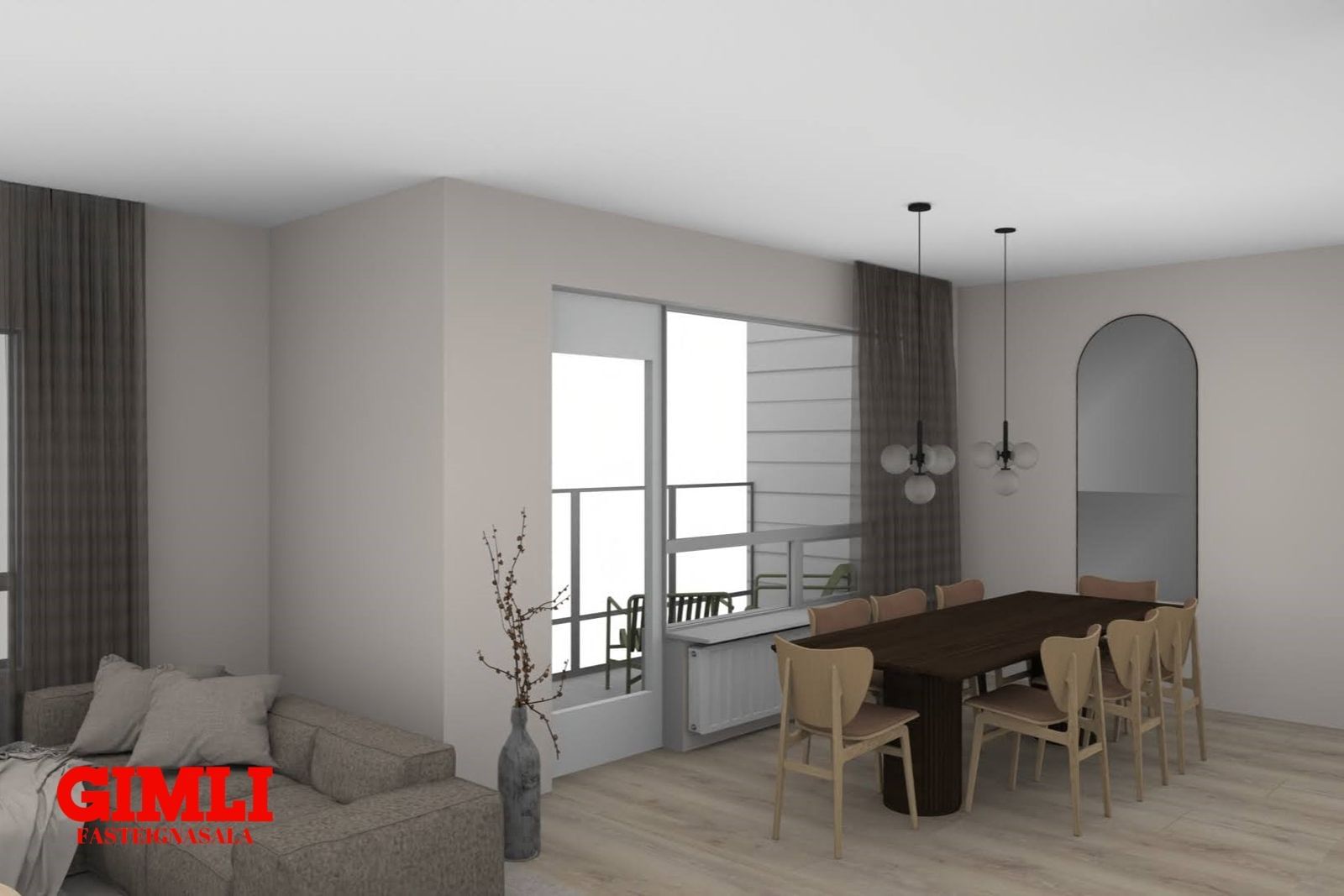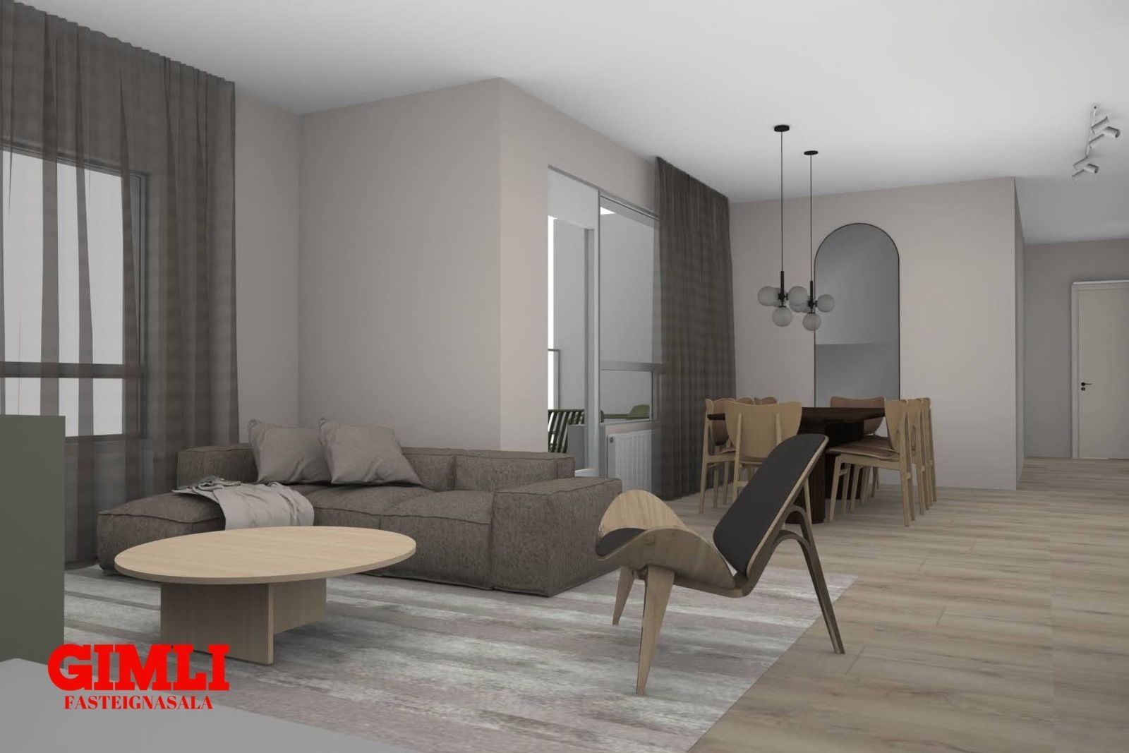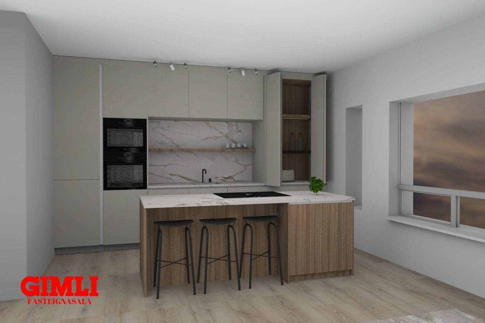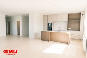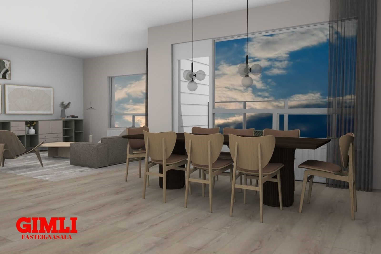 Alrými; Eldhús/Stofa/Borðstofa: Íbúðin er mjög opin og björt, eldhús, stofa og borðstofa flæða vel saman í alrými með útgengi á skjólgóðar svalir. Sérsmíðuð eldhúsinnrétting frá viðurkenndum framleiðanda, UAB Koalos Medis (Litháen). Skápar í eldhúsi ná upp í loft og eru í tvískiptum lit, ljósum beige lit og dökkri viðaráferð. Mjúklokur á skúffum og skápahurðum. Dekton steinn frá REIN á borðum. Spanhelluborð, blástursofn, uppþvottavél og innbyggður ísskápur frá Siemens. Ljóst harðparket á gólfi.