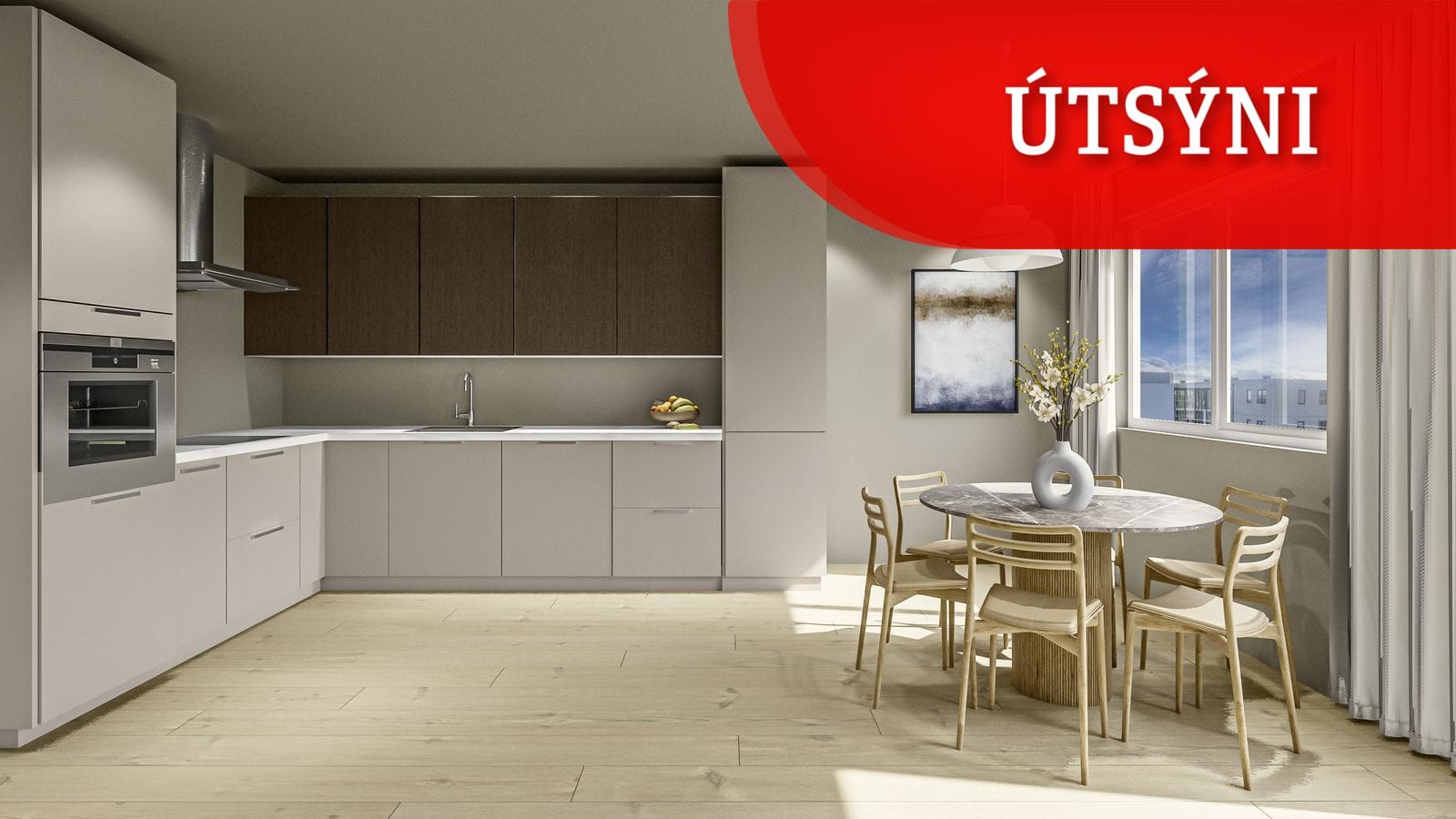 Möguleiki að bæta við þriðja svefnherberginu.Eldhús/stofa: Rúmgott alrými. Eldhúsinnrétting er tvítóna, með dökkri viðaráferð á efri skápum og ljósum neðri skápum. Heimilistæki eru frá Ormsson, helluborð, ofn, háfur og innbyggð uppþvottavél. Úr alrými er útgengi á skjólgóðar svalir með flottu útsýni.