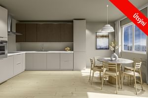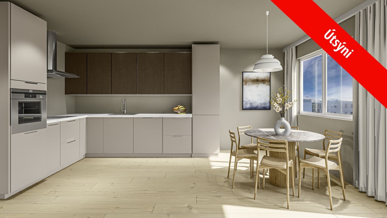 Möguleiki að bæta við þriðja svefnherberginu.Eldhús/stofa: Rúmgott alrými. Eldhúsinnrétting er tvítóna, með dökkri viðaráferð á efri skápum og ljósum neðri skápum. Heimilistæki eru frá Ormsson, helluborð, ofn, háfur, innbyggð uppþvottavél og ísskápur. Úr alrými er útgengi á skjólgóðar svalir með flottu útsýni.