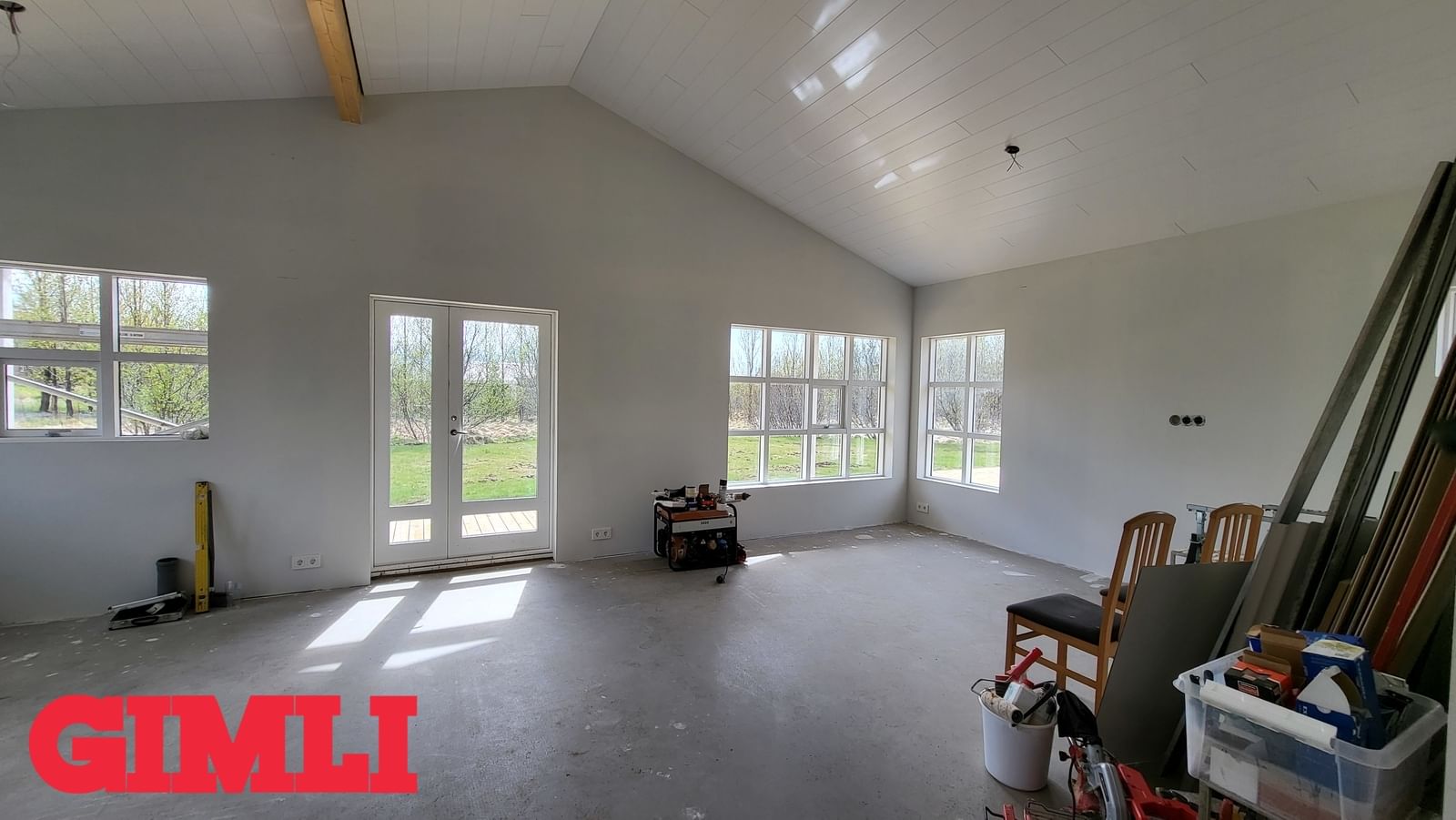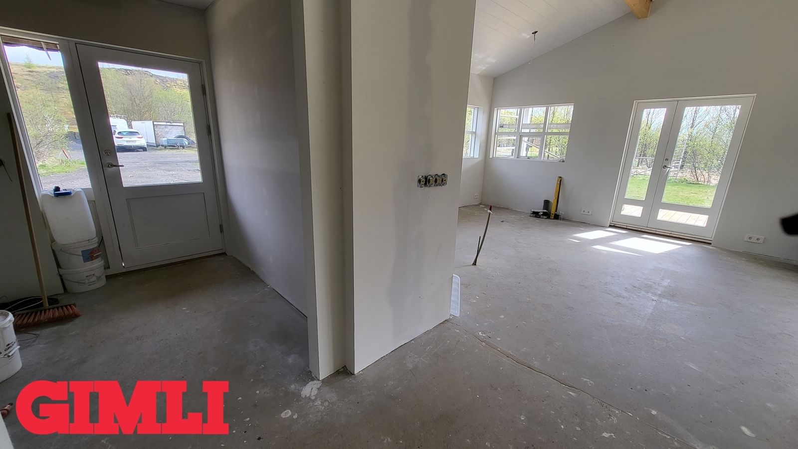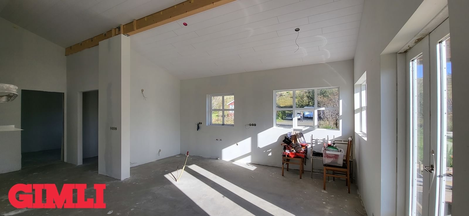 Mikil lofthæð er í húsinu. Steypt plata með frágengnum hitalögnum. Inntakskassi frágenginn. Rotþró tengd og frágenginl. Loft hússins klædd. Allir innveggir komnir með tvöföldu gipsi. Rafmagnstafla frágengin svo og allt rafmagn ídregið með rofum og tenglum.