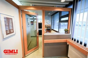 Móttaka með hurð og gler skilrúmi