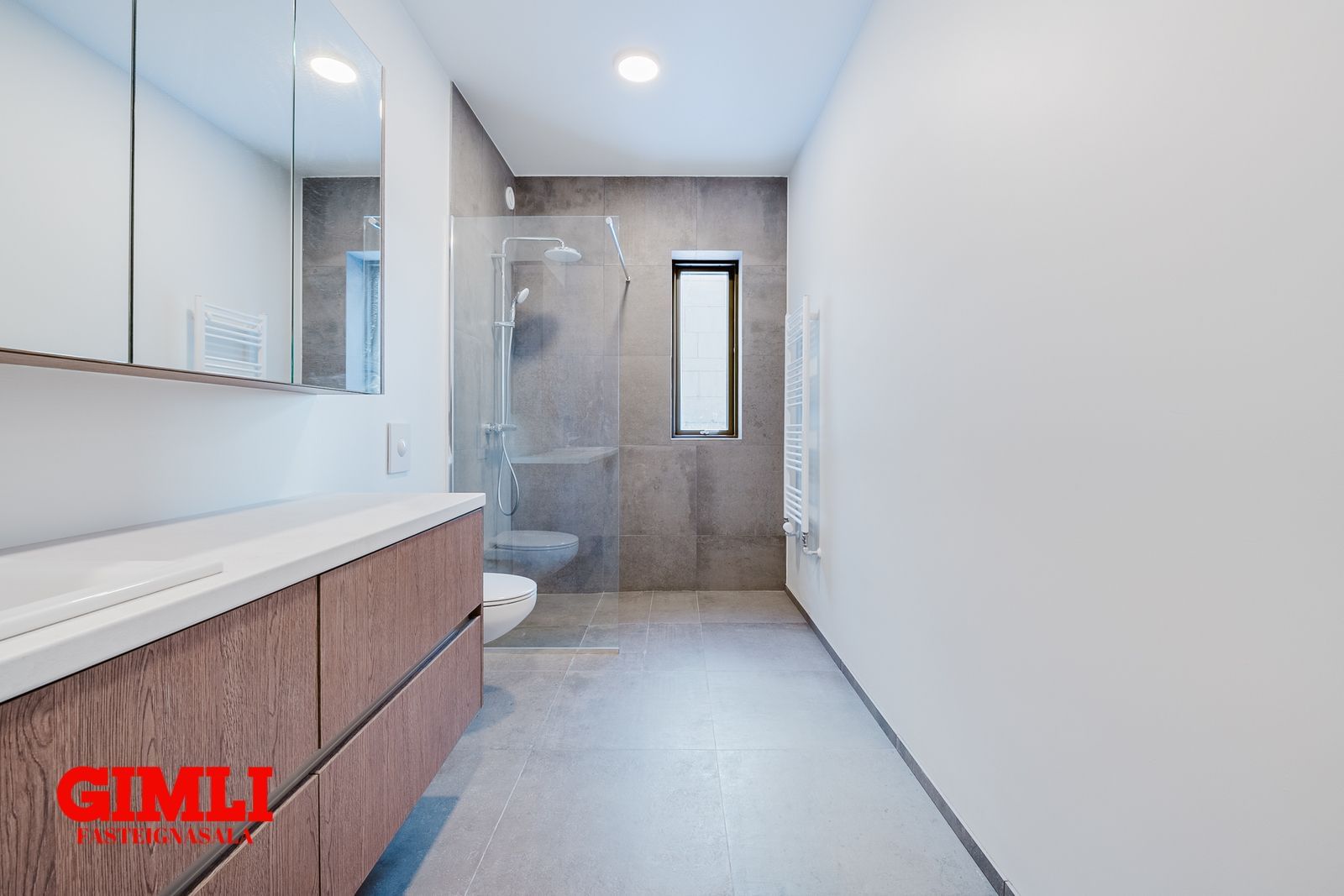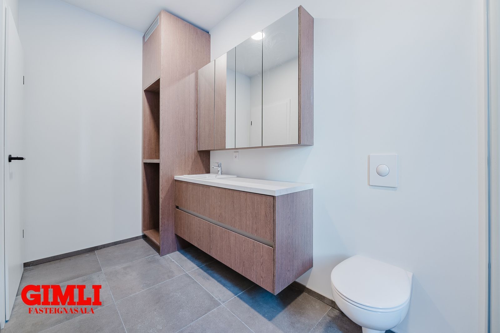 Baðherbergi: Flísalögð "walk in" sturta með glerþili. Vegghengt salerni, sérsmíðaðuð innrétting með handlaug og speglaskáp. Innrétting og tengingar fyrir þvottavél og þurrkara. Ljósar 60x60 flísar á gólfi og sturtu. Handklæðaofn.
