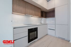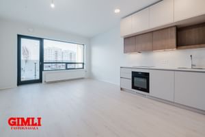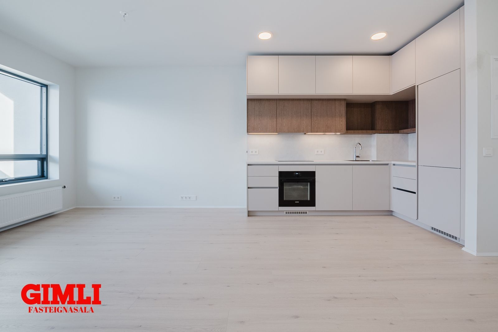 Alrými; Eldhús/Stofa/Borðstofa: Íbúðin er mjög opin og björt, eldhús, stofa og borðstofa flæða vel saman í alrými með útgengi á skjólgóðar svalir. Sérsmíðuð eldhúsinnrétting frá viðurkenndum framleiðanda, UAB Koalos Medis (Litháen). Skápar í eldhúsi ná upp í loft og eru í ljósum beige lit. Efri skápar með viðaráferð. Mjúklokur á skúffum og skápahurðum. Spanhelluborð, blástursofn, uppþvottavél og innbyggður ísskápur frá Siemens. Ljóst harðparket á gólfi.