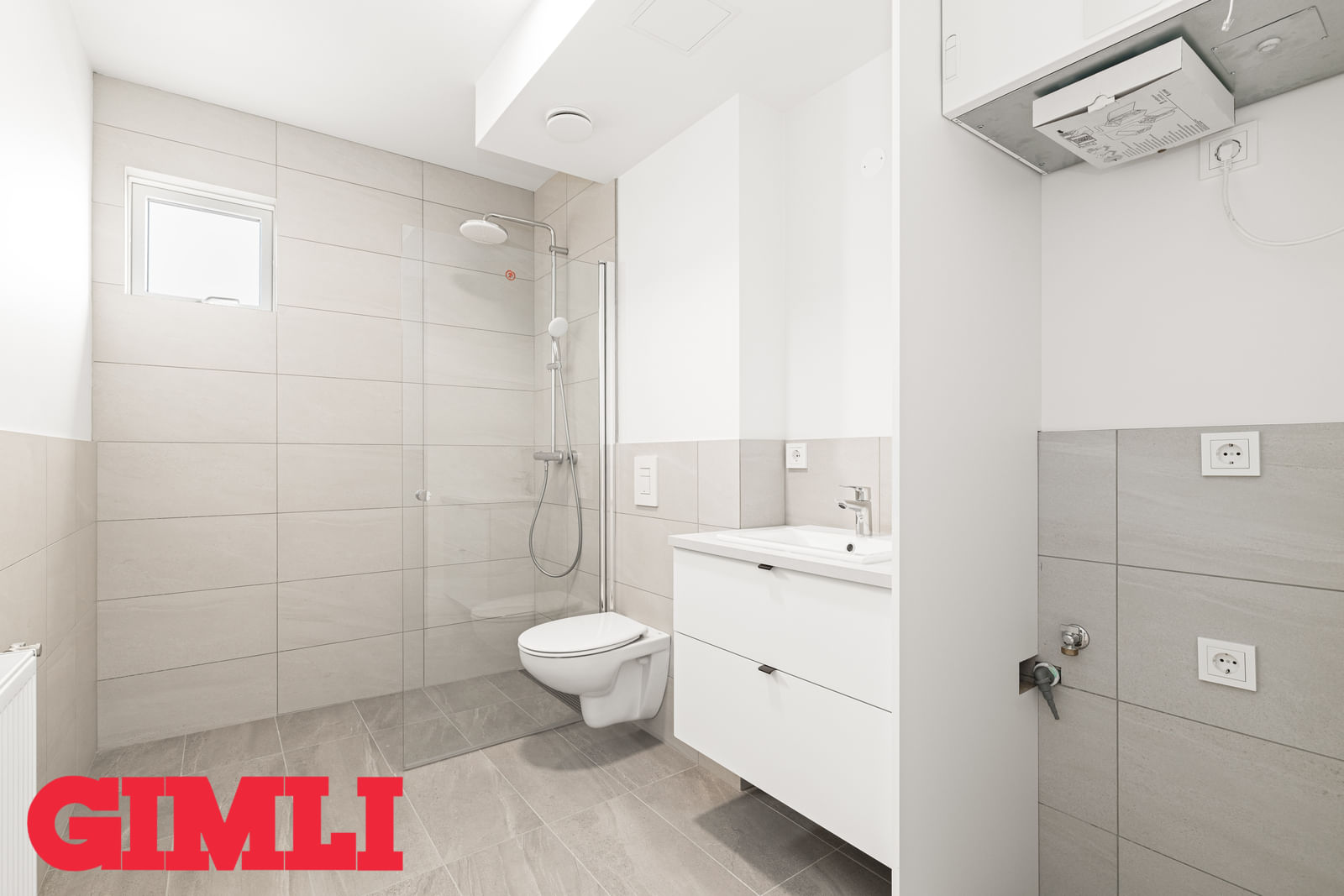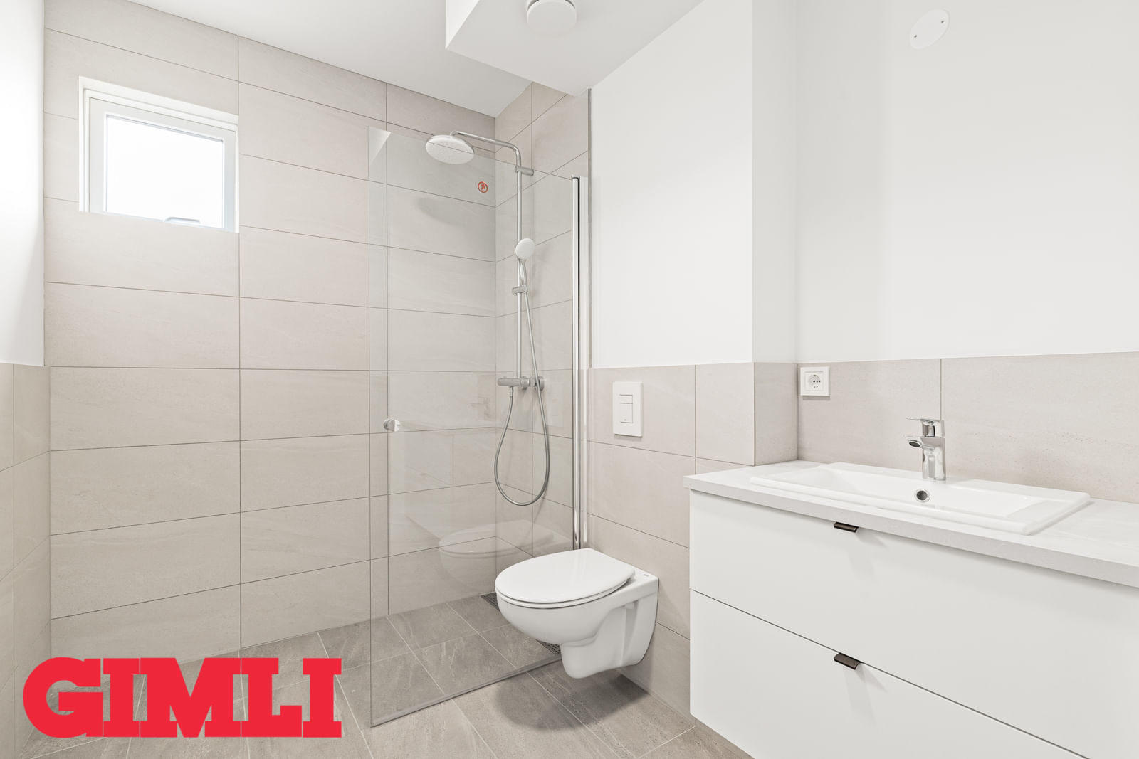 Baðherbergi: rúmgott. Vaskur í hvítri innréttingu, vegghengt salerni og WI-sturta, gluggi og ræstikerfi??? Aðstaða fyrir þvottavél/þurrkara. Flísalagt gólf og veggir að hluta.